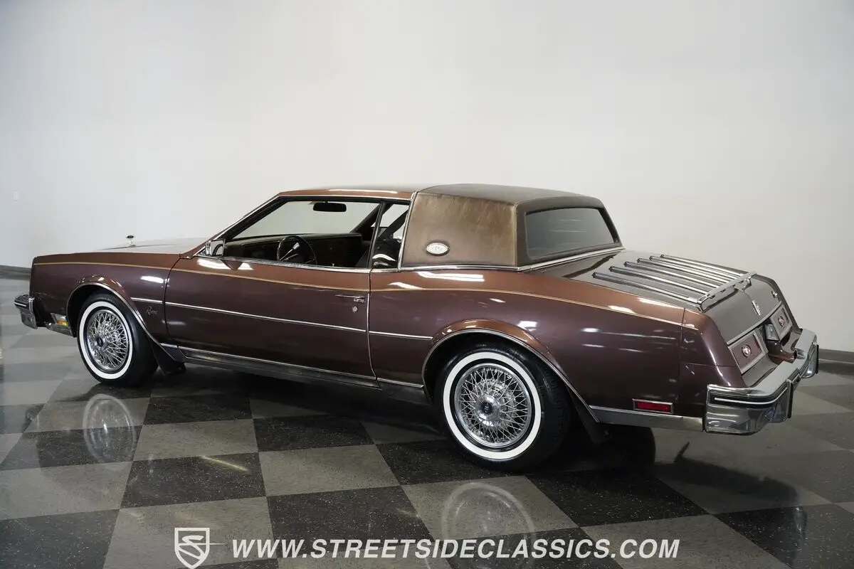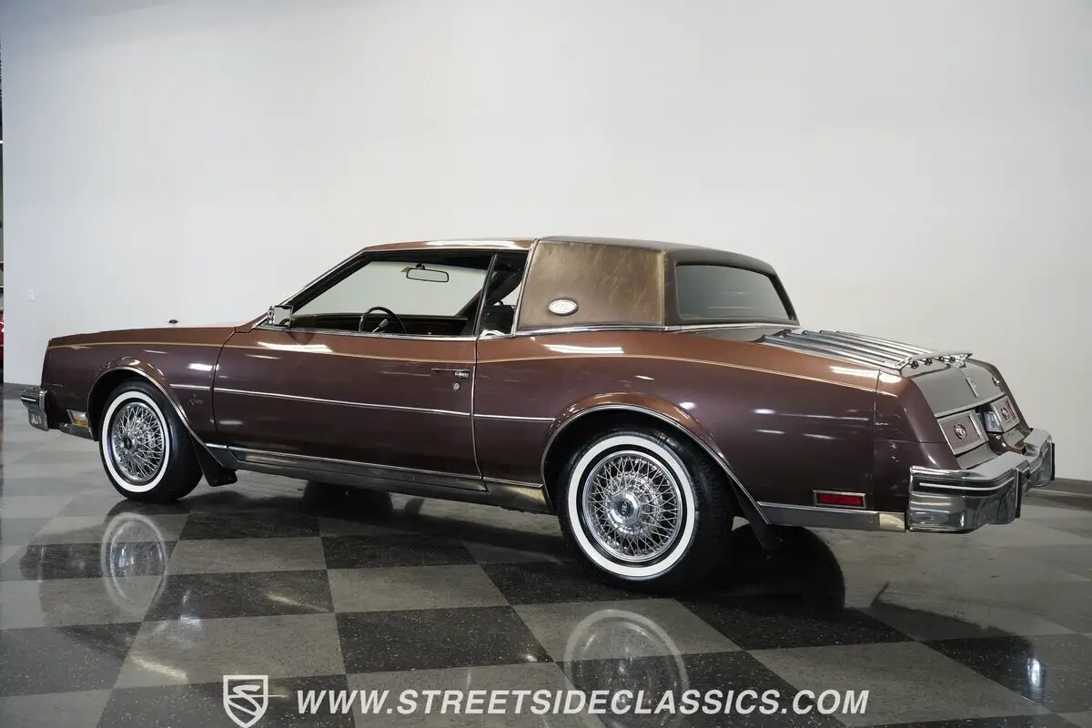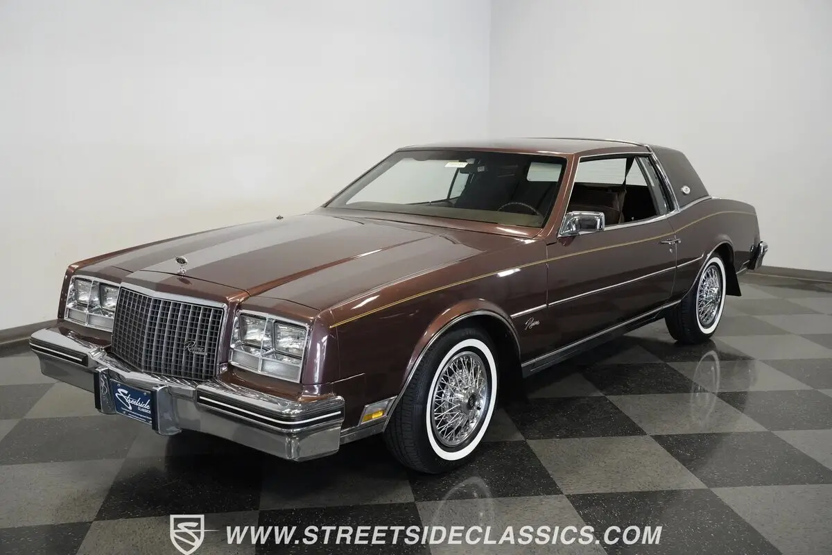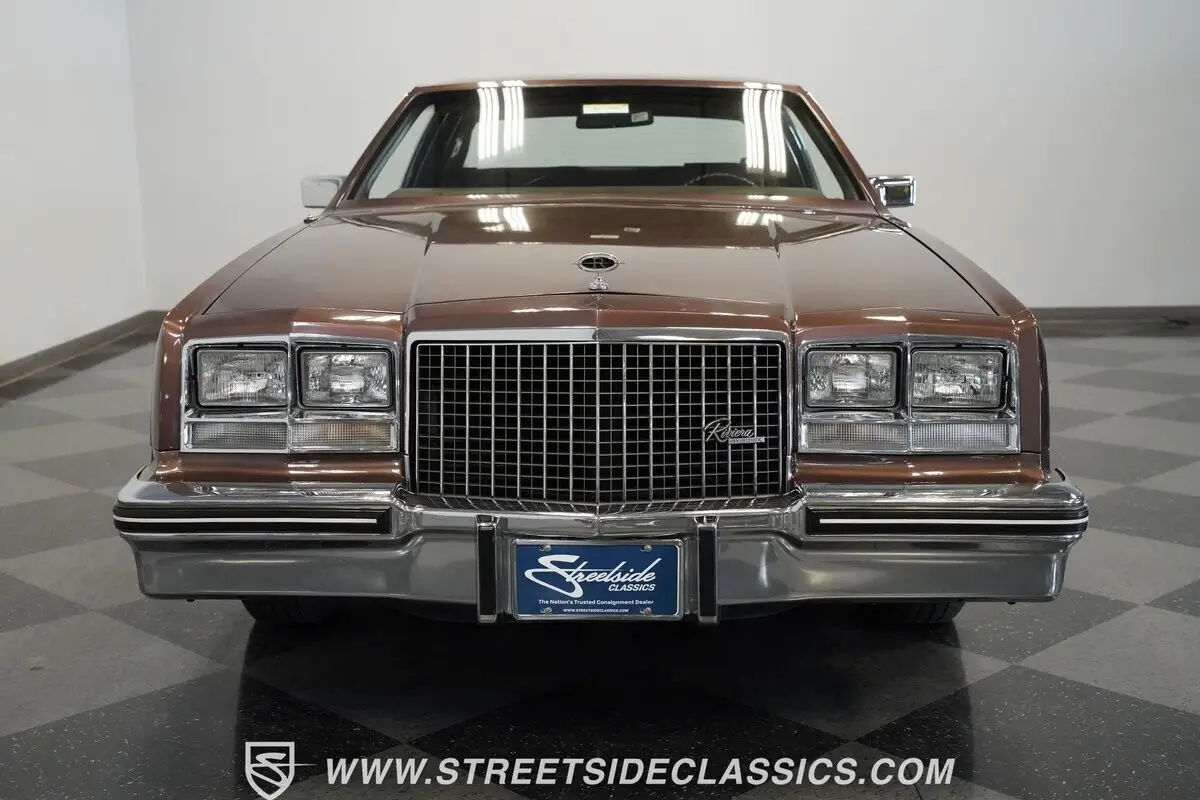 Finished in brown with a matching brown vinyl top, this 1983 Buick Riviera carries its factory styling with clean proportions and crisp detailing. Chrome trim outlines the grille, bumpers, and window surrounds, tying the look together without distraction. It sits on 15-inch steel wheels with wire wheel covers, wrapped in 215/75R15 whitewall tires that complete the original appearance. Every line stays true to the Riviera's design language-confident, composed, and unmistakably Buick.