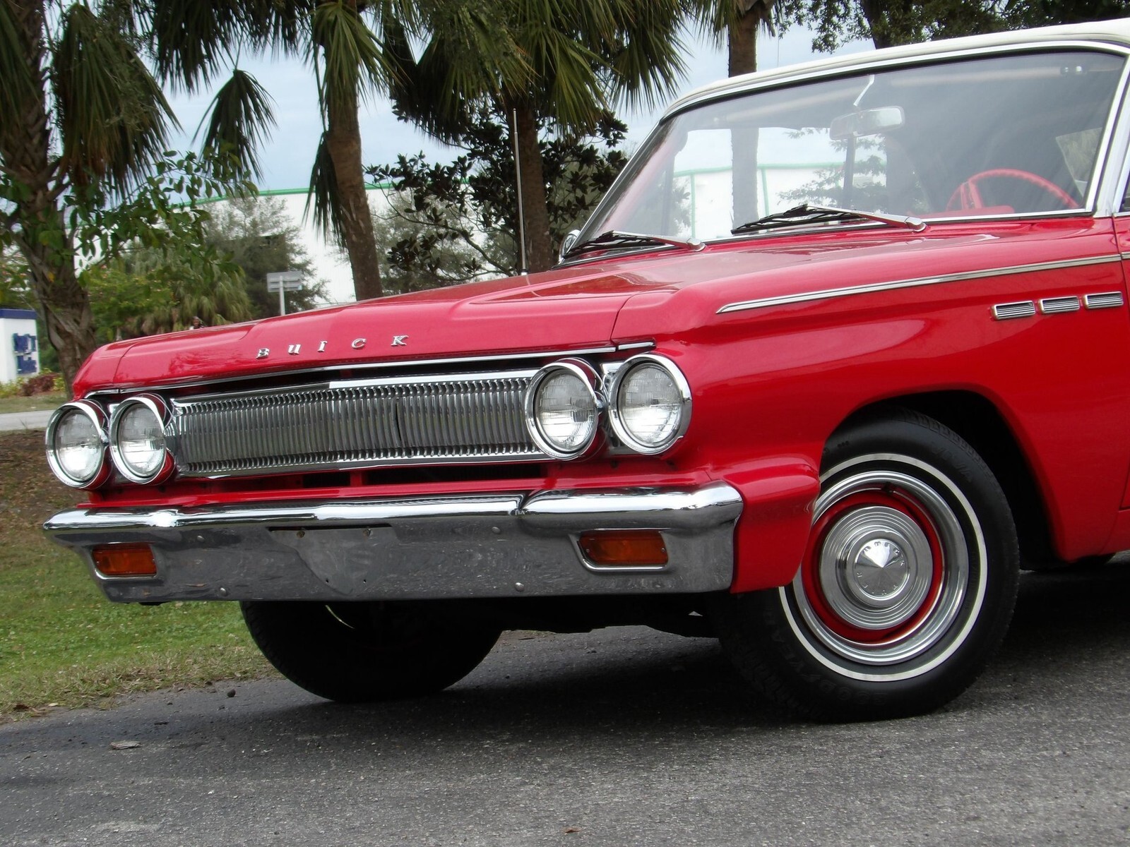 The body is nice and straight, the bright red paint shines like glass.Goodyear white-lined tires with original Buick wheels and center caps along with a clean white convertible top complete the classy yet sporty look of the car.