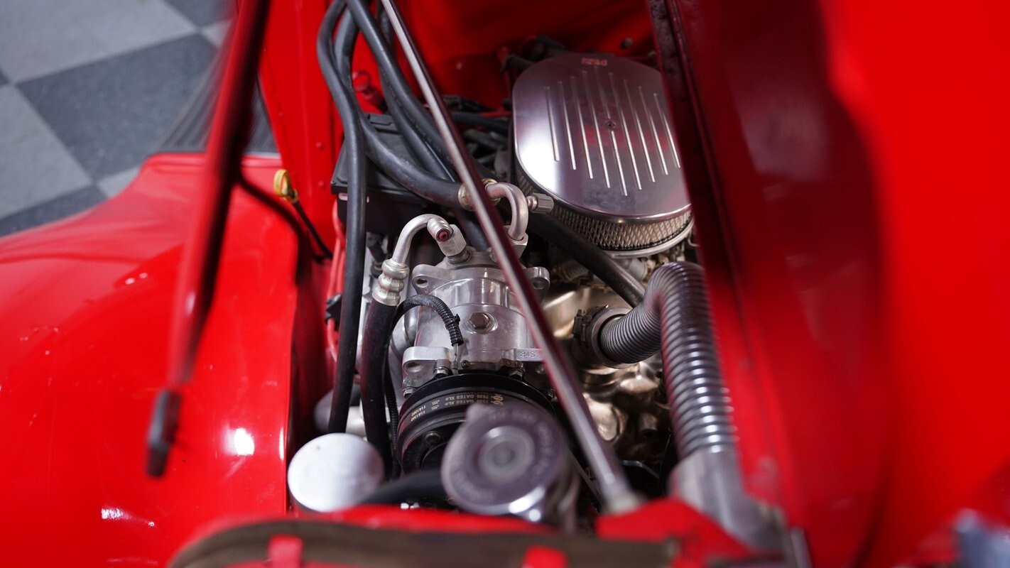 The interior has been restored very well in a mostly tan color that pairs great with the red exterior color. The door panels, leather seats, and dashboard are all in good shape, as are the carpet and headliner. A custom billet steering wheel with a tan rim is a nice touch and looks perfect with the chrome steering column. The black gauge cluster features a set of elegant, vintage-style Amperes gauges that perfectly match the interior's theme. Off to the right is a Pioneer head unit with AM/FM/CD/Aux and Bluetooth radio. Next to that appears to be an original-looking set of heat and A/C controls, and in front of that on the floor is a custom floor shifter.