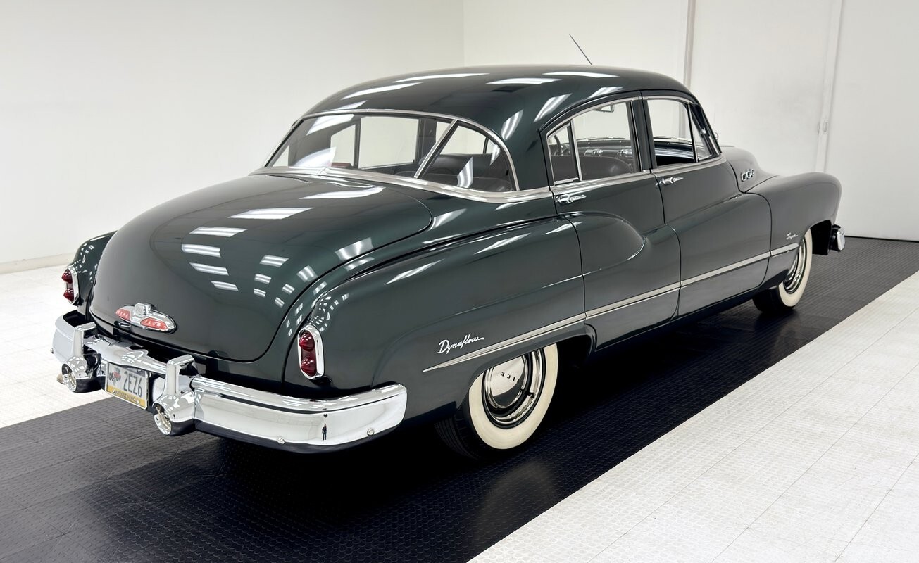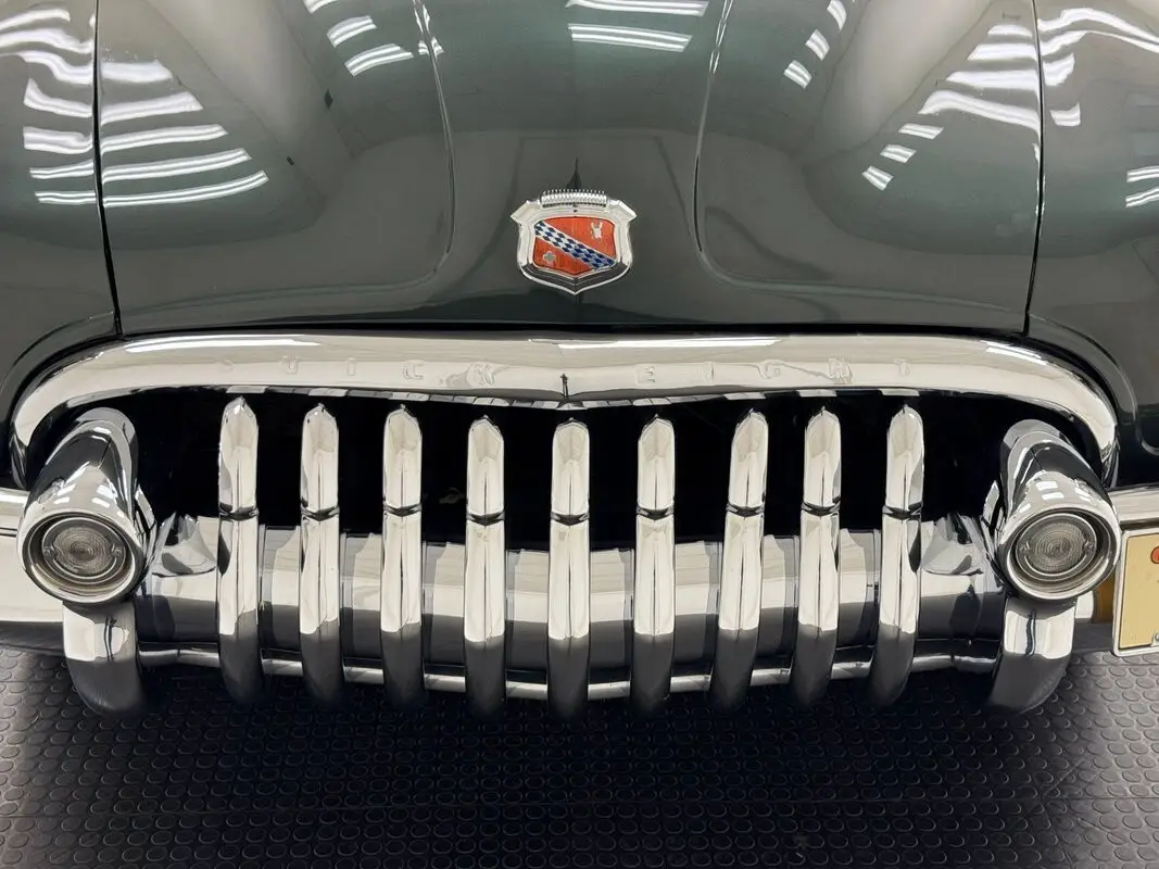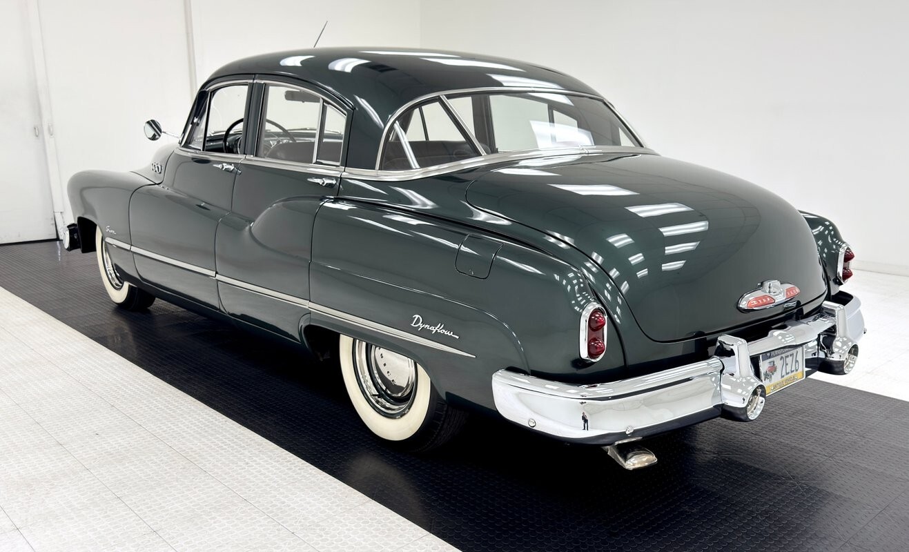 The most prominent feature in this and all the cars in the 1950 Buick line is the grille and front bumper, a massive, protruding, gaping array of chrome bars and vertical tusks that create a stylish and somewhat aggressive front end that has cattle shaking in their hooves. From there, the long hood rises over flat topped fenders and takes a trio of ventiports with it while the fender becomes the body line that lifts to form the rear fender. Allendale Green is the color here, one of an astounding seven different greens available in 1950 and it adorns the 15-inch steel wheels dressed up with beauty rings and Buick hubcaps. Diminutive tail lights ride the massive rear of the car with a dome shaped decklid behind a sporty 3 part rear window. Paint, trim, chrome, and emblems on the car are nice with imperfections limited to a few bubbles and lifted paint in the curve, and some uneven filler.