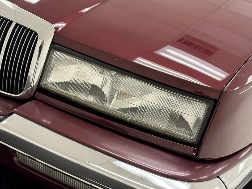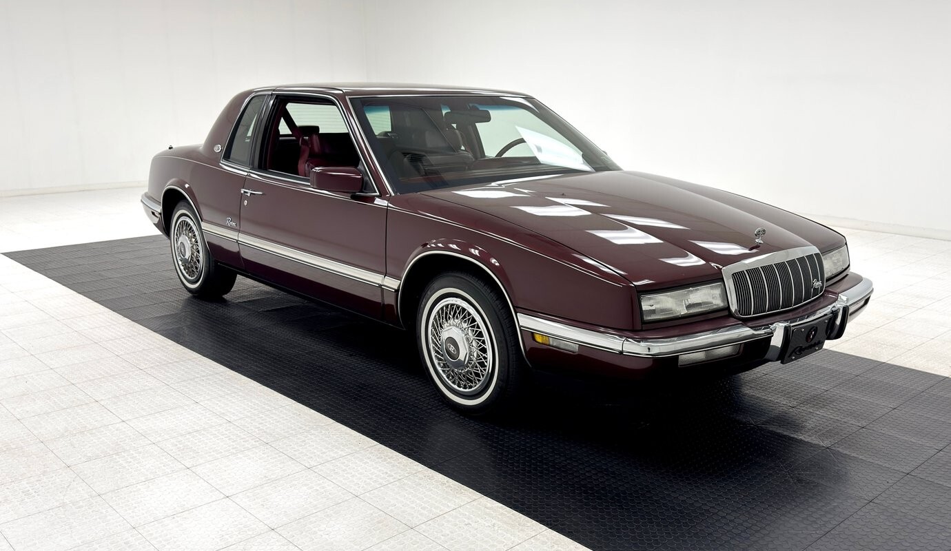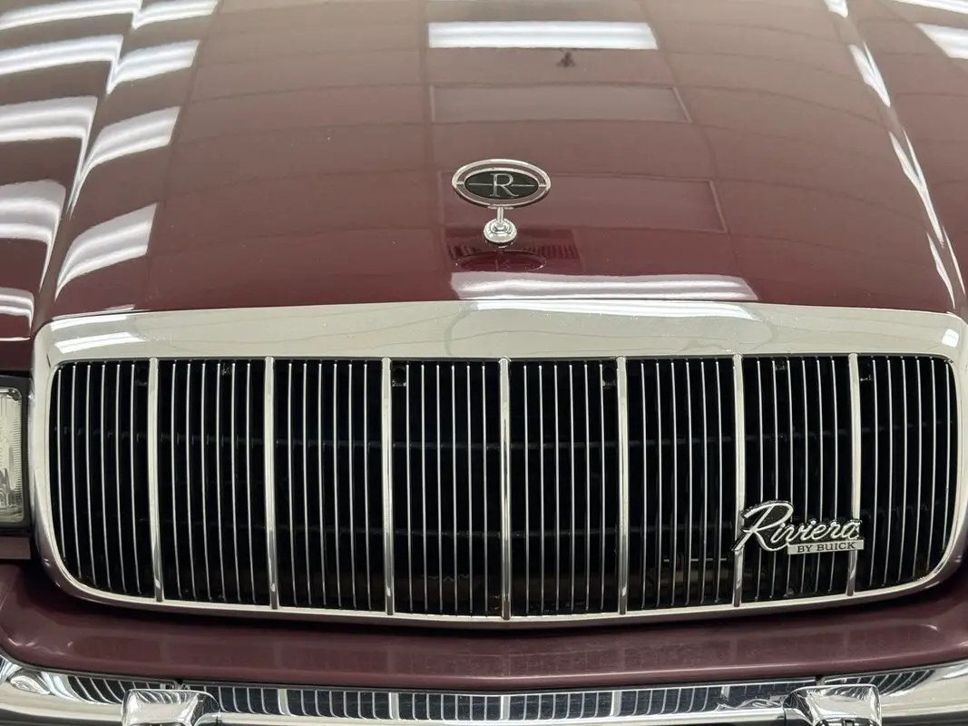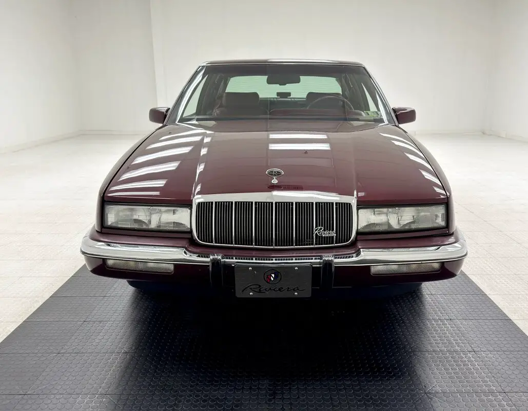 Like a bottle of Merlot, this Claret Red paint has aged well and retains much of its factory shine. This seventh generation Riviera has composite headlights for the first time, giving the car a slightly European profile, augmented by the