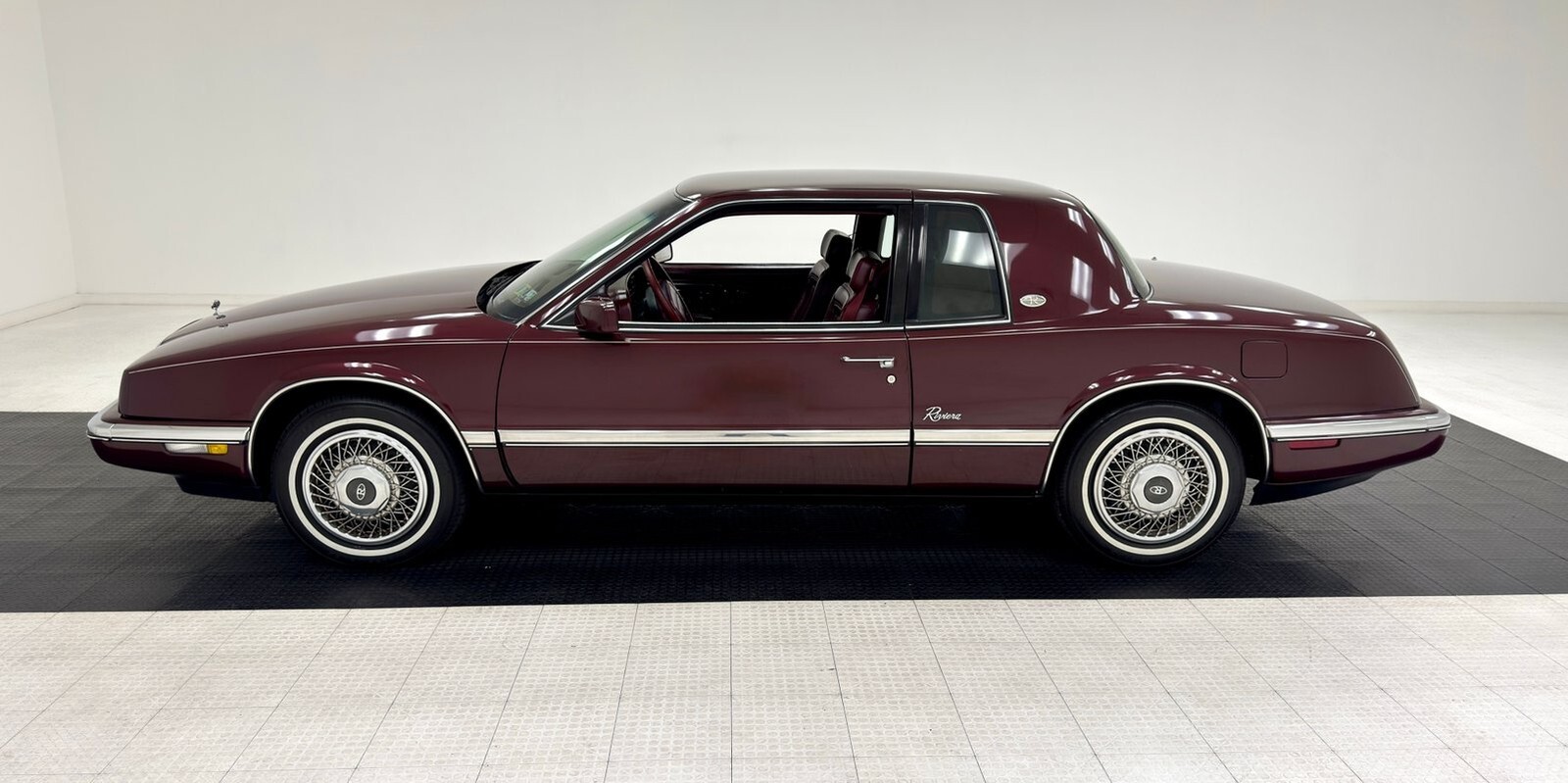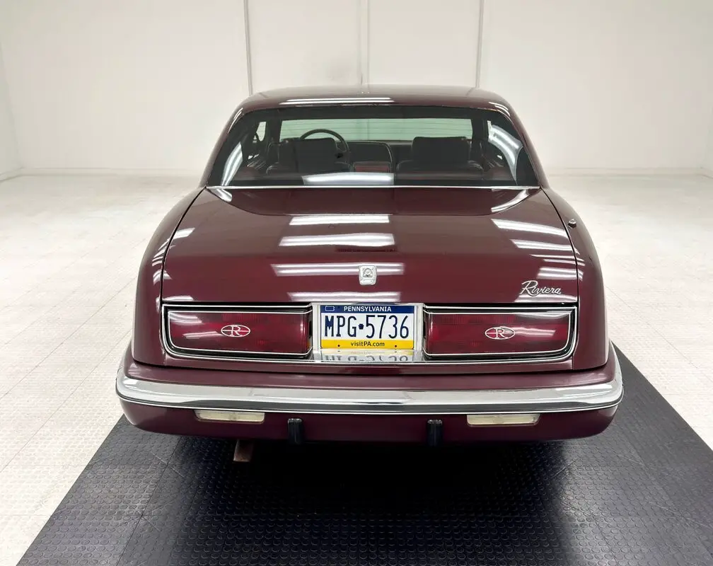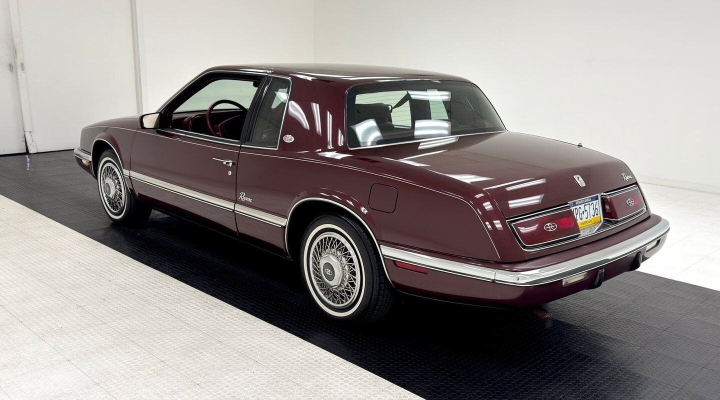 Like a bottle of Merlot, this Claret Red paint has aged well and retains much of its factory shine. This seventh generation Riviera has composite headlights for the first time, giving the car a slightly European profile, augmented by the
