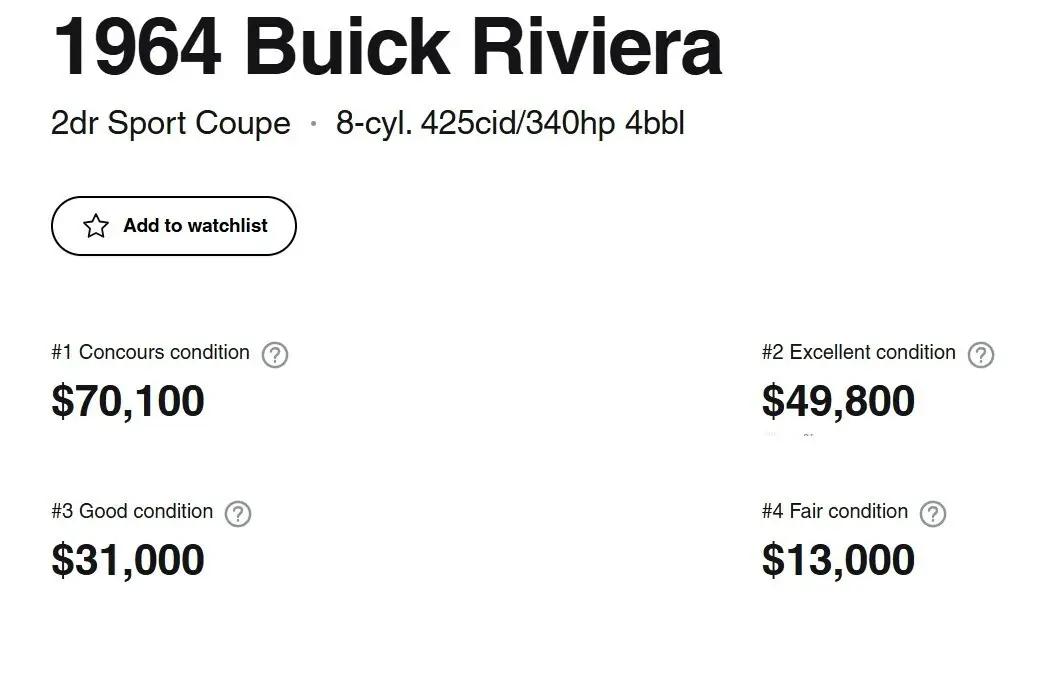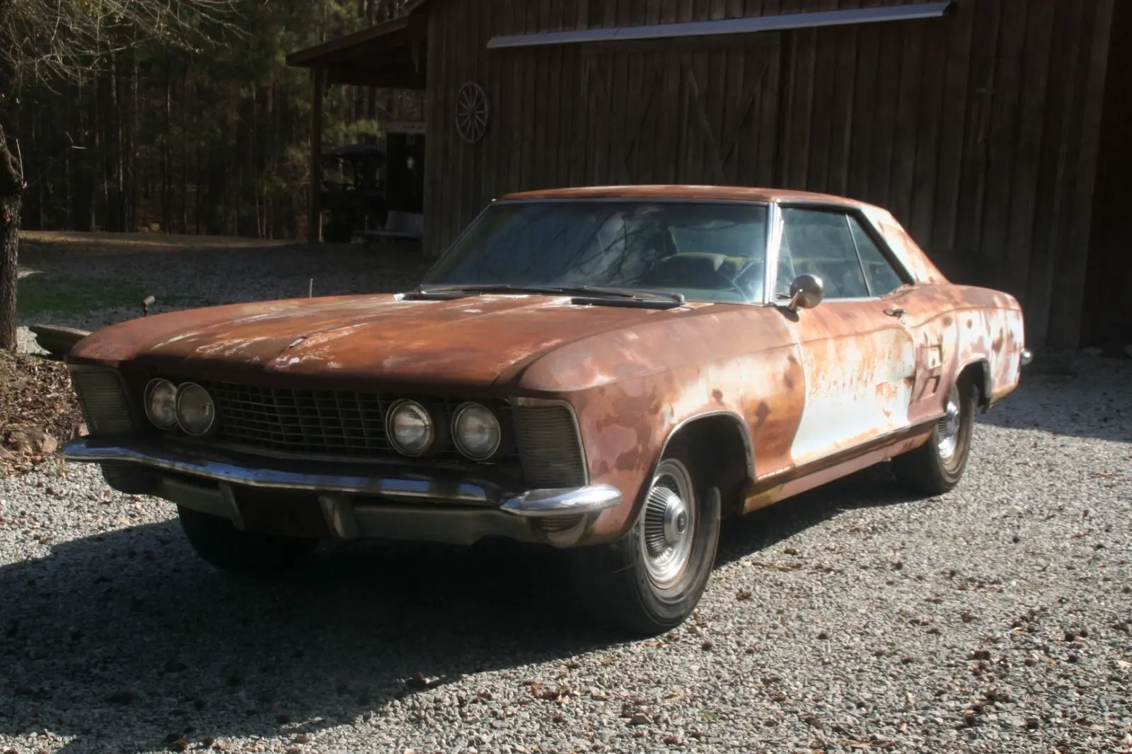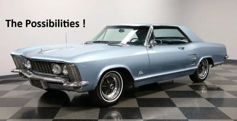 For your consideration is a 1964 Buick Riviera. Affectionately referred to back in the day as the Bankers Hot Rod. Body metal overall not horrible. Paint missing makes it look worse with the Patina. Interior shot ! needs to replaced. Rockers are solid.. Floor Pan on drivers side will need to be replace. Haven't tried starting it. She's a project. Sold as is... But ! it's a hot ticket item. Great Muscle Car and ultimately a solid investment. I've decoded The Trim Tag and VIN. Below- Specific Details - Built at the Flint Michigan Plant. Build Date - 06A - first week (A) of June (06), 1964. 425 CID 340 Hp - Hydraulic Lifters - 10:25 Comp Ratio - 400 Turbo Hydromatic Automatic Trans - Rear Differential : 3.07:1 HH Wedgwood Blue Exterior 601 - Blue Vinyl. Along with the Standard Features, She came equipped with: Automatic Trunk Release Air Conditioning Rear Seat Speaker Remote Mirror Seat Belts Door Guard Moldings Riviera 2-Door Hardtop Coupe Style 4747 – Standard features included two-speed wipers with washers, back-up lights, glare-proof inside mirror, parking brake signal light, safety buzzer, Riviera exclusive wheel covers, electric clock, padded instrument panel, trip mileage odometer, front and rear bucket seats, courtesy lamps, deep-pile carpet, foam-padded seat cushions, center console with transmission selector lever. Interiors were trimmed in vinyl with wood accents. Needs Complete Restoration. Sold As is Where Is. Located in Georgia. Message with questions.. Can assist with shipping if needed. Message your zip for a quote.
