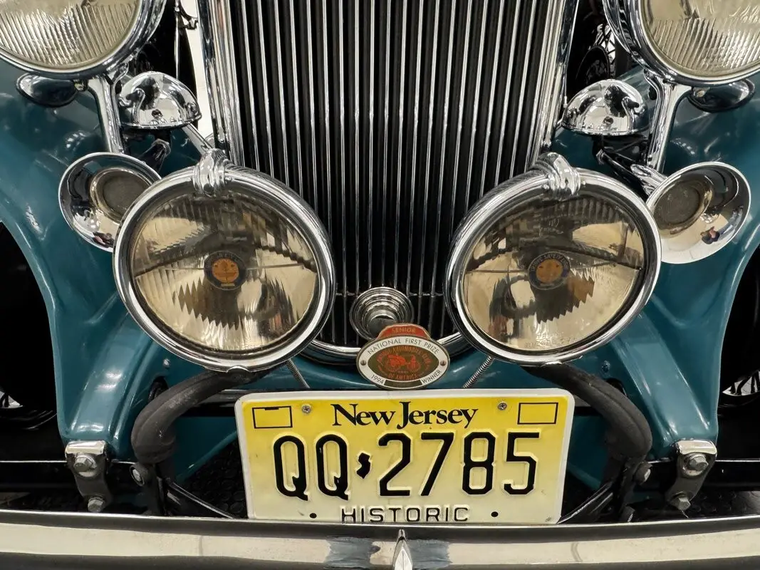 After researching colors and paints, our consignor decided on Pinehurst Green which intersects black panels in a sporty design that results in a handsome profile. Up front, there's a lot for the senses to take in; the upright ribs of the radiator, large headlights and fog lights that nearly match the diameter, twin horns, and polished vents on the engine covers. In profile, 18-inch black wire wheels contrast dramatically with the white wall tires and polished center caps and a spare on both sides creates a symmetrical configuration bolstered by wide running boards expertly trimmed in metal and each wearing a textured step. Up top, a beige canvas Haartz soft top is accompanied by a real landau bar, later to appear on cars stylistically, and other than some light staining, the top and its plastic window are in great shape. On the body, crazing is noted throughout on green surfaces, along with chips on both colors, somewhat extensive in places, and cracks and deglazing on a window.