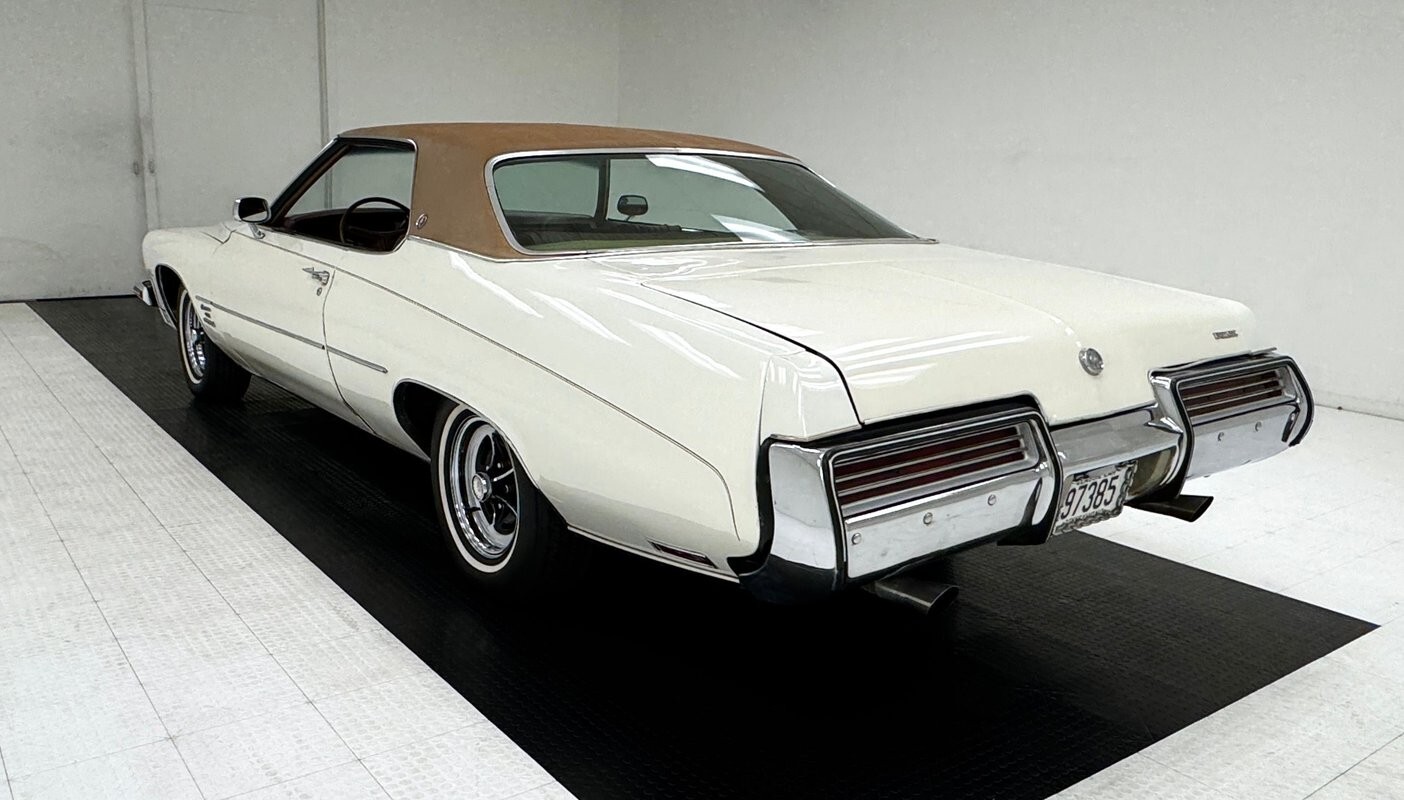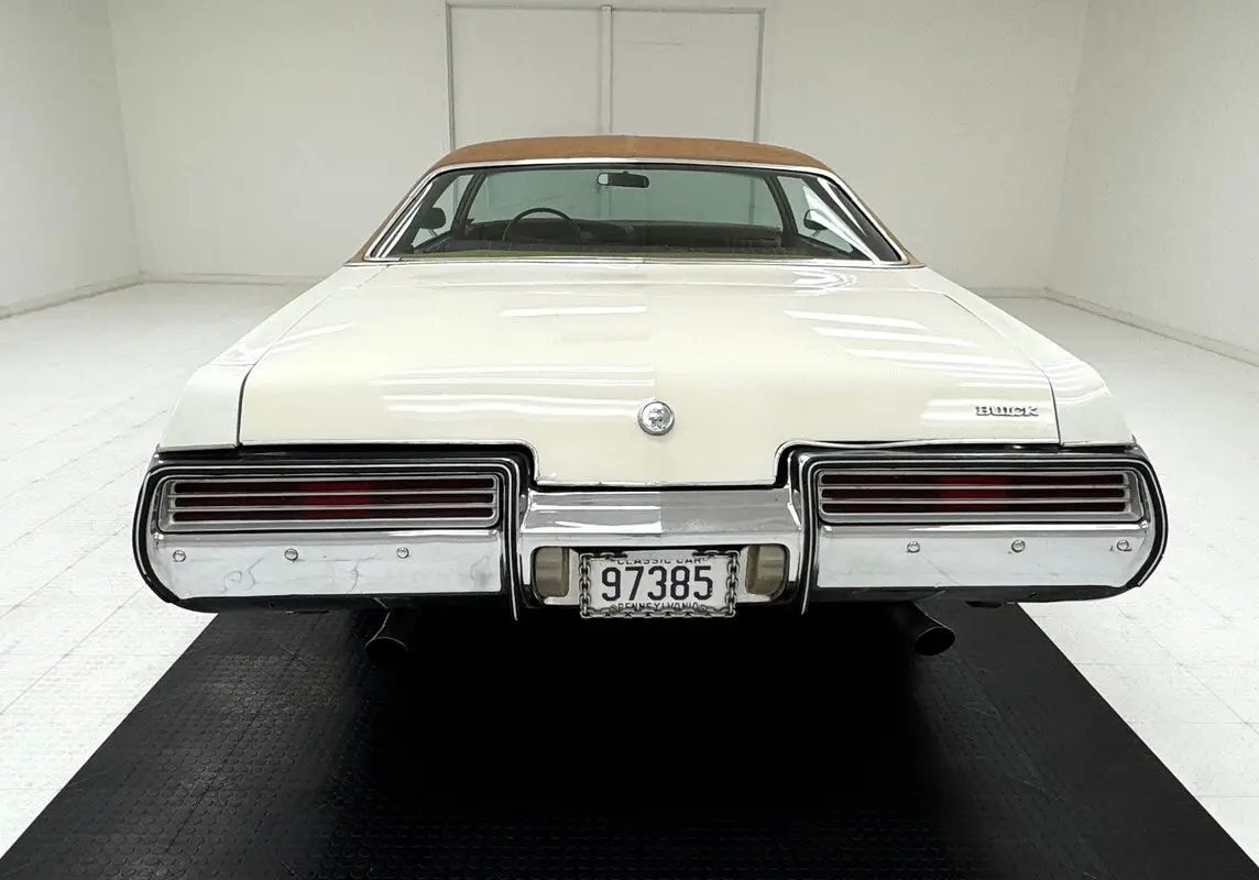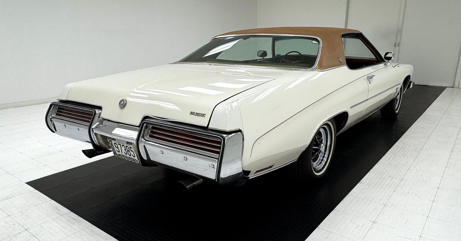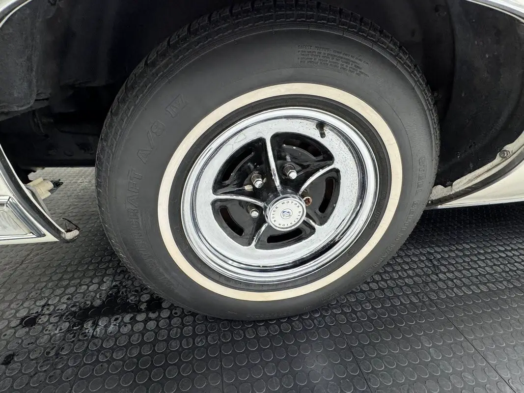 The large steel slab sided vehicle is bathed in white paint and shows some early signs of underlying rust bubbling and previous rust panel overspray. This is particularly evident on the bottom end of the car just above the stainless-steel rocker covering. Overall, it is presenting as fair, and it sports a saddle colored vinyl top with some areas of peel off showing. A wrap around the roll pan rear bumper houses the taillights and dual exhausts peek out from underneath this bumper. 15-inch Buick rally style wheels are on all 4 corners and are wrapped in good rubber.