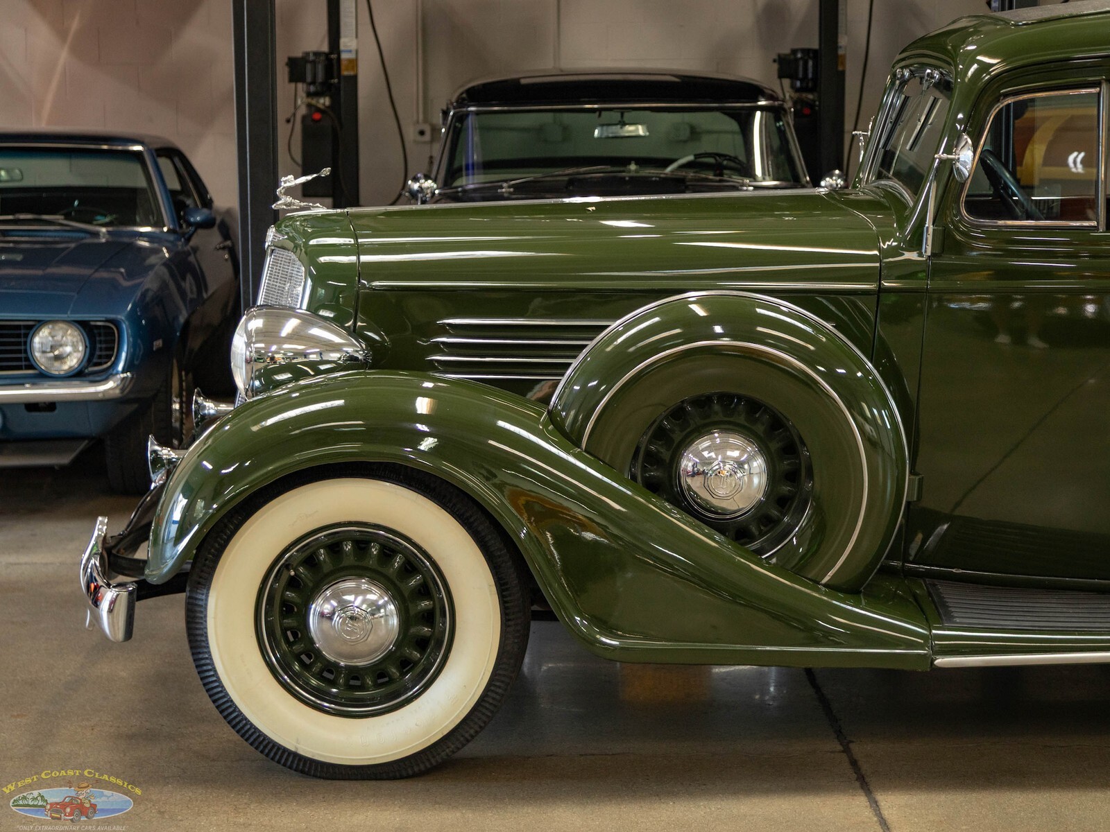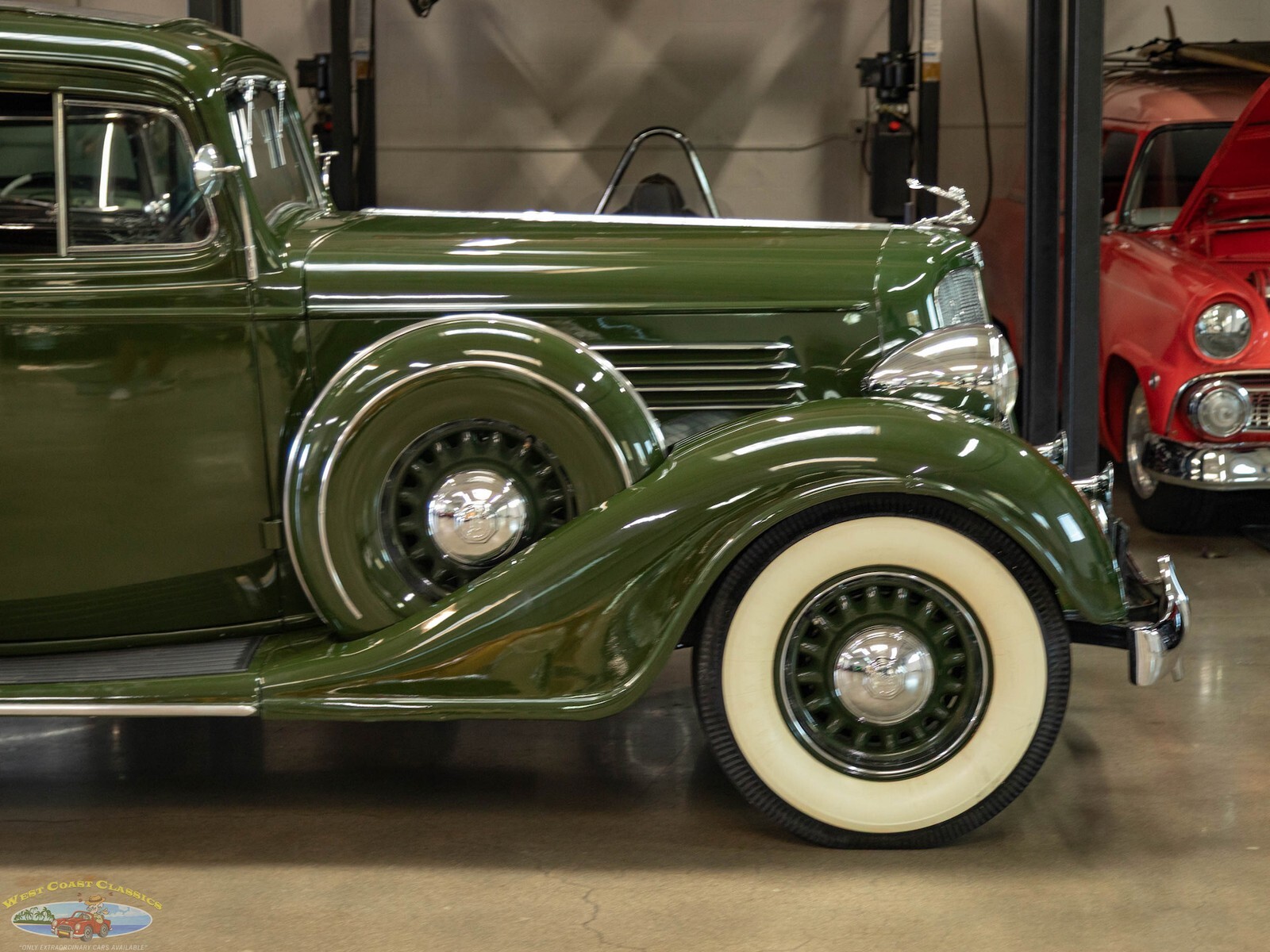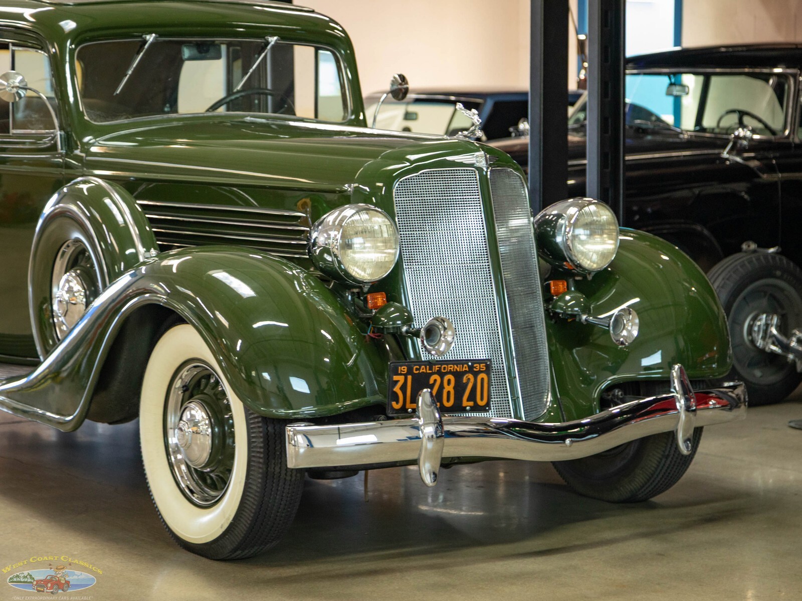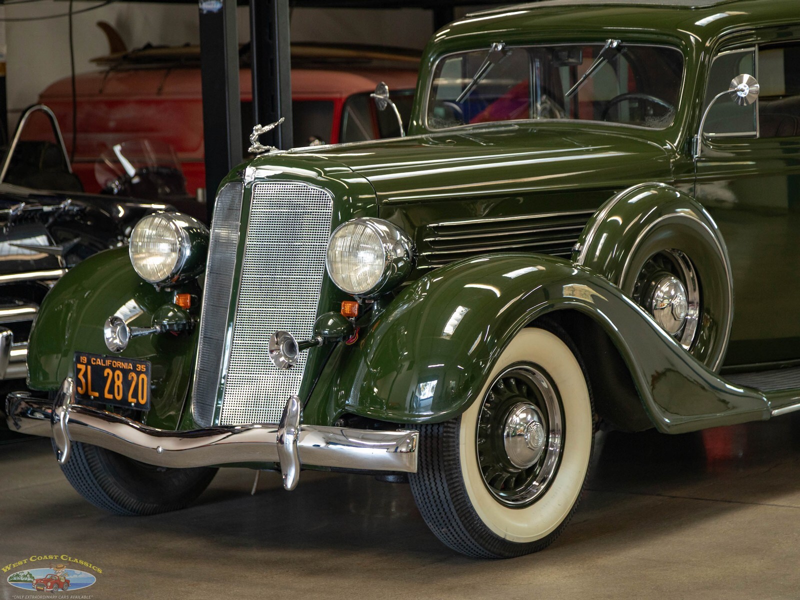 Exterior: Distinguished by sweeping aerodynamic lines, a "thinner depth" chrome grille for 1935, and artillery-style or wire-spoked wheel