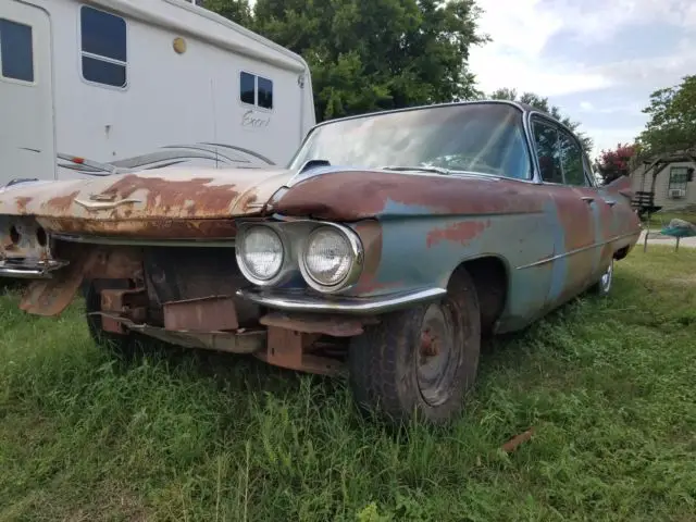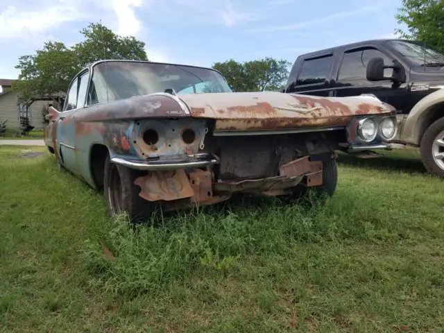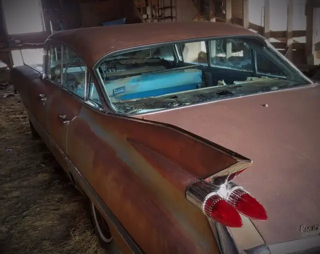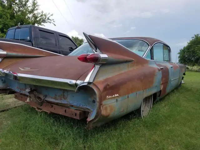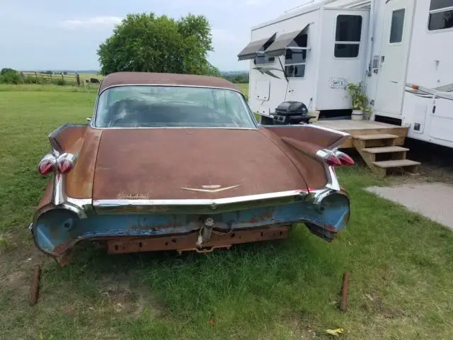 1959 Cadillac De Ville six window. needs full restoration. several dents, dash is toast, both bumpers are missing. I do have both grills, the rear still has a functioning gas door. Engine is stuck but Ihave the cylinders soaking. Appears all original under the hood. Will need two floor pans. Most other parts are present except ps pump, air cleaner, and ac compressor. This car has the rare remote trunk opener with the screw drive pull down.Located in north Texas.