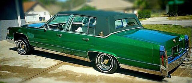1985 Cadillac fleetwood, 350 v, beautiful green paint with white interio, car is set up with pump, chassis chains, knock off rims. runs grea, drives great, lots of chrom, car is like a show car its in very nice condition and is kept in good shape. no rust .this car is a fantastic low rider.