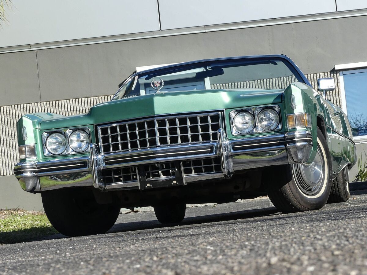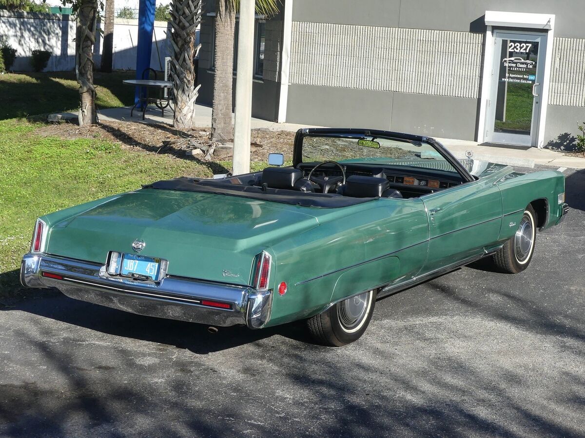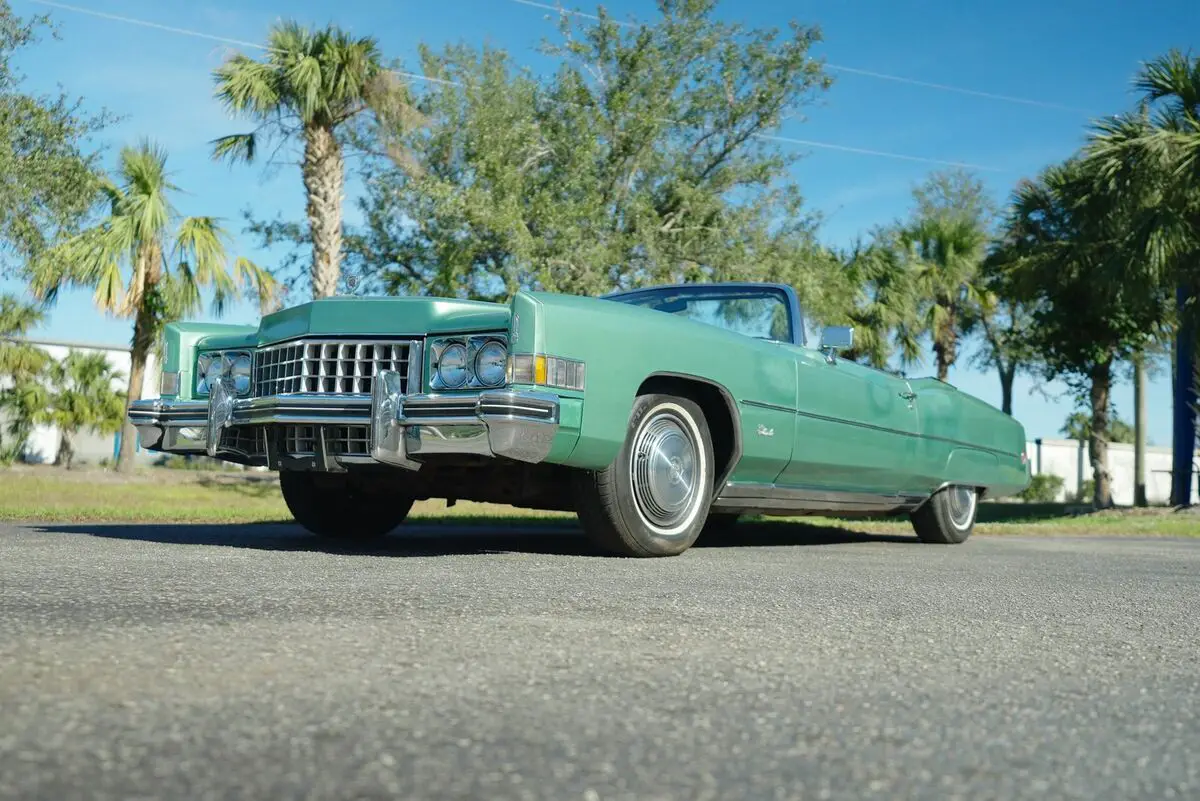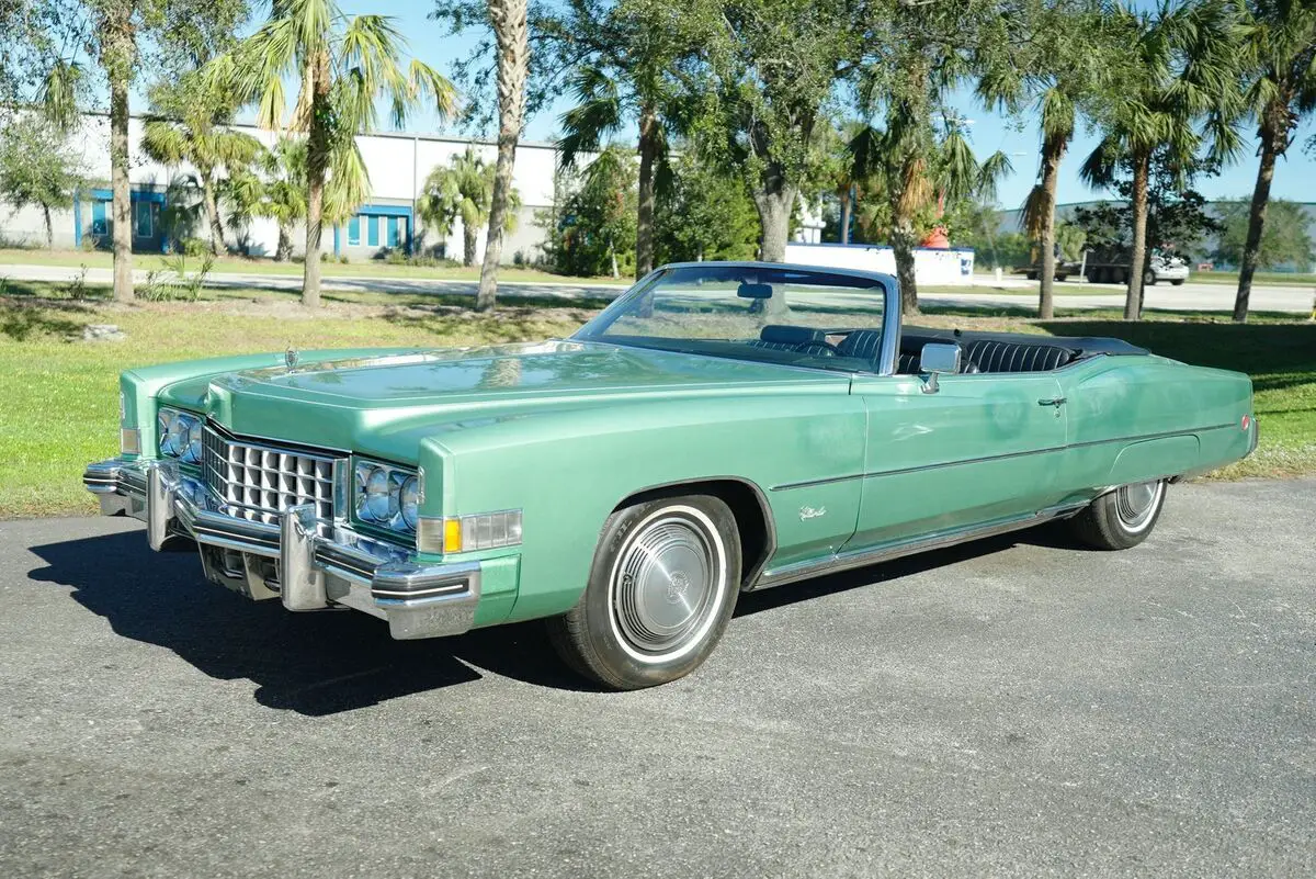 If you're looking for a super clean 70s Cadillac Eldorado Convertible, look no further! The color combination on this 1973 Eldorado is absolutely spectacular! Viridian Green Firemist Metallic paint accented by a black soft top and black interior really grabs your attention. The odometer shows only 42,354 miles that are documented as actual on the title.