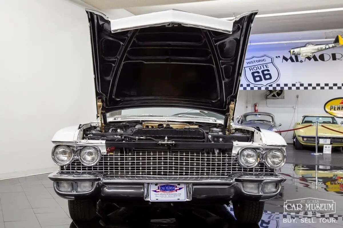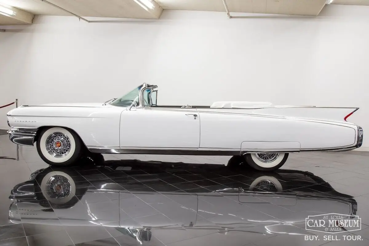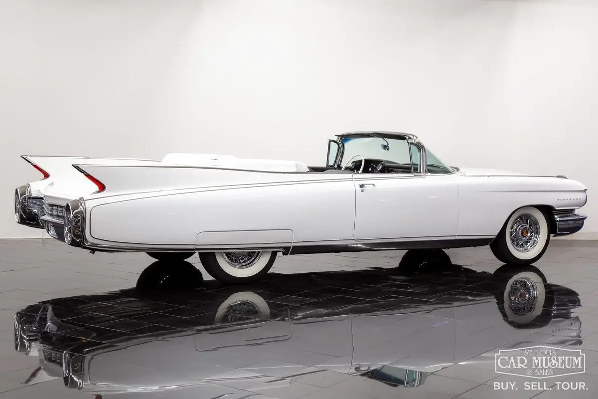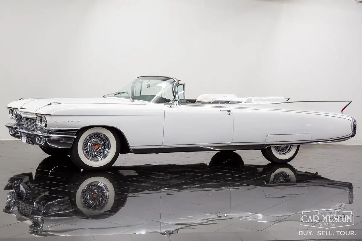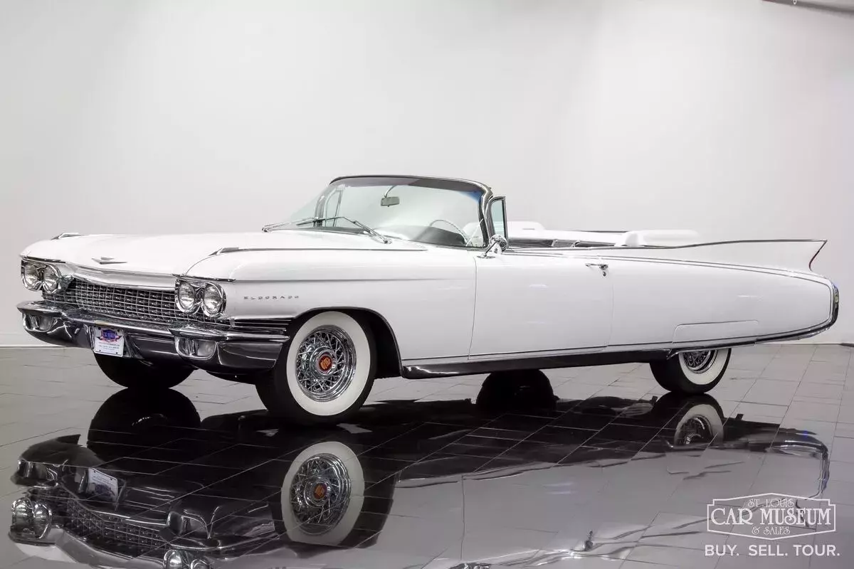 Details About Our Cadillac Eldorado Biarritz for sale: Available now at the St. Louis Car Museum is a 1960 Cadillac Eldorado Biarritz Convertible finished in Olympic White (originally Lucerne Blue) with a Black/White two-tone interior (originally Blue) and white convertible roof. This timeless, classic Cadillac is powered by a date-code correct 390ci-3x2bbl V8 producing a factory rated 345hp mated with a Hydra-Matic 4-speed automatic transmission. Features and optional equipment include factory air conditioning, 8-way power driver seat, Guide-Matic automatic headlight dimmer, power windows, vent glass, & locks; factory standard power steering & brakes, heat/defrost, dual outside rearview mirrors, cruise control, electric trunk release, rear fender skirts, chrome 15" Kelsey-Hayes wire wheels & Coker Classic wide whitewall radial tires, E-Z-Eye tinted glass, AM radio, windshield washer, and parade boot covers! This 50s Cadillac spent much of its life in collections between the Scottsdale, AZ, and Dallas/Houston area and has a well-known history dating back to approximately 1996 when this car had already been cosmetically restored with new interior and exterior color appointments. Most recently, this beauty was parked in the Horton Classic Car Museum Collection based in Nocona, TX from 2013-2023 alongside an amassed collection of wonderful luxury, muscle, and sportscars exceeding over 200 vehicles! This collection would sell in near entirety with this Cadillac Biarritz making its way to the Carolina Classic Cars collection in Zebulon, NC. It would arrive at St. Louis Car Museum & Sales in June 2024. Upon arrival, we elected to replace a few aging components along with a complete tune-up and air conditioning service. This included new engine & transmission mounts, steering coupler and idler arm, rear pinon seal, rear trailing arm bushings, and differential ball joint. The driveshaft u-joints were replaced and new differential gear oil in the axle. The engine received new oil and filter, complete tri-carburetion overhaul, new fuel filter, valve cover gaskets, new air filter, new air conditioning compressor with recharge of modern R134a, and fresh distributor cap/rotor, spark plugs/wire set. The brakes were also completely freshened with 4 new drums, a rebuilt master cylinder, new wheel cylinders, hoses, and rear shoes as well as fresh brake fluid and bleeding of the complete system. It shows only 64,998 miles on the odometer, although we don't have enough documentation to support any true mileage claims. We do know it was driven very sparingly over the last 25 years or so, making our mechanical contributions worthy for the new owner to drive it with added confidence! Contact Jon Faust to learn more about this classic Cadillac or to ask about financing and trading options - 855-586-3413 | 855-586-3413 | email History About Cadillac's 1960 Eldorado Biarritz: One can only imagine the pressure Cadillac's design team felt after the Eldorado debuted to the public in 1959. Although considered one of the most desired cars among Cadillac collectors today, the 1959 model was an extremely extravagant design for car buyers during the day. Its wild charisma and huge rear fins weren't for everyone and may have turned a few longtime Cadillac devotees away from showrooms. The answer in 1960 was a milder, slightly more subdued design to woe traditional buyers back. They could not have been timelier in that decision, and produced another outstanding vehicle with timeless body lines! It would also mark the final year of the Eldorado Seville Hardtop Coupe, tri-carburetion engines, and air ride suspension. The top-of-the-line Eldorado models continue to be one of the most desirable Cadillacs to own today! Only 1,285 Cadillac Eldorado Biarritz Convertibles would find showrooms in 1960, making them solid blue-chip investments still today! Contact Jon Faust at 855-586-3413 to schedule a test drive.