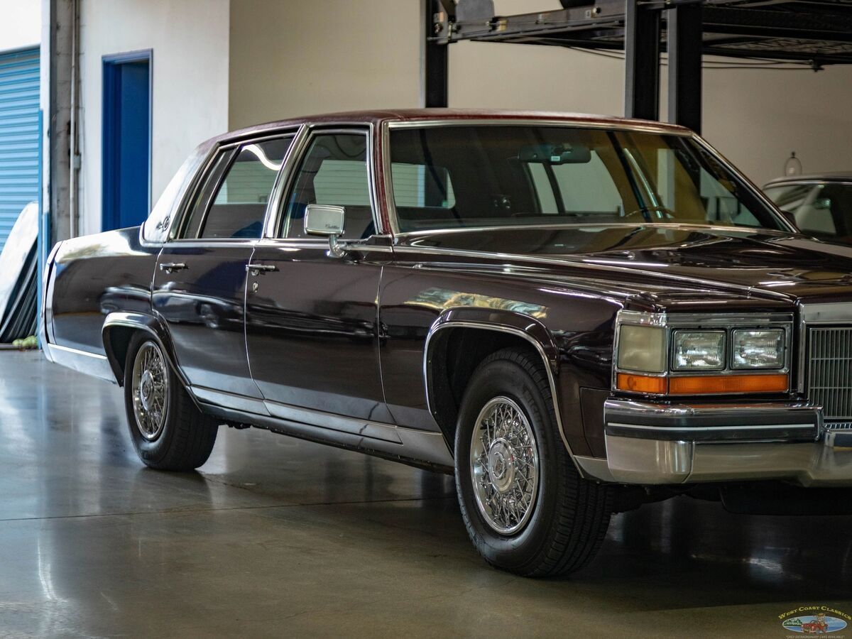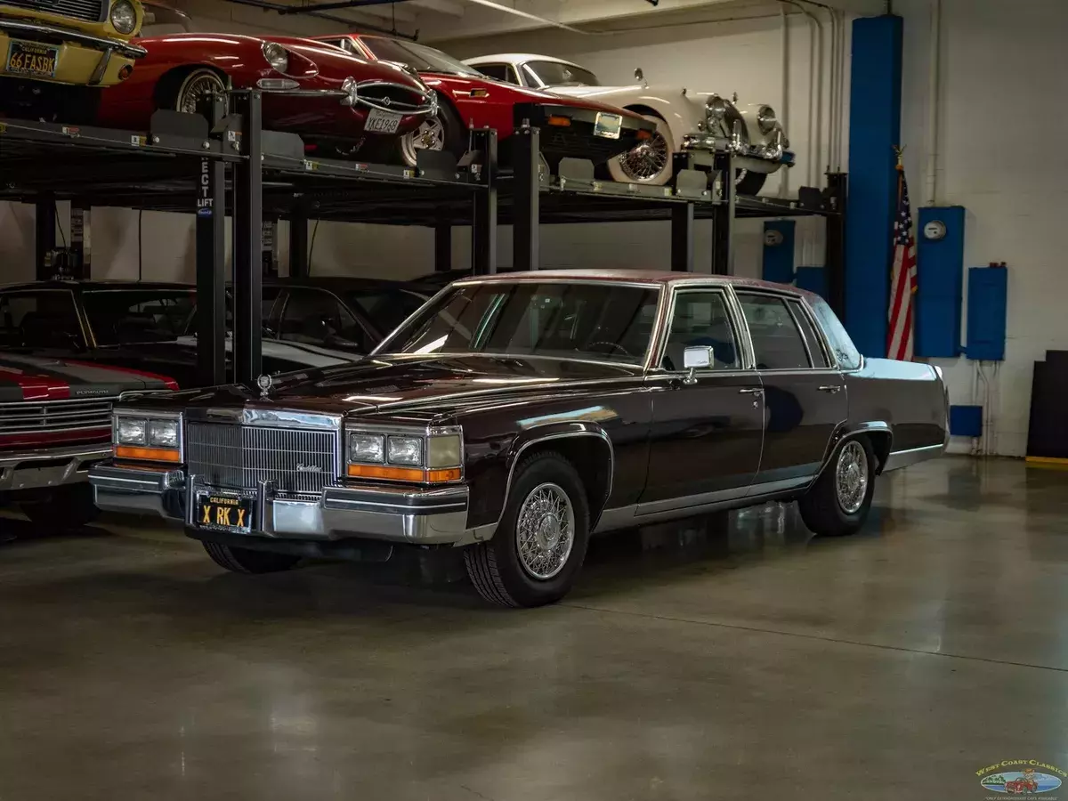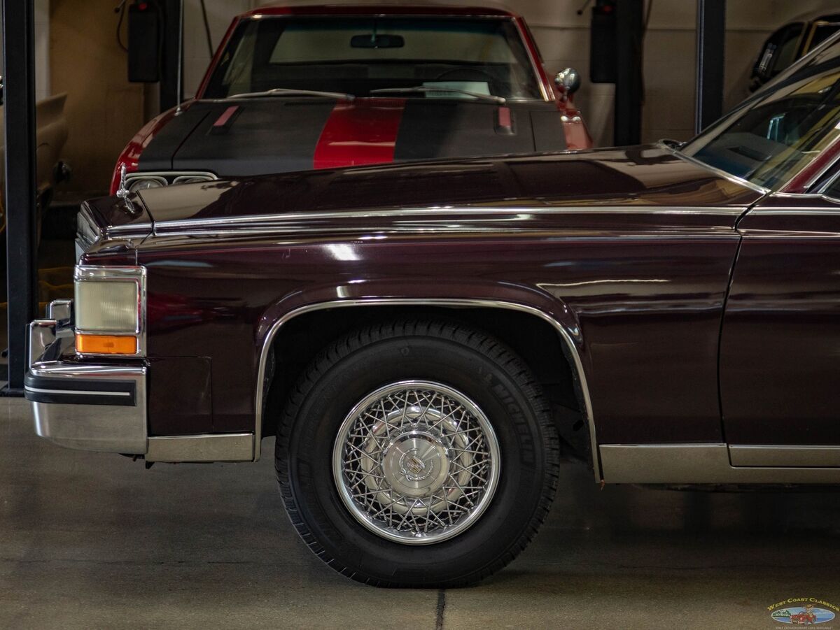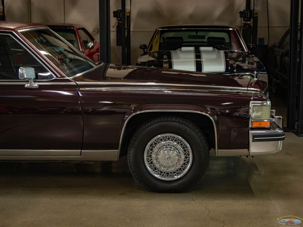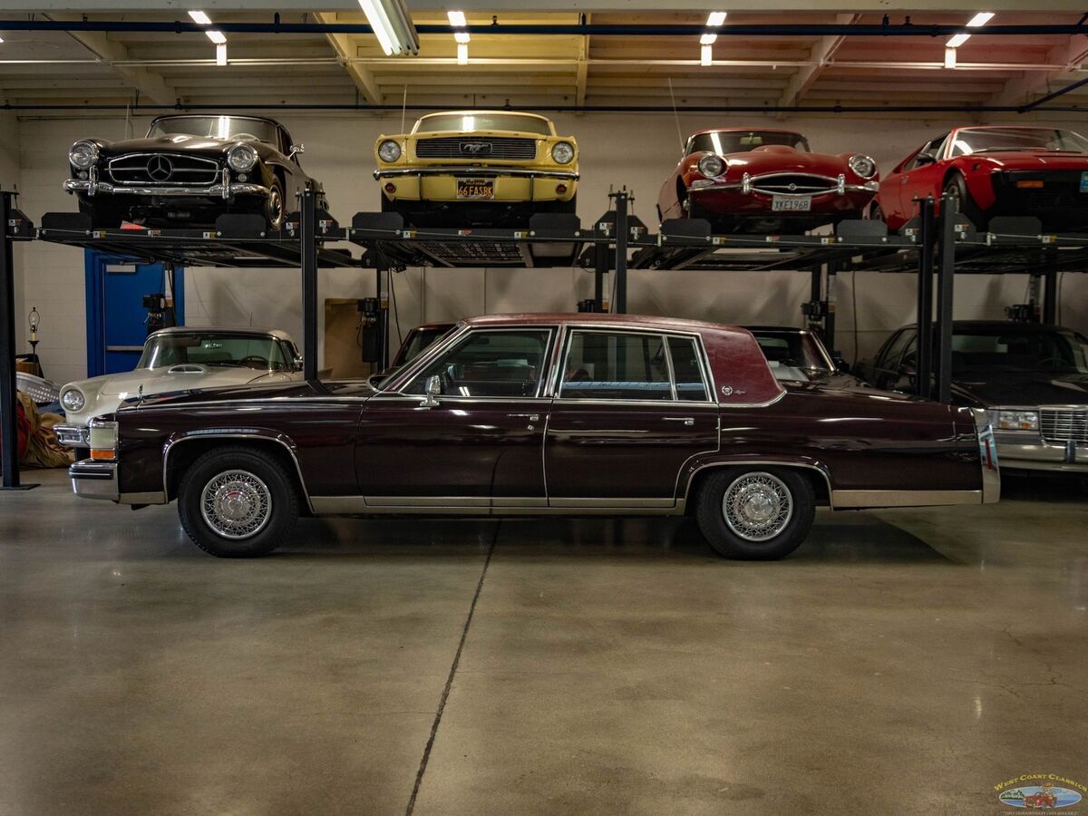 West Coast Classics are proud to present a beautiful example of this 1985 Cadillac Brougham d'Elegance 4.1L V8 sedan in its original 'Dark Red' (color code 79) paint with a matching 'Dark Red' Velour heather cloth interior and with only 59K original miles! The car has rare factory added options including:D'Elegance Package with Brougham button tufted Venetian velour heather cloth pillow style seatingSpecial Door pull handlesD'Elegance script on glovebox and on outside rear sail panelsWire Wheels DiscsAM/FM Radio CassetteTilt Steering & TelescopeElectronic Level ControlCruise ControlRear Electronic Heated Outside Mirrors & Window DefoggerIlluminated Vannity MirrorsGarage Opener TransmittorElectric MirrorsTwilight SentinelPower Trunk Lid Pull DownTrunk MateDoor Edge Guardsand standard options including:4.1L V8 4BBL engine4 spd automatic transmission with OverdrivePower BrakesPower SteeringElectronic Climate ControlPower WindowsPower Door LocksDual Comfort Front Seats6 Way Power Driver SeatFull Vinyl RoofOpera LampsAccent MoldingsIlluminated Entry SystemSoft Ray GlassRemote Control MirrosAutomatic AntennaLamp MonitorsCornering LampsAutomatic Parking Brake releaseObviously always garaged and with no accidents, for all intents and purposes a superbly kept and well maintained car! Owned and driven by only one obviously very careful and mature drivers since new - never abused - babied all the way!The original 'Dark Red' factory color paint is in very good condition and the matching and all original 'Dark Red' button tufted seats and interior is also in quite exceptional condition throughout with virtually no signs of wear. Every option is working as it should including the ice-cold A/C.This particular model must be seen and driven to be fully appreciated - the car drives as good as it looks with Cadillac's famous smooth and luxurious ride - no shakes or rattles and the considerable power of it's 4.1 litre 4BBL V8 engine purring almost imperceptibly under the hood! The engine is extremely strong and responsive, the transmission shifts smoothly through the gears and the temperature always remains cool.The Cadillac Brougham was a line of luxury cars manufactured by the Cadillac Motor Car Division of General Motors from the 1987 through 1992 model years and was previously sold from 1977 to 1986 as the Cadillac Fleetwood Brougham. The optional "d'Elegance" trim package introduced during the Fleetwood era remained available. The optional "d'Elegance" package introduced in the upscale Fleetwood trim line in the 1970s, offering even more luxurious appointments, including button-tufted seating and rear-seat reading lamps. Being body-on-frame, it was popular among coachbuilders who manufactured stretched limos and by Cadillac buyers who preferred the familiar combination of exterior size, heft, rear-wheel drive and an optional Chevrolet 350 V8.This is one very unique and ridiculously spacious and comfortable car with no real rivals in it's class - the real deal for a grand touring or long distance cruising sedan for ultimate luxury and comfort and this must surely be one of the finest examples available anywhere with low original miles of a primarily always dealer maintained and serviced flagship Cadillac 'Brougham d'Elegance' edition model with only 59K original miles available on the market anywhere today!