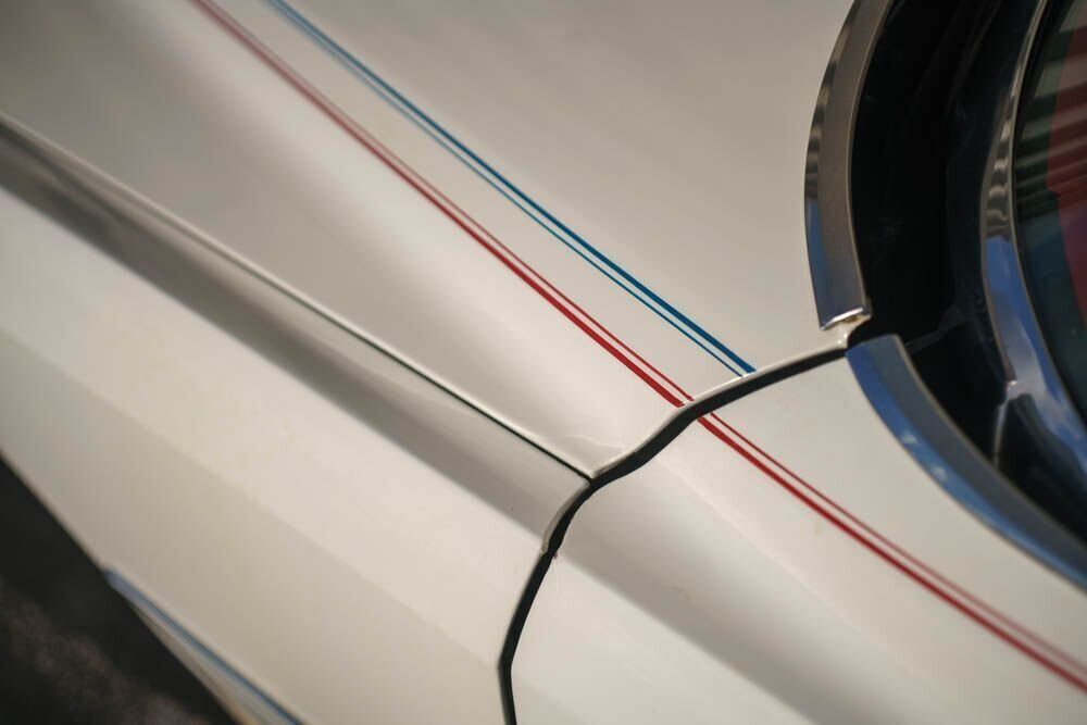 Inside, is a white leather interior with contrasting Firethorn carpet and dashboard (code 072). The front and rear bench seats are in very good order, as is the aforementioned red carpeting. A three-spoke steering wheel looks good and matches the dash. The instrument panel and inner door liners are all in very good order. A console-mounted shifter and a factory AM/FM stereo complete the interior.