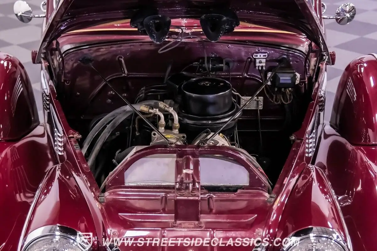 The grey leather interior stretches across the cabin like a high-end hotel lobby. The bench seats accommodate passengers in first-class comfort, while the wood grain dash serves as a control center for the authentic 6-volt gauges. A dedicated battery system hidden in the kick panel maintains the original instrumentation, and the under-dash air conditioning adds modern comfort. The carpeted trunk includes a convenient light built into the lid for nighttime loading.