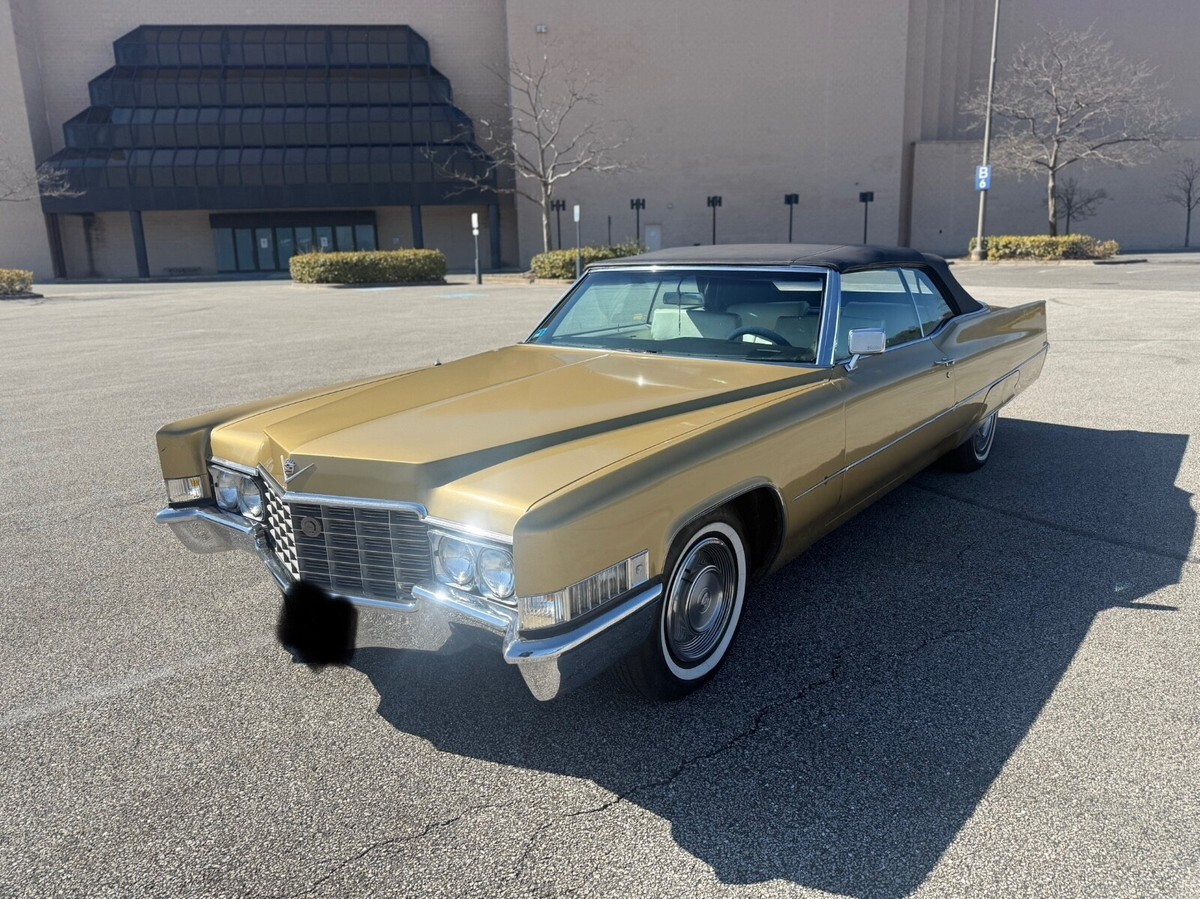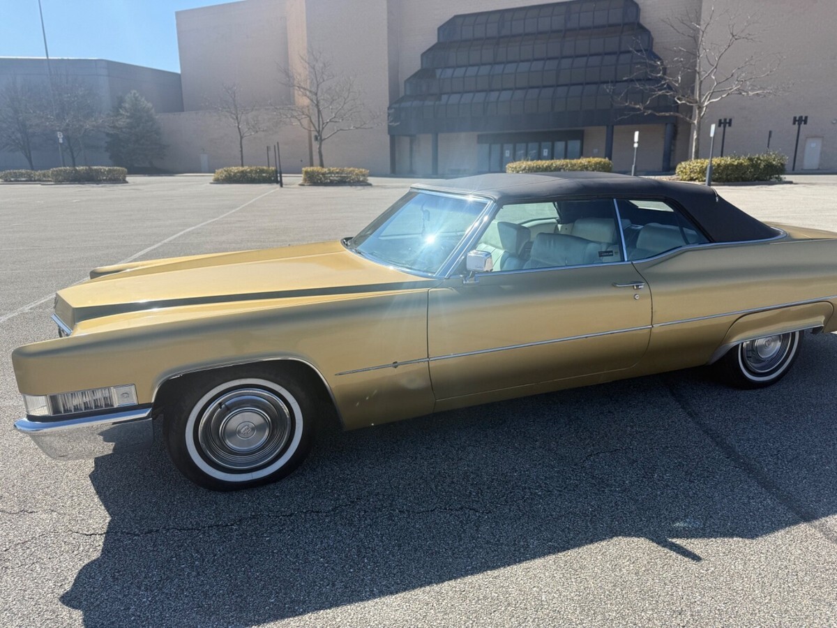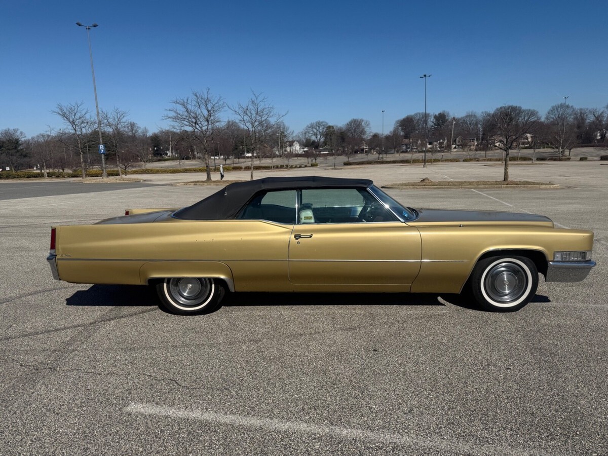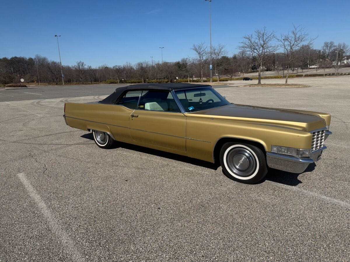 This 1969 Cadillac DeVille Convertible is believed to have stayed in the original owner’s family until 2020, when I acquired it.. It is finished in Shalimar Gold with white leather and gray cloth upholstery. The car is powered by a 472ci V8 engine paired with a three-speed automatic transmission. Notable features include a power-operated black convertible top, Twilight Sentinel headlights, rear fender skirts, chrome grille and bumpers, and 15" steel wheels with hubcaps. It also comes with power steering, power-assisted front disc brakes, a power-adjustable front bench seat, power windows and locks, a Blaupunkt cassette stereo, and automatic climate control.The car has a clean Maryland title. Winning bidder is responsible for vehicle transport fees.