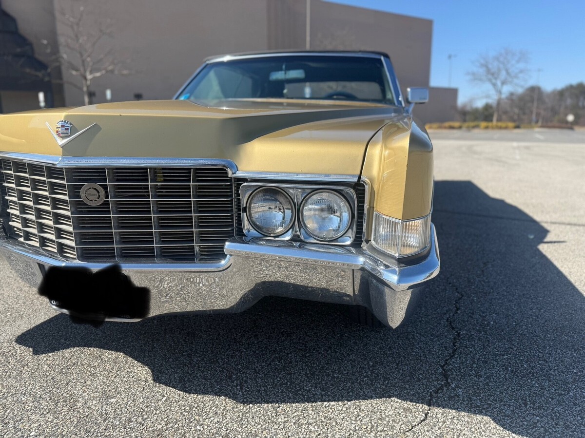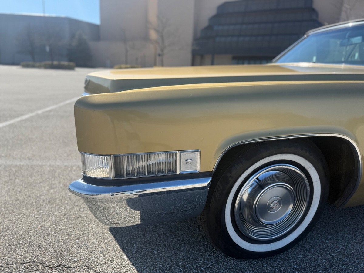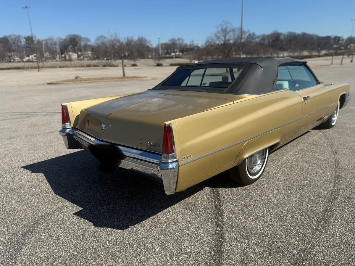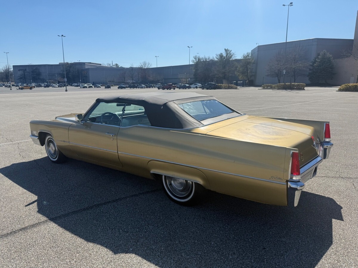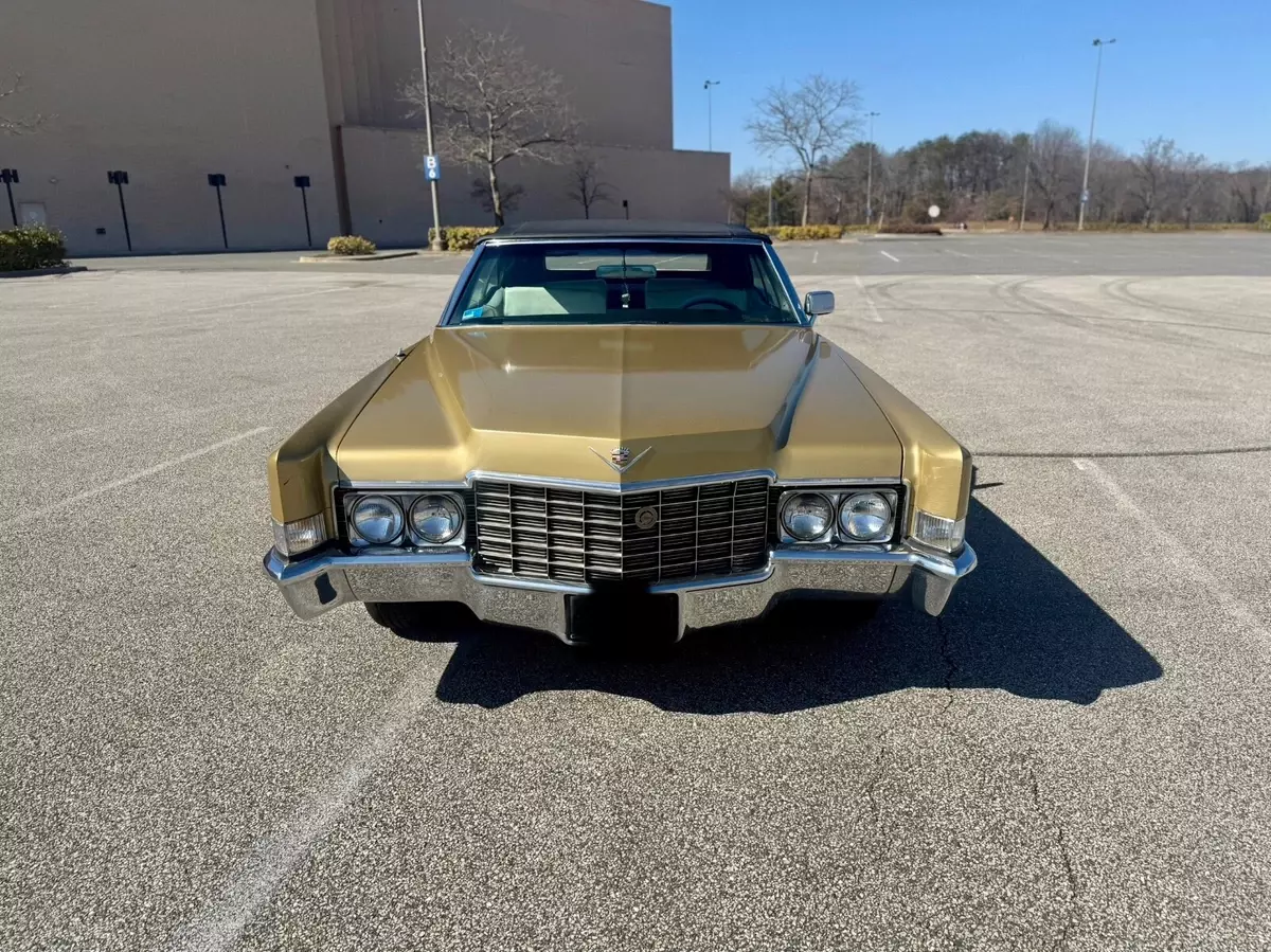 This 1969 Cadillac DeVille Convertible is believed to have stayed in the original owner’s family until 2020, when I acquired it.. It is finished in Shalimar Gold with white leather and gray cloth upholstery. The car is powered by a 472ci V8 engine paired with a three-speed automatic transmission. Notable features include a power-operated black convertible top, Twilight Sentinel headlights, rear fender skirts, chrome grille and bumpers, and 15" steel wheels with hubcaps. It also comes with power steering, power-assisted front disc brakes, a power-adjustable front bench seat, power windows and locks, a Blaupunkt cassette stereo, and automatic climate control.The car has a clean Maryland title. Winning bidder is responsible for vehicle transport fees.
