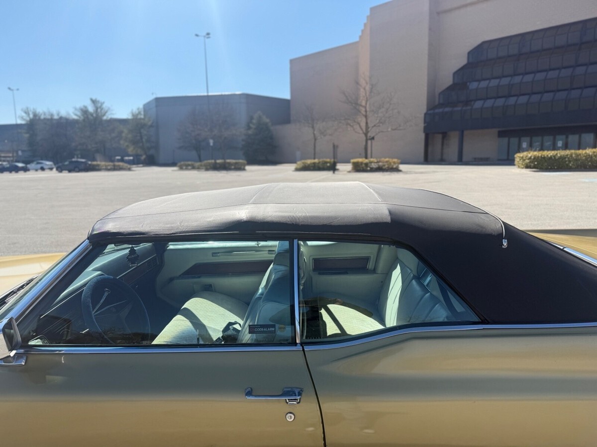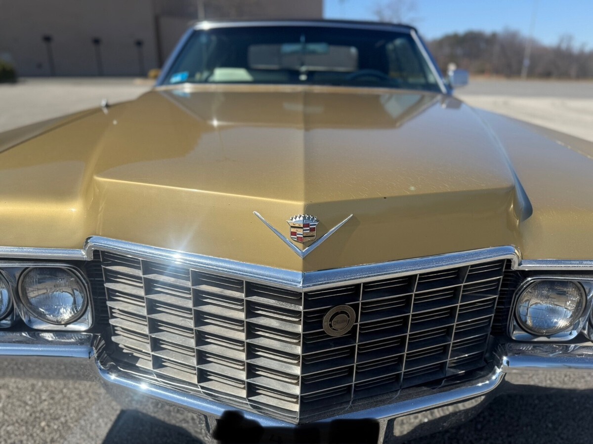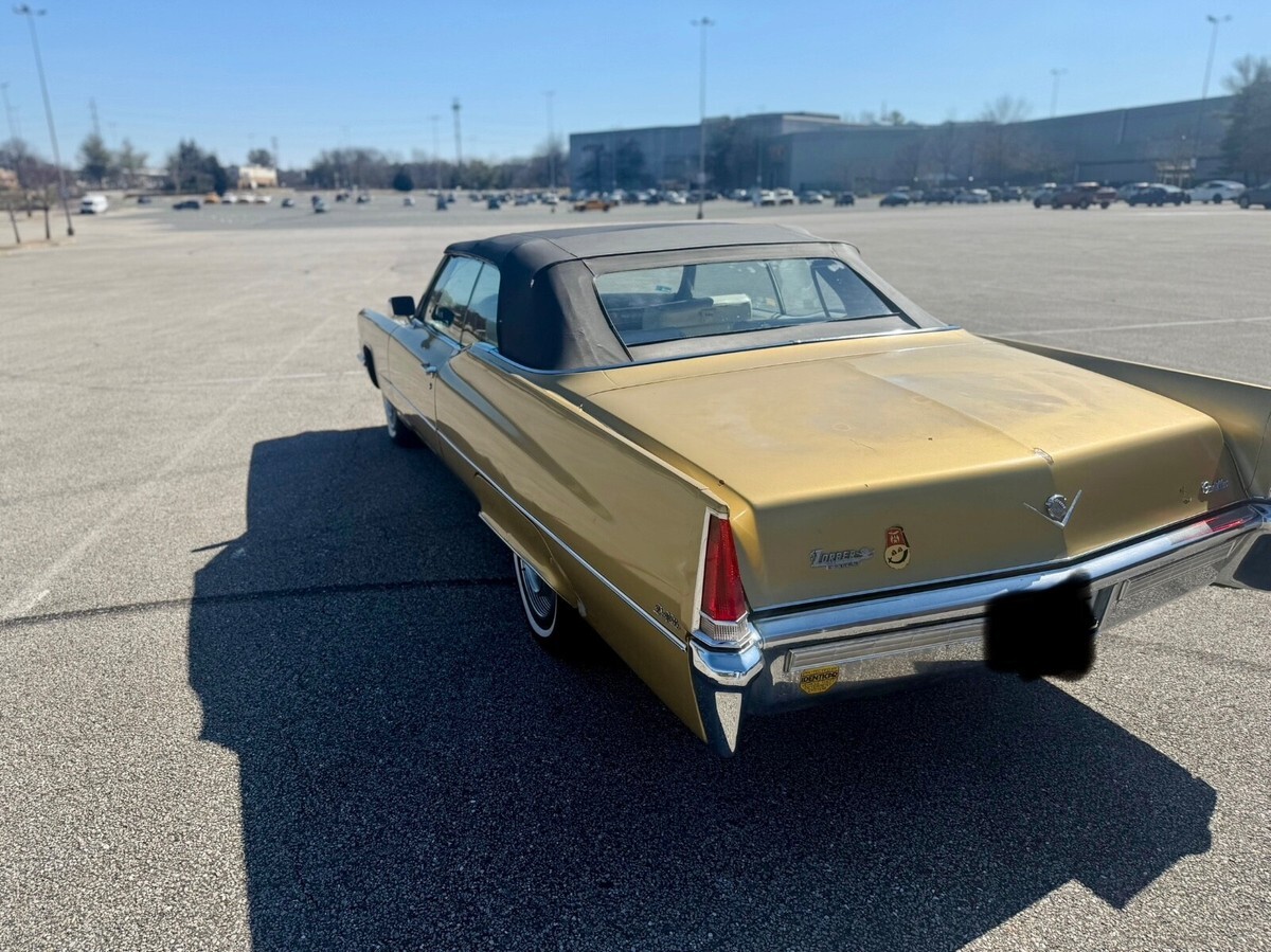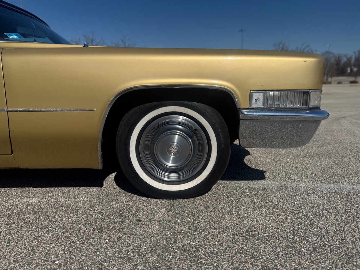 This 1969 Cadillac DeVille Convertible is believed to have stayed in the original owner’s family until 2020, when I acquired it.. It is finished in Shalimar Gold with white leather and gray cloth upholstery. The car is powered by a 472ci V8 engine paired with a three-speed automatic transmission. Notable features include a power-operated black convertible top, Twilight Sentinel headlights, rear fender skirts, chrome grille and bumpers, and 15" steel wheels with hubcaps. It also comes with power steering, power-assisted front disc brakes, a power-adjustable front bench seat, power windows and locks, a Blaupunkt cassette stereo, and automatic climate control.The car has a clean Maryland title. Winning bidder is responsible for vehicle transport fees.