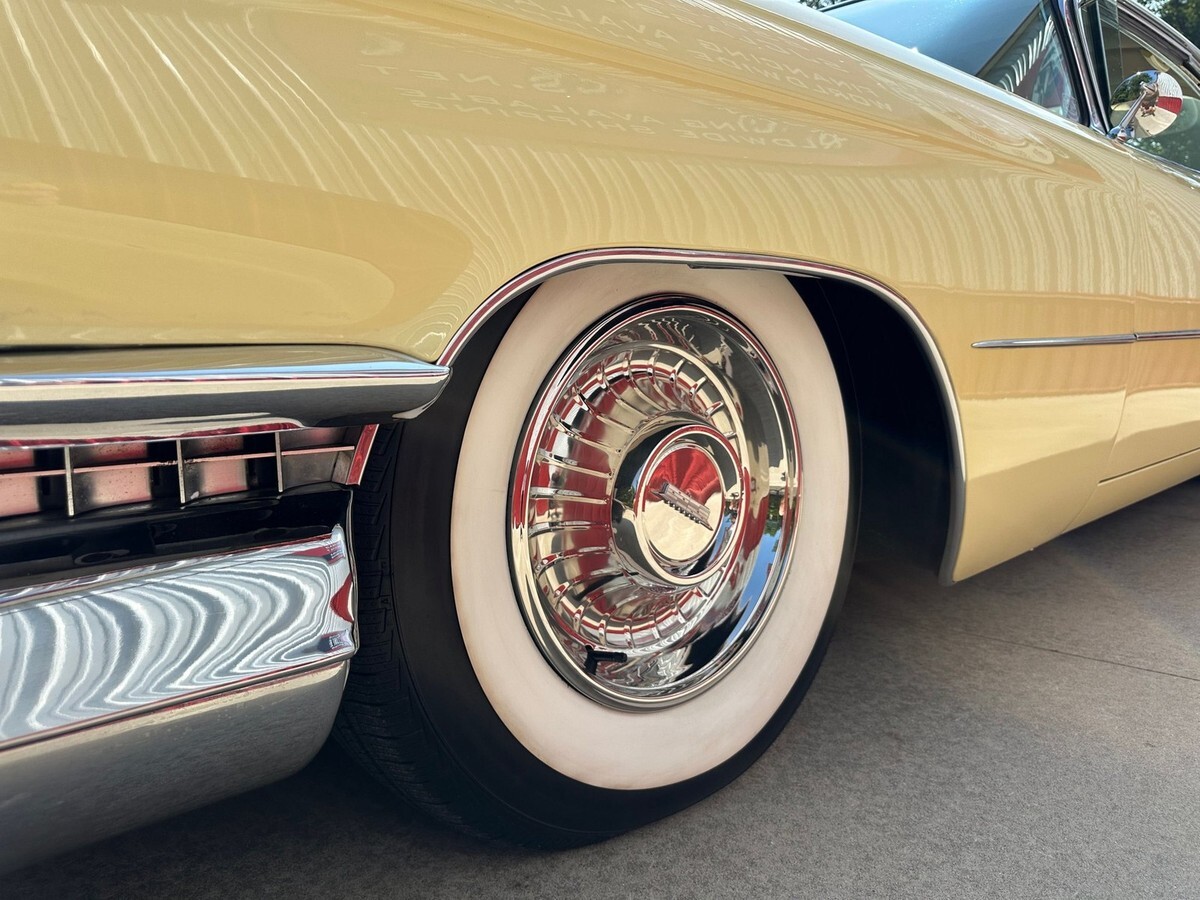 The exterior color, Gotham Gold, is a pale yellow that gleams under the light and contrasts beautifully with the polished Cadillac hubcaps and wide whitewall tires. The wheels are now wrapped in new 235/75R15 Diamond Back radial tires for improved road manners without sacrificing the vintage look. The engine bay is dressed with color-matched valve covers and air cleaner for a coordinated, custom aesthetic that complements the car's bodywork. The overall stance and finish of this Coupe DeVille exude elegance with a hint of custom flair, especially when the air suspension is lowered for display.