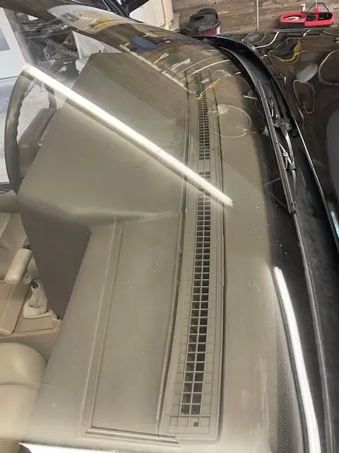 The dashboard below the windshield was in bad shape when I got it. I have done my best to restore it but it is not perfect. It was warped and the vent was broken. I substantially straightened it out and the vent is glued in place, and I color restored it. You can see in the picture. Not something that glares out at you but you can see it if you look. It is what it is.