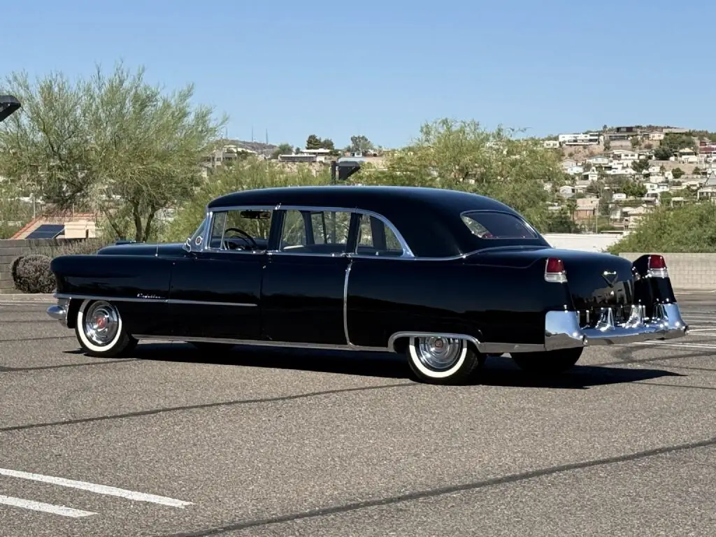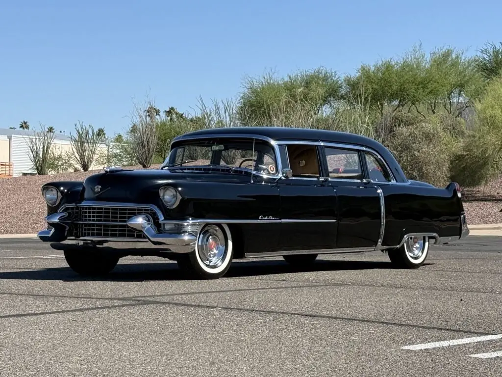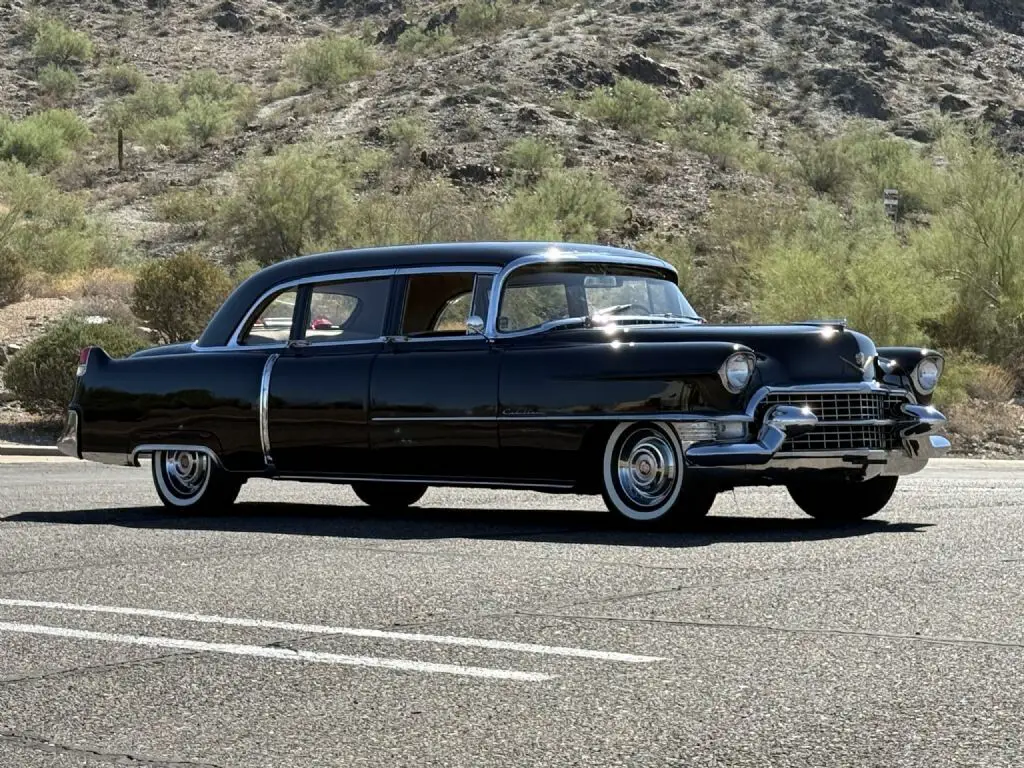 This is a very nice 1955 Cadillac Fleetwood Series 75 Limousine that is in overall driver quality condition. This is the much rarer Fleetwood Imperial limousine (Style 7533X Imperial Business Limousine) and was Cadillacs top offering in 1955. The design and stature of this Cadillac is very elegant and stately. This is a very nice driving limousine that can be shown at local and regional car shows or used to take your family or friends to a special dinner. The black livery is very formal and elegant. The older repaint is in very nice condition with a high shine and luster. There are some light scratches and imperfections present, but overall, it looks very nice. The chrome and stainless are in very good condition with some use showing. The interior offers black vinyl upholstery in the front compartment and tan fabric upholstery in the rear passenger compartment. The two larger jump seats allow for seven to eight passengers comfortably transported. This Cadillac has front and rear air conditioning and is loaded with options. The air conditioning has been recently serviced and blows very cold, making it comfortable even here in Phoenix during the summer. The 331 cid V8 offers 250 hp and is very smooth, quiet and powerful. The Hydramatic four-speed automatic transmission shifts smoothly. The chassis overall has normal surface rust that we see in unrestored Cadillacs. For more information and details, please call or text Harry Clark at 1.623.404.9042 or email us at . This Cadillac is available for inspection at our showroom in Phoenix. We are pleased to coordinate inspections, and we help coordinate shipping worldwide. We also have financing partners if you are interested in financing.