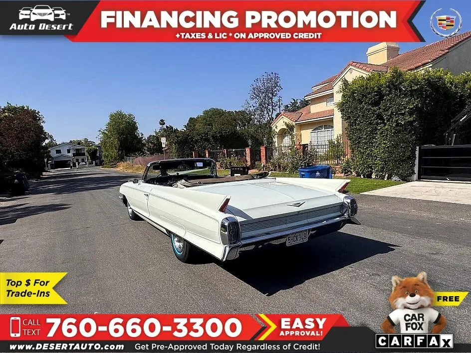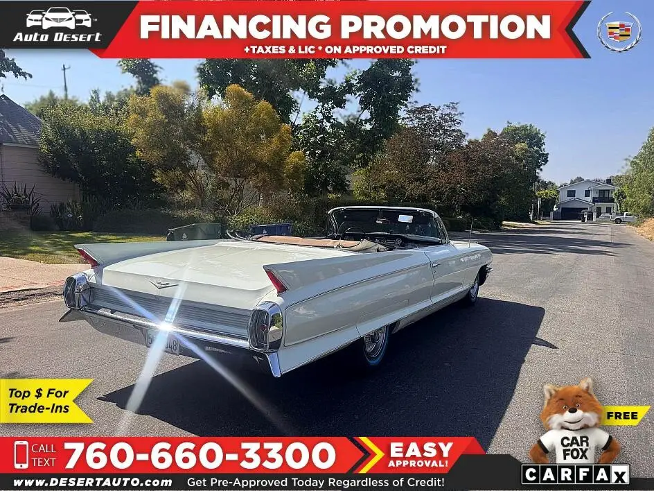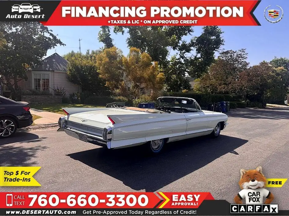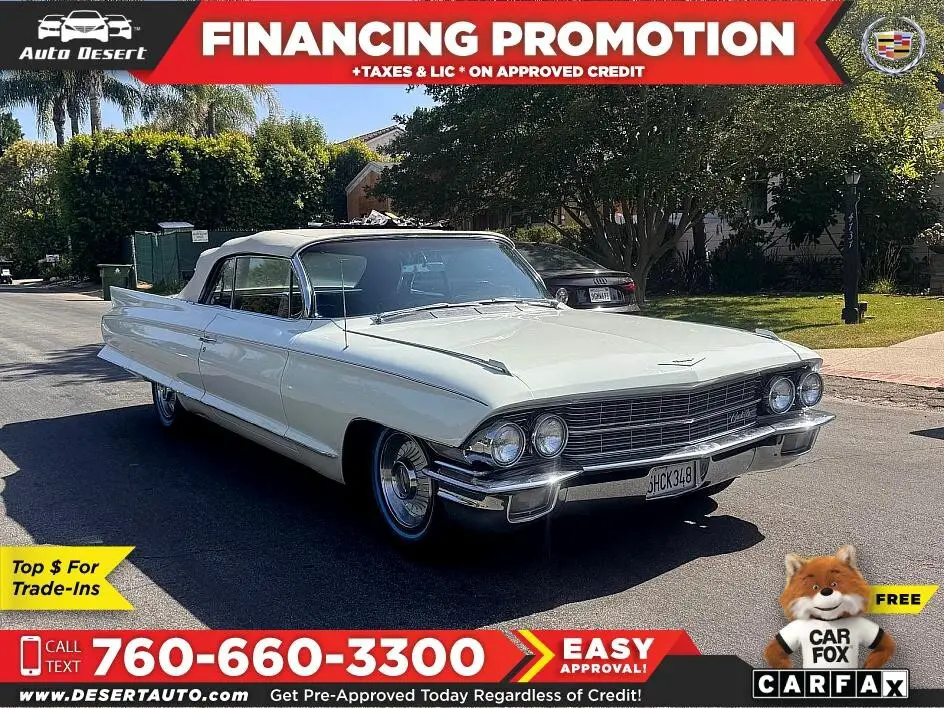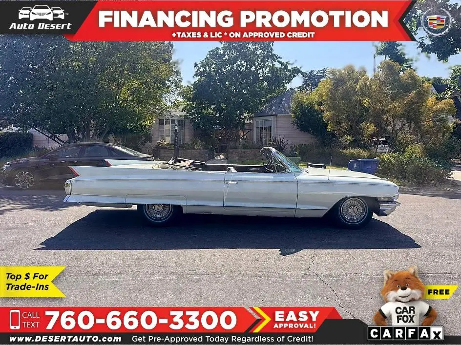 Vehicle Original VIN : 62F1384981962 Cadillac Series 62 Convertible – Overview. The 1962 Cadillac Series 62 was a luxury full-size convertible designed for comfort| style| and was part of the sixth generation of the Series 62 line and represented Cadillac’s golden era of design— with long| sleek lines| chrome accents| and fins that were more refined than in the late ’50s.. ?. ????962 Cadillac DeVille series 62 3 owner Southern California owned with $68|000 original miles finished it's of OlympicWhite color it is complete with all of its trim the Chrome isn't very good condition white convertible top rarely gets put down and there is a black leatherboot cover that matches when it's down interior is leather with 6-way power seats working correctly all windows also working correctly and have been service car has beenconverted to the new R134A refrigerant in the AC is blowing cold the original trunk still has its original material carries its Jack and spare all power items lights signals are in working conditioncar runs and drives 80 miles per hour down the highway and recently just got a brand new set of radial tires on it suspension is good as well... Read the full description on our Website at: