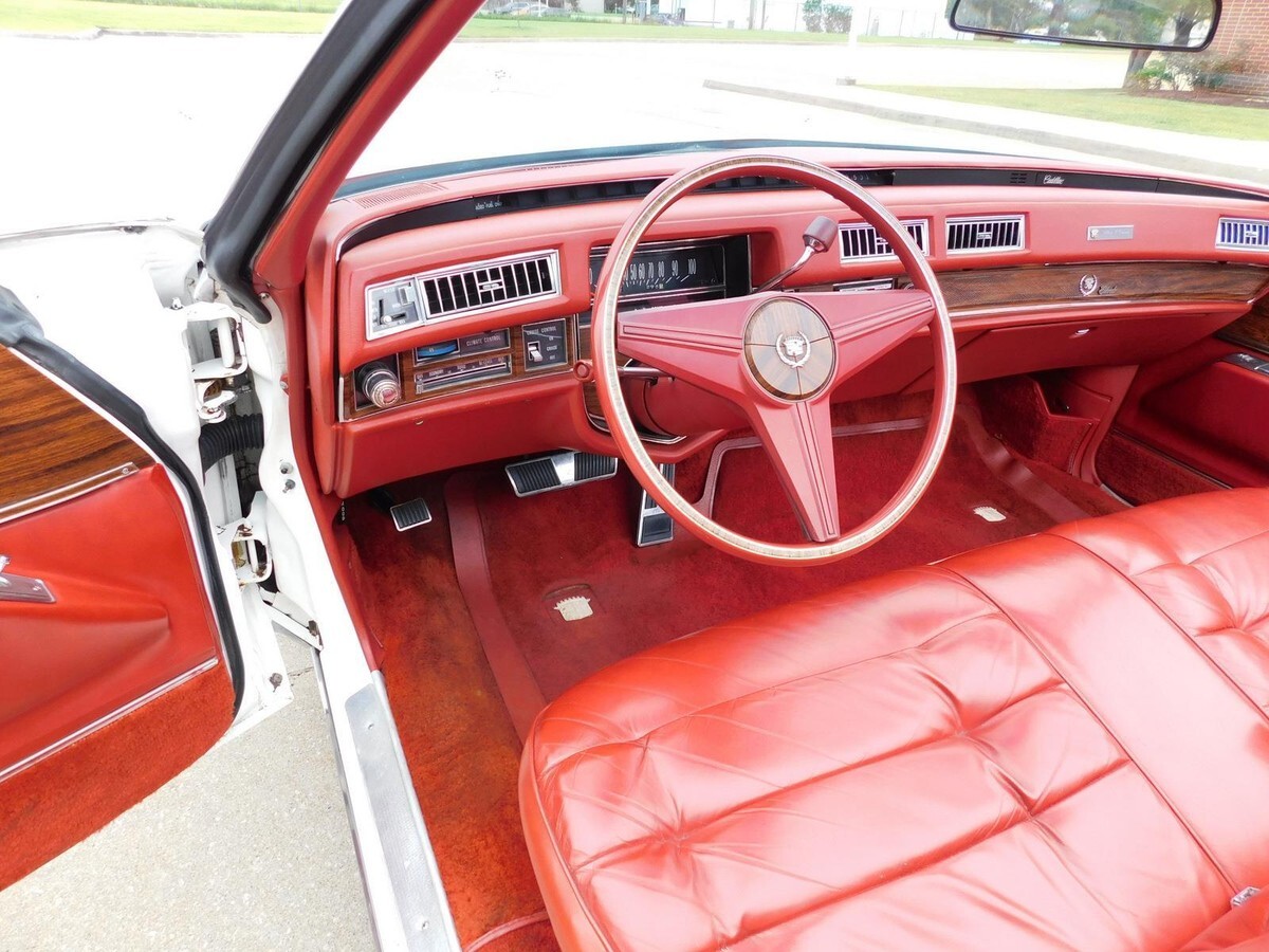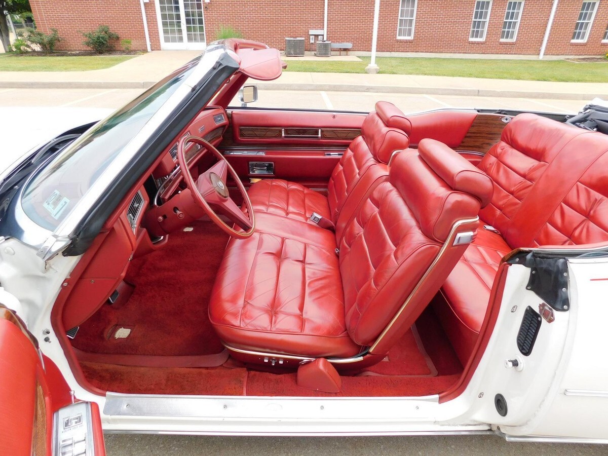 This 1976 Cadillac Eldorado Convertible was among the last of its kind to motor out of Detroit, it stands as an enduring example of luxury, and it was heavily promoted by General Motors as “The Last American Convertible.” The 500 Cadillac big-block V-8 engine is mated to a Turbo Hydra-Matic 3-speed automatic transmission that works well with power steering and brakes for effortless motoring nationwide or around town. Cotillion White paint complements the long sweeping lines of the Eldorado body, and lowering the white pushbutton power convertible top reveals a Dark Firethorn red interior with leather upholstery and wood-grain insets over a plush carpet. Power-operated windows, locks and an antenna join air conditioning with automatic climate control and signal-seeking AM/FM stereo for convenience and entertainment. The Eldorado waits for its next driver to adjust the tilt steering wheel and set the cruise control for maximum luxury per hour.