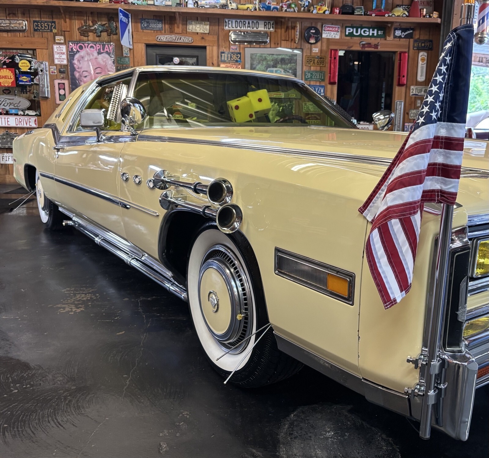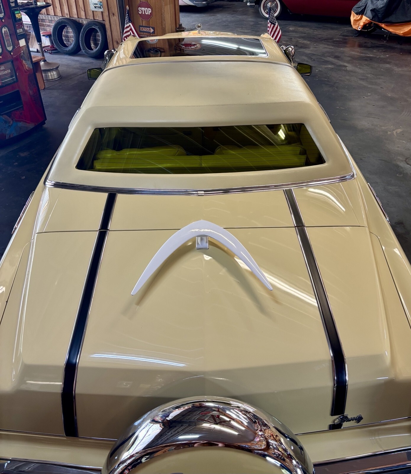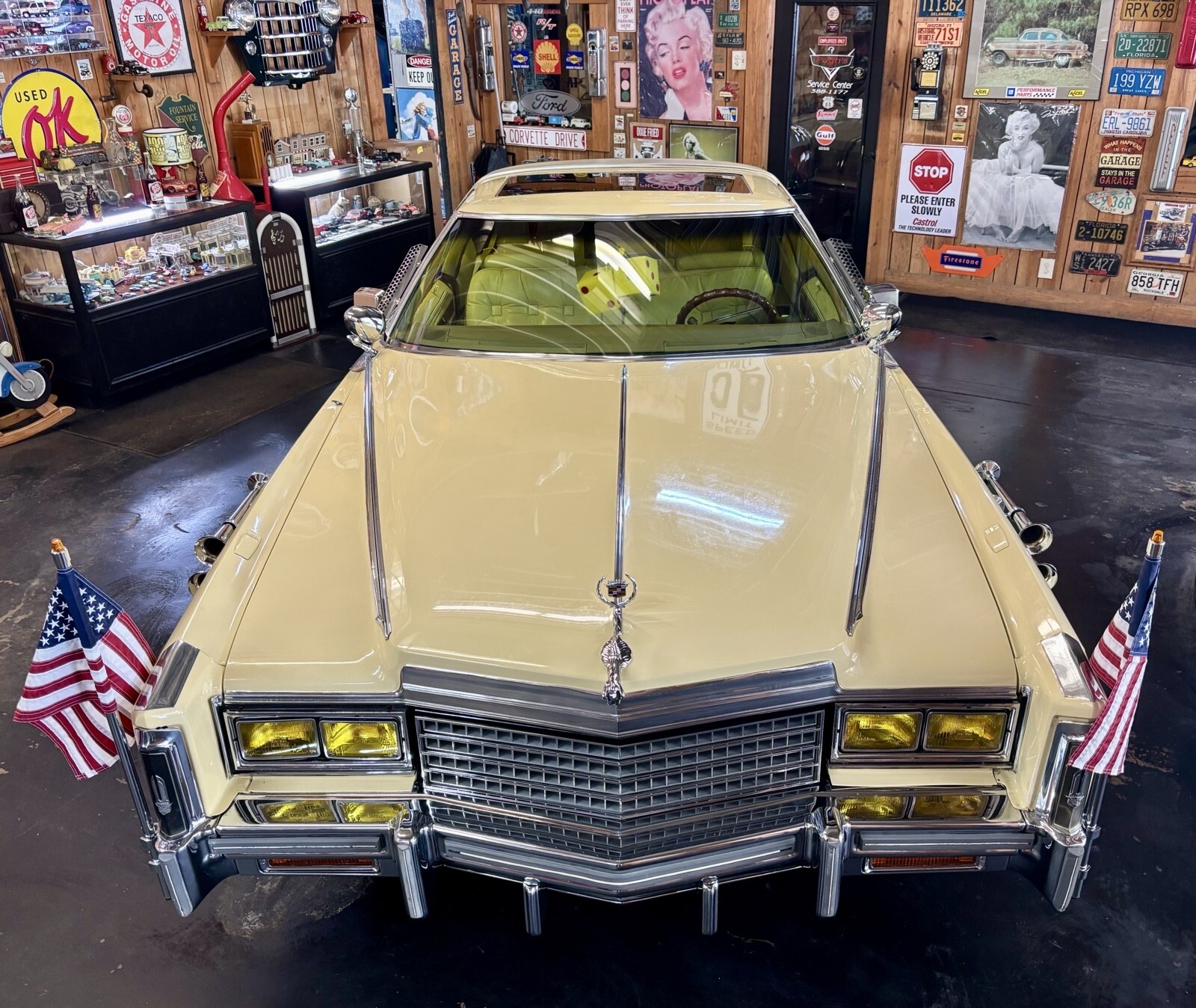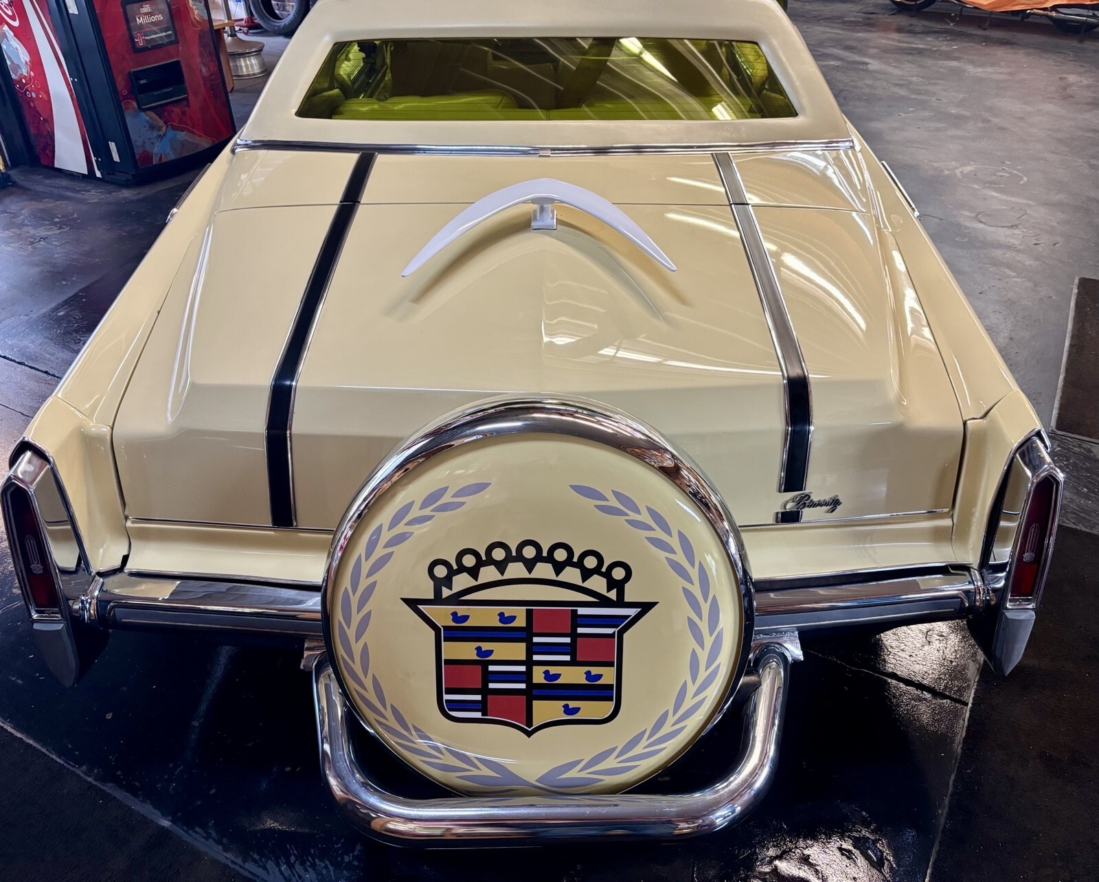 Colonial Yellow with Sierra Grain Antique Yellow with wood grain accent interior. Optional color matched padded vinyl roof and sliding Astro roof. Other options include: tilt/telescopic steering column, cruise control, a factory GM AM/FM stereo with CB radio (non-operational, has working Bluetooth stereo in glove box) and a driver mirror ambient temperature thermostat. Other options included a rear window defogger, and automatic headlight dimmers. The Biarritz package itself added unique script, body chrome moldings, and accent stripes to the standard Eldorado.