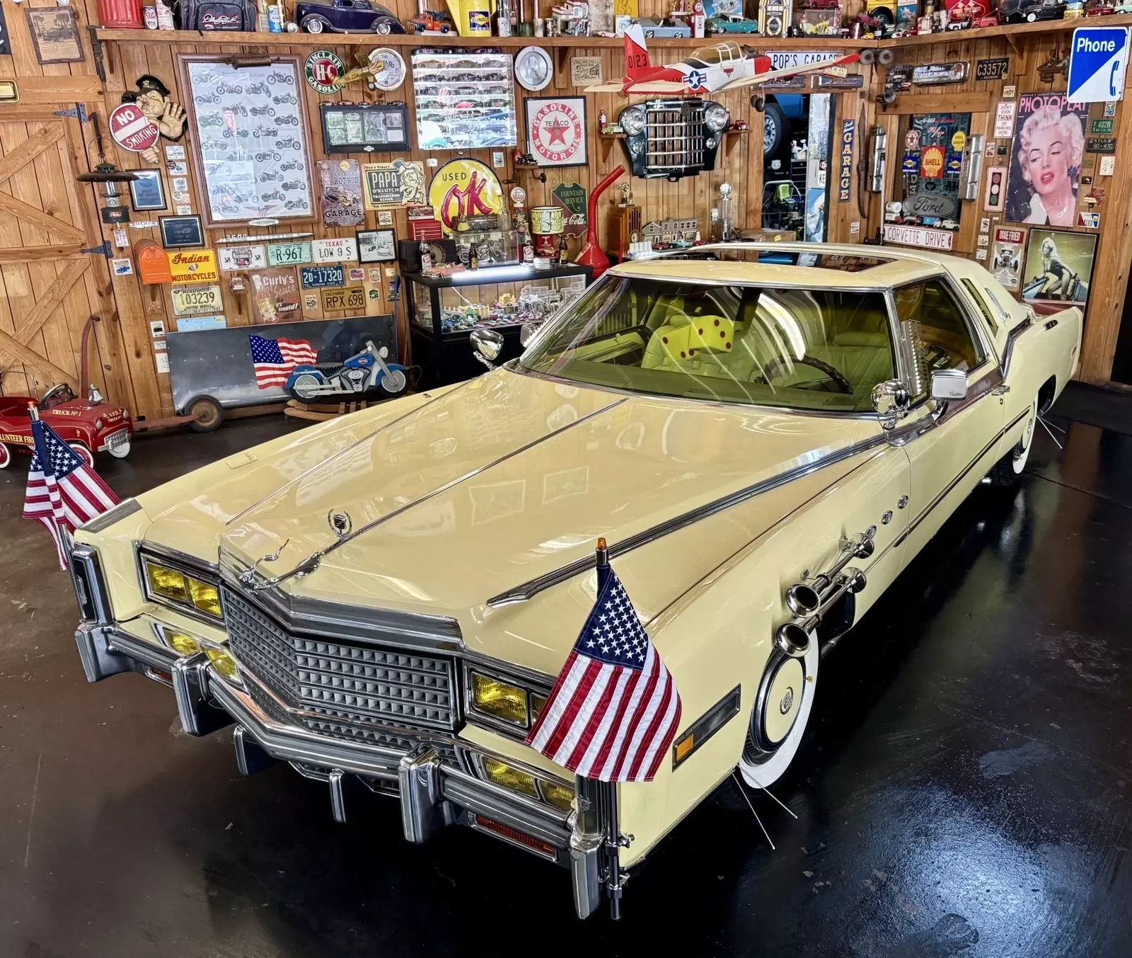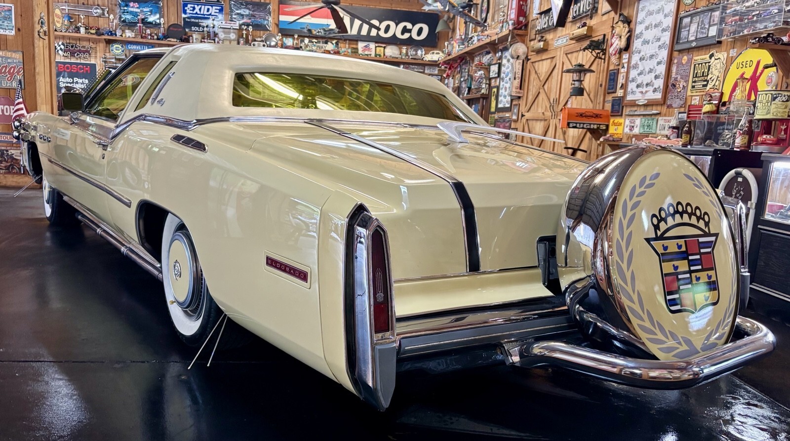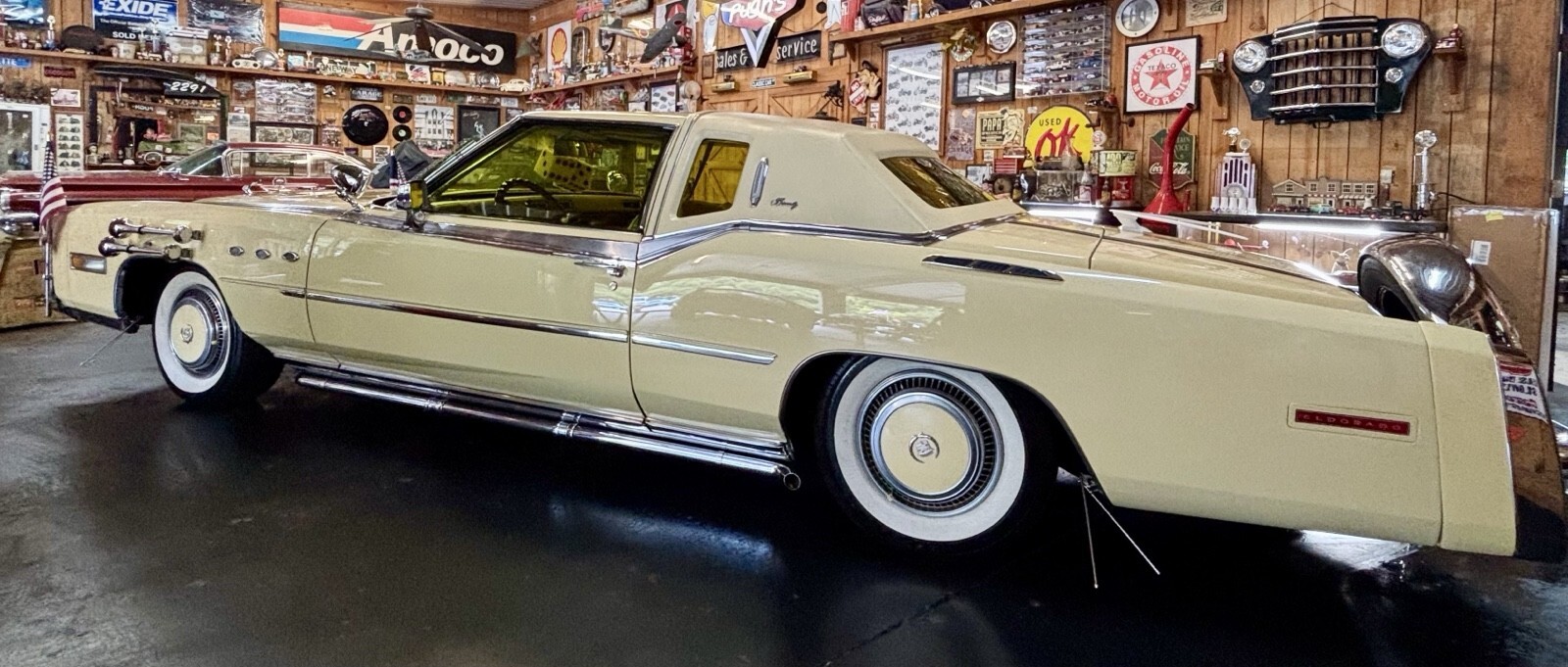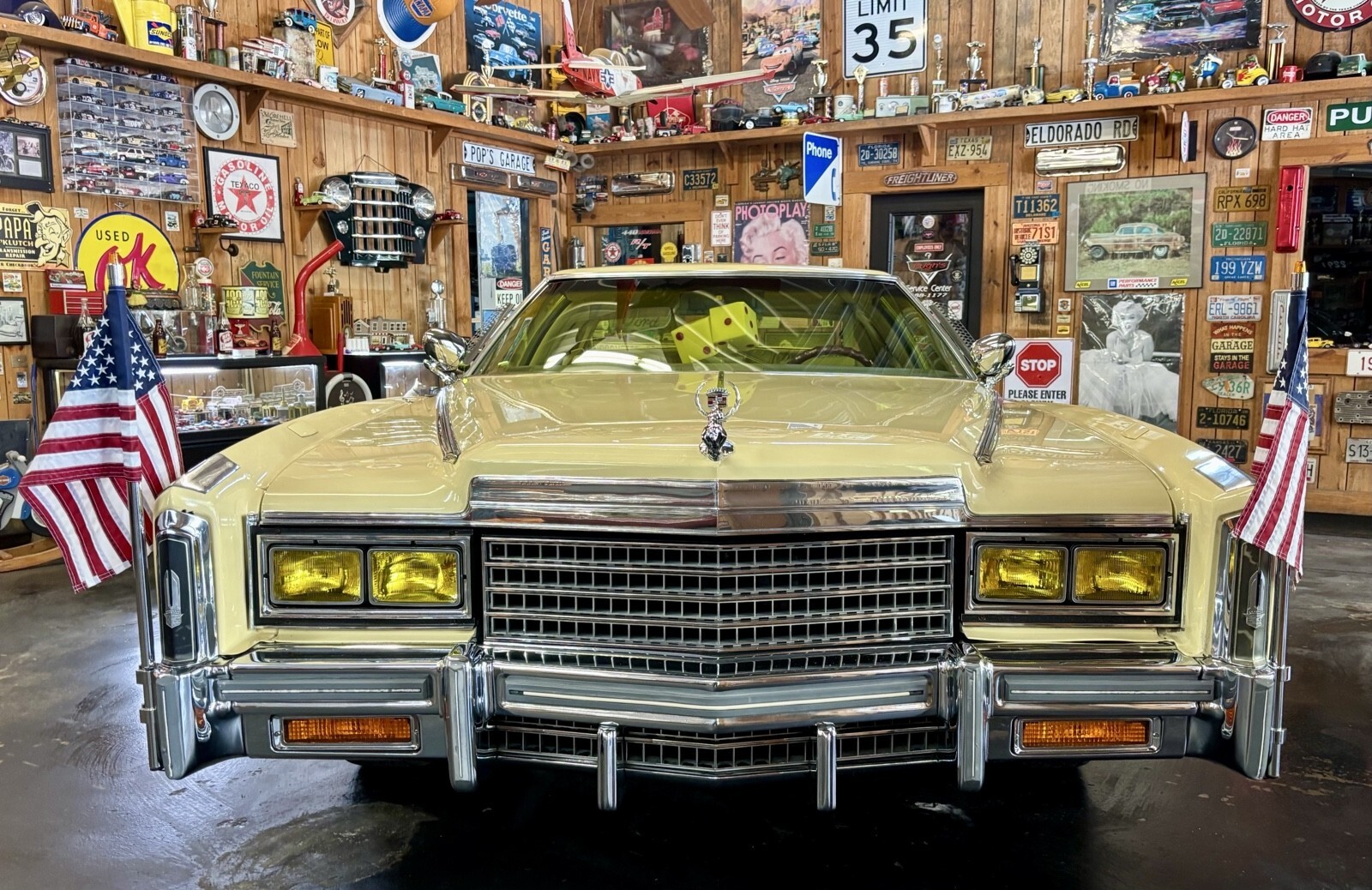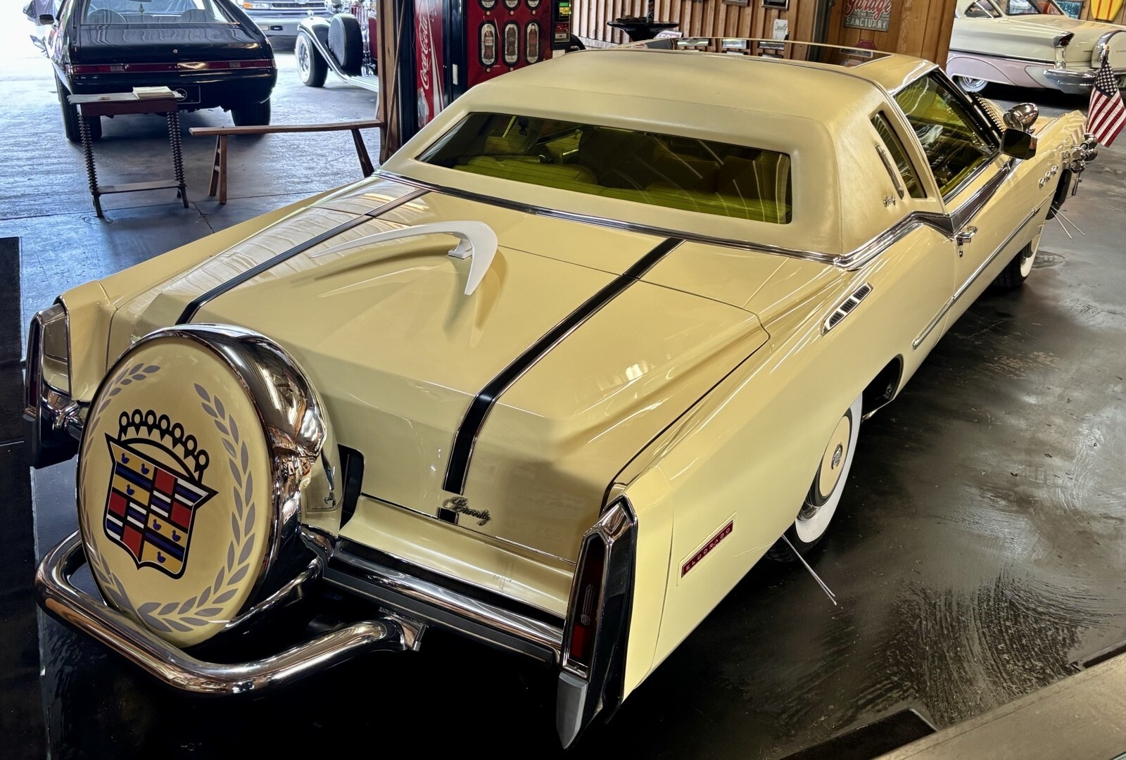 Colonial Yellow with Sierra Grain Antique Yellow with wood grain accent interior. Optional color matched padded vinyl roof and sliding Astro roof. Other options include: tilt/telescopic steering column, cruise control, a factory GM AM/FM stereo with CB radio (non-operational, has working Bluetooth stereo in glove box) and a driver mirror ambient temperature thermostat. Other options included a rear window defogger, and automatic headlight dimmers. The Biarritz package itself added unique script, body chrome moldings, and accent stripes to the standard Eldorado.