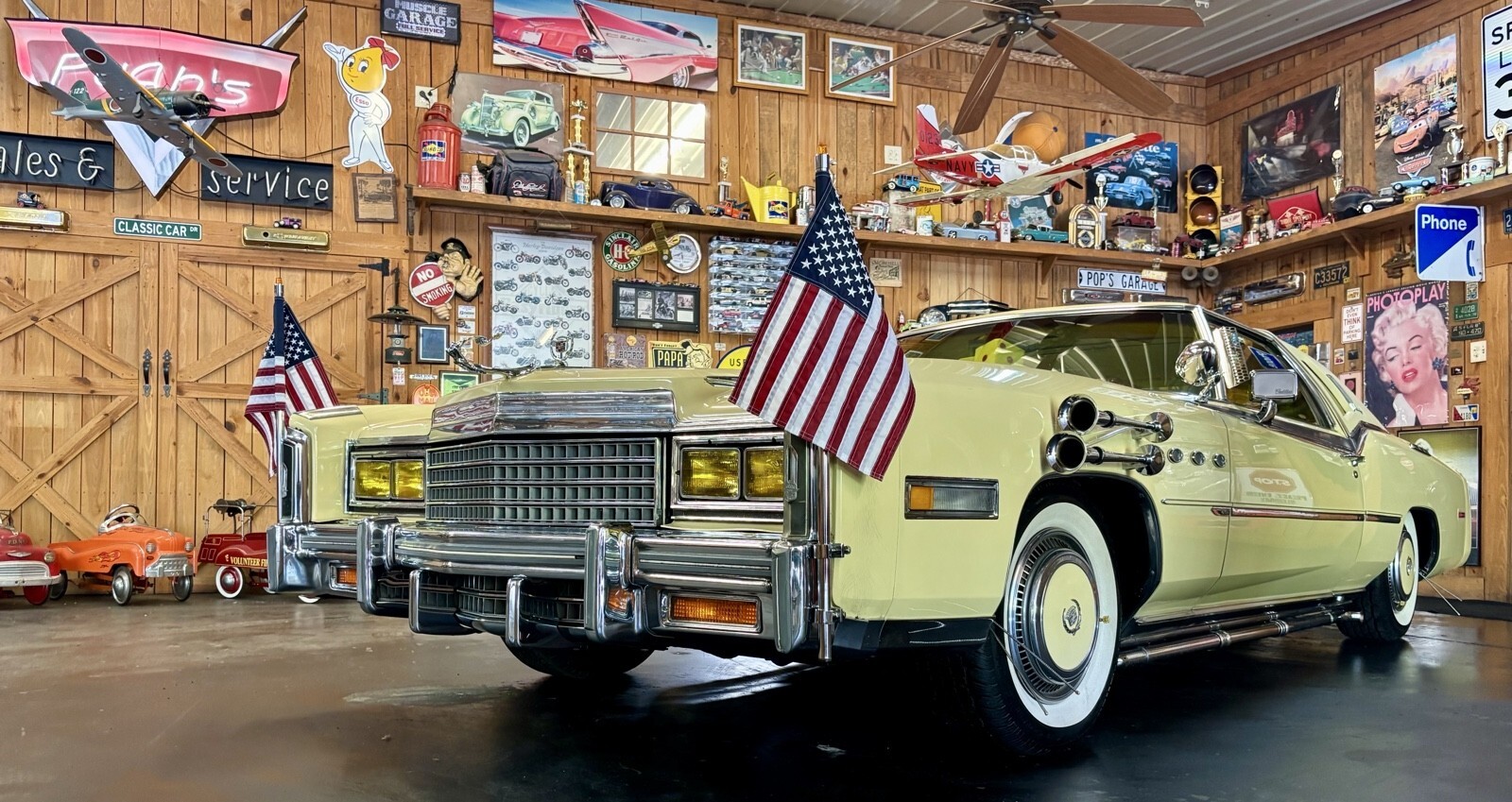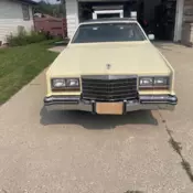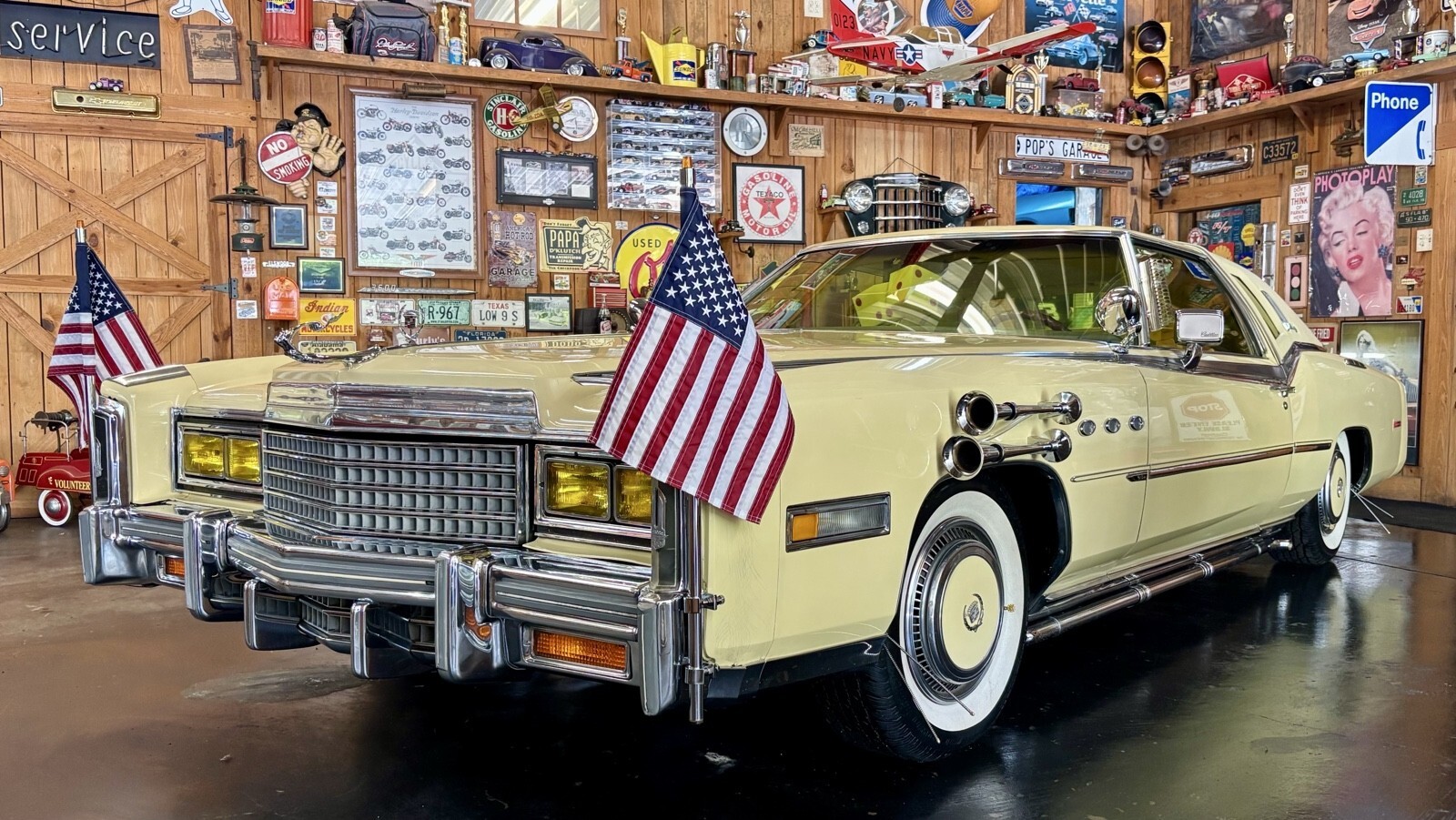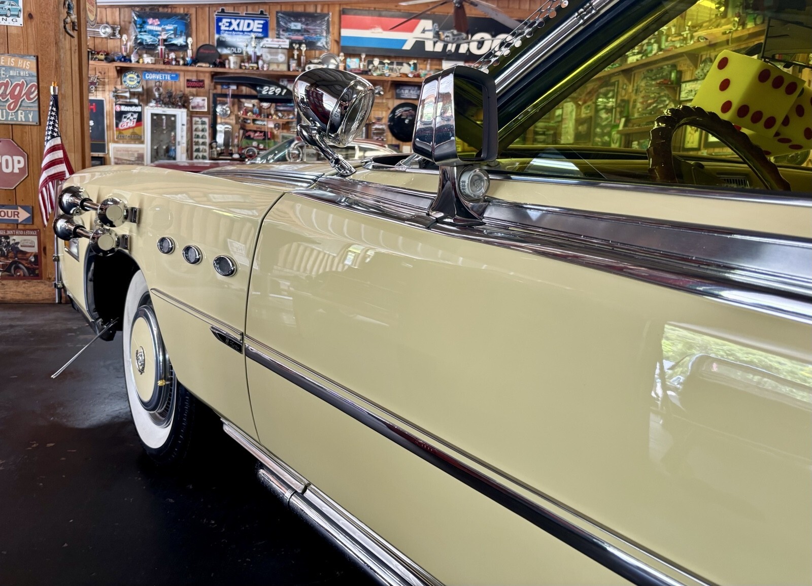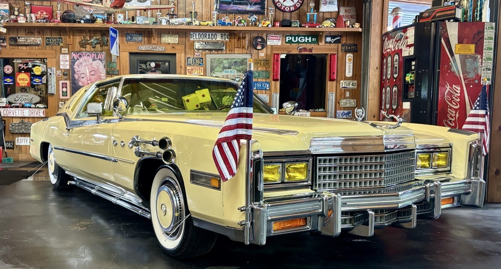 Colonial Yellow with Sierra Grain Antique Yellow with wood grain accent interior. Optional color matched padded vinyl roof and sliding Astro roof. Other options include: tilt/telescopic steering column, cruise control, a factory GM AM/FM stereo with CB radio (non-operational, has working Bluetooth stereo in glove box) and a driver mirror ambient temperature thermostat. Other options included a rear window defogger, and automatic headlight dimmers. The Biarritz package itself added unique script, body chrome moldings, and accent stripes to the standard Eldorado.