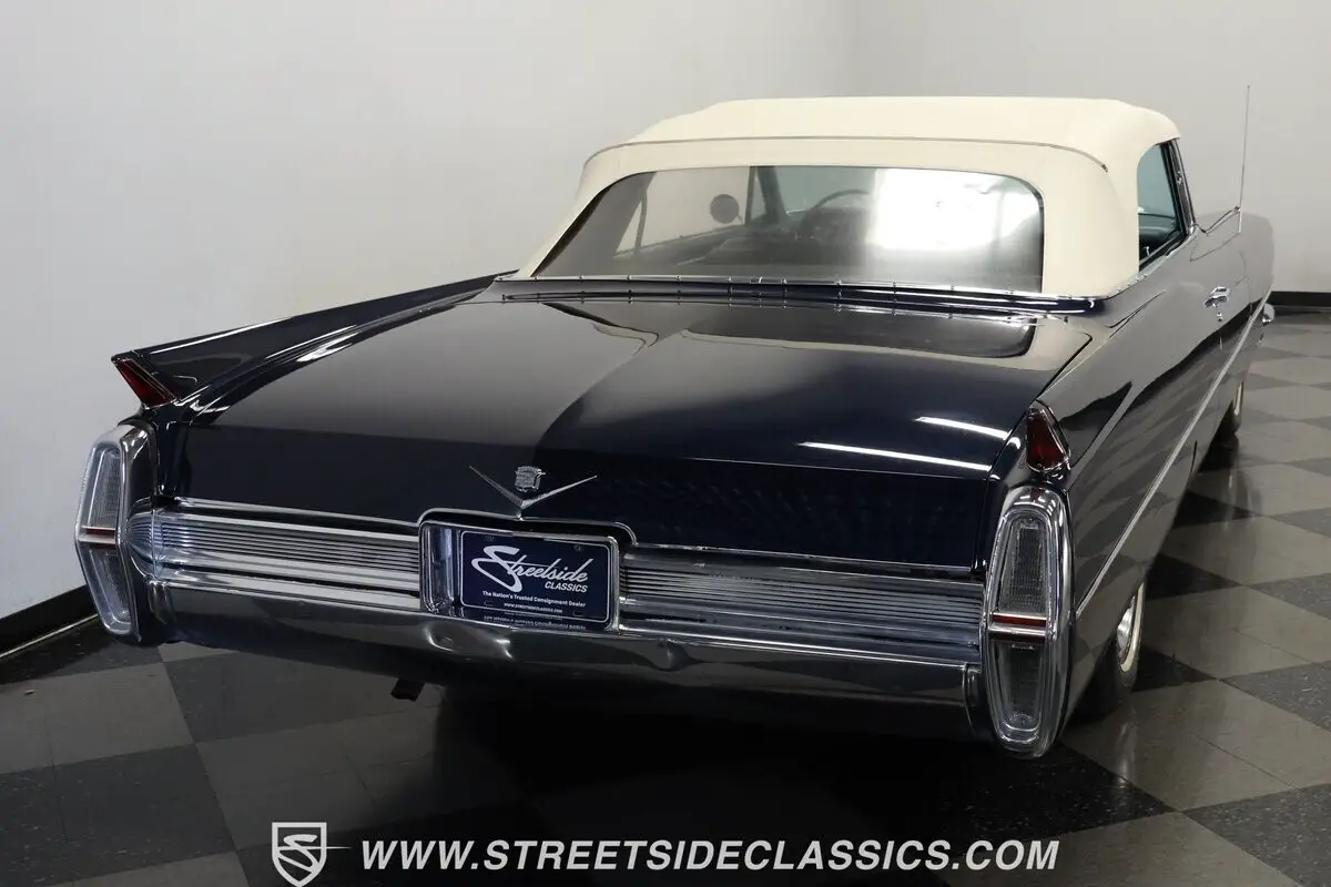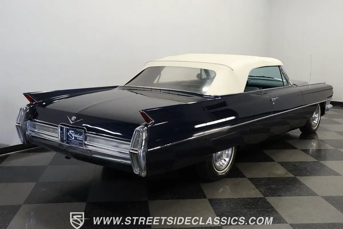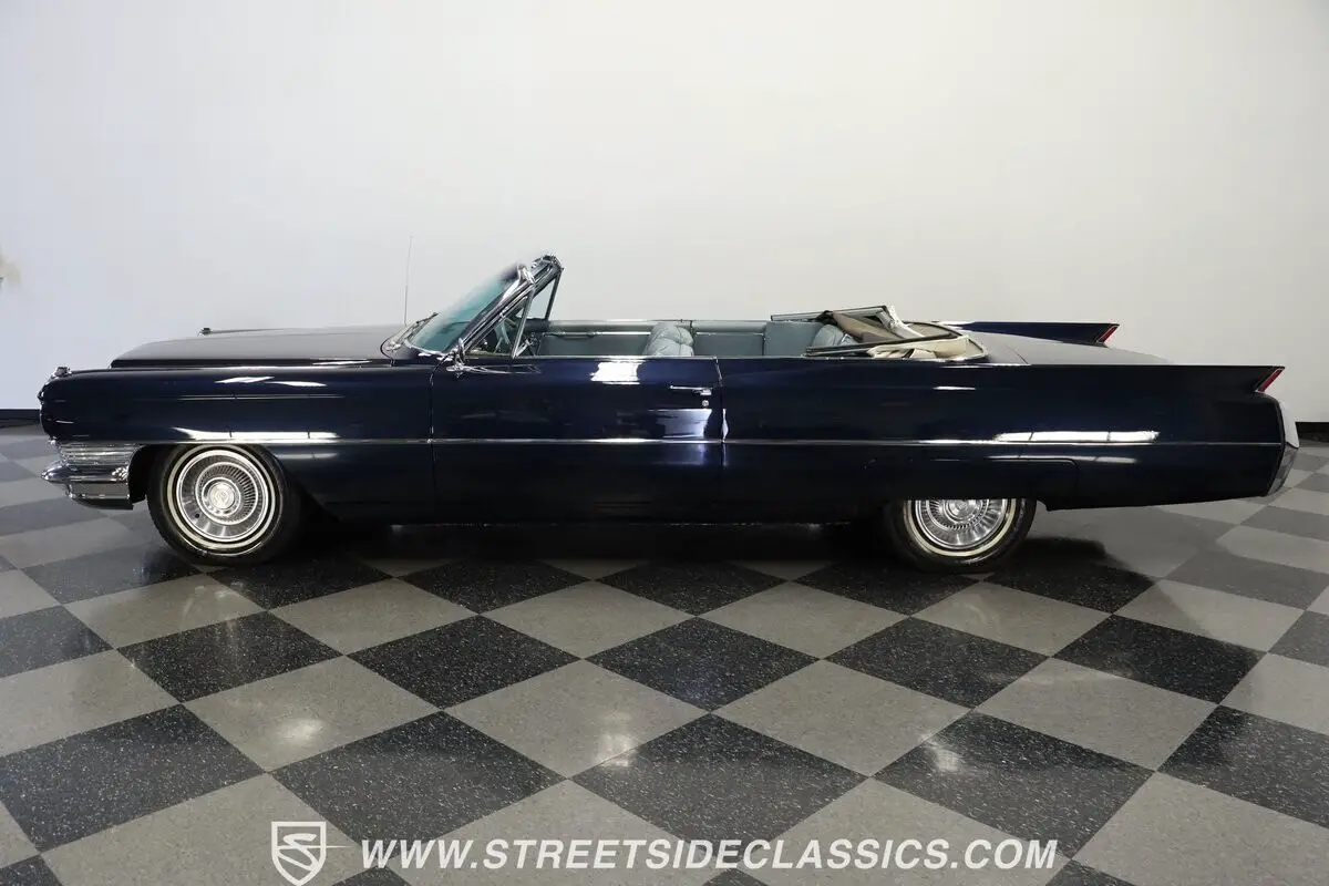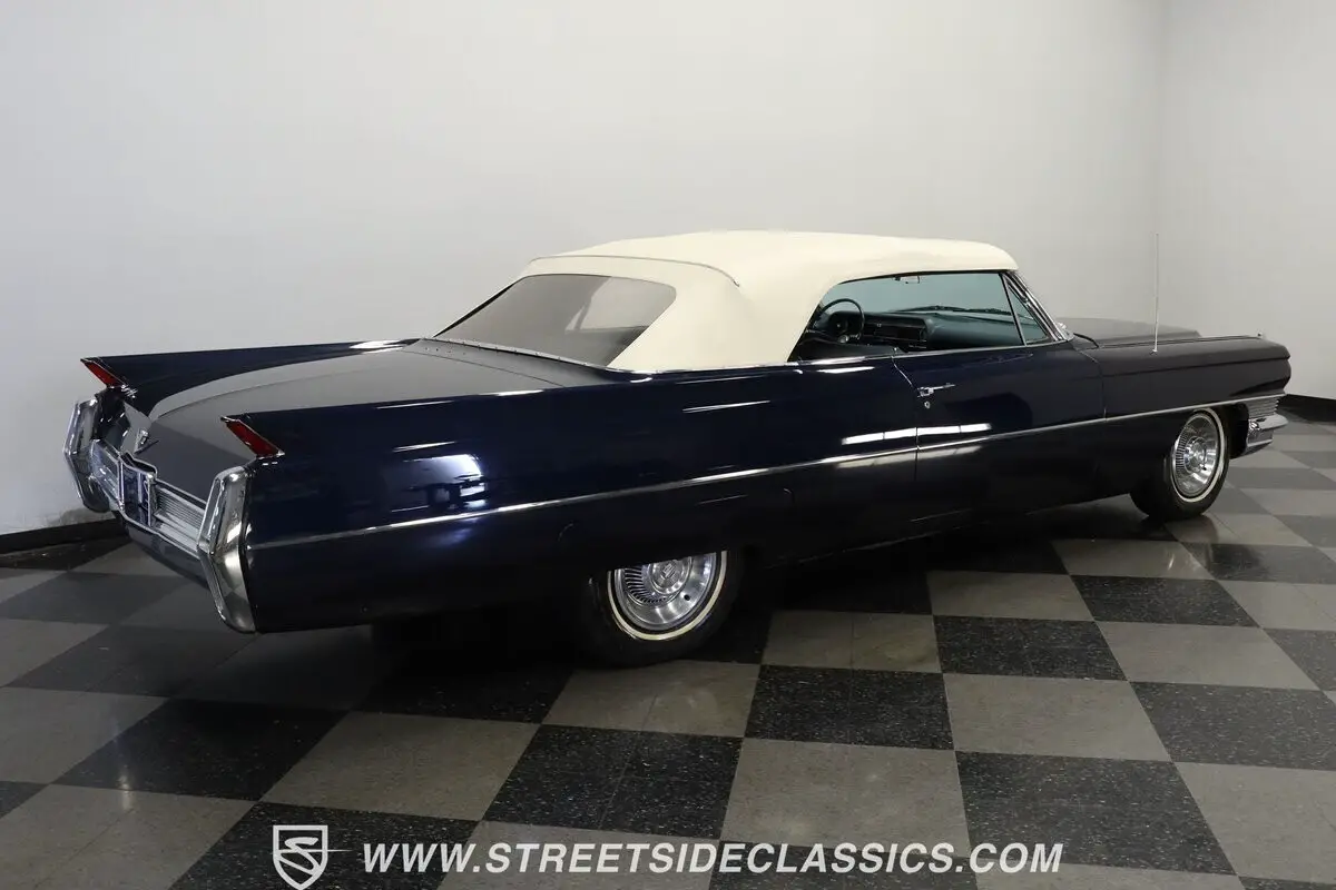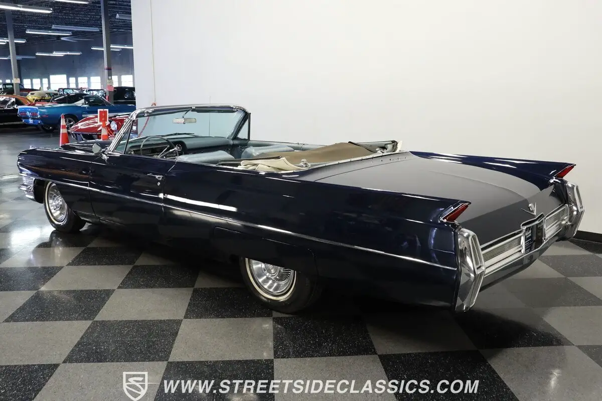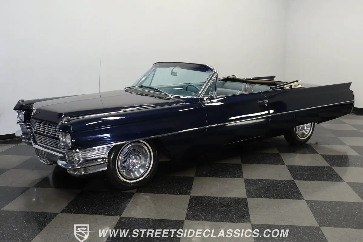 Massive tailfins mark this 1964 Cadillac DeVille Convertible as part of an iconic American design language that reached its culmination during this model year. The Somerset Blue metallic finish covers this luxury cruiser's expansive body panels with a rich, reflective surface that plays with light across its considerable length. Chrome bumpers and trim pieces add brilliant contrast against the blue paintwork, while the white vinyl power convertible top folds away for open-air luxury. Fender skirts enhance the flowing lines, and 15-inch Cadillac hub wheels with 235/75R15 whitewall tires anchor this grand machine to the pavement with period-correct style.