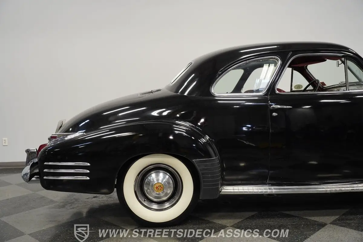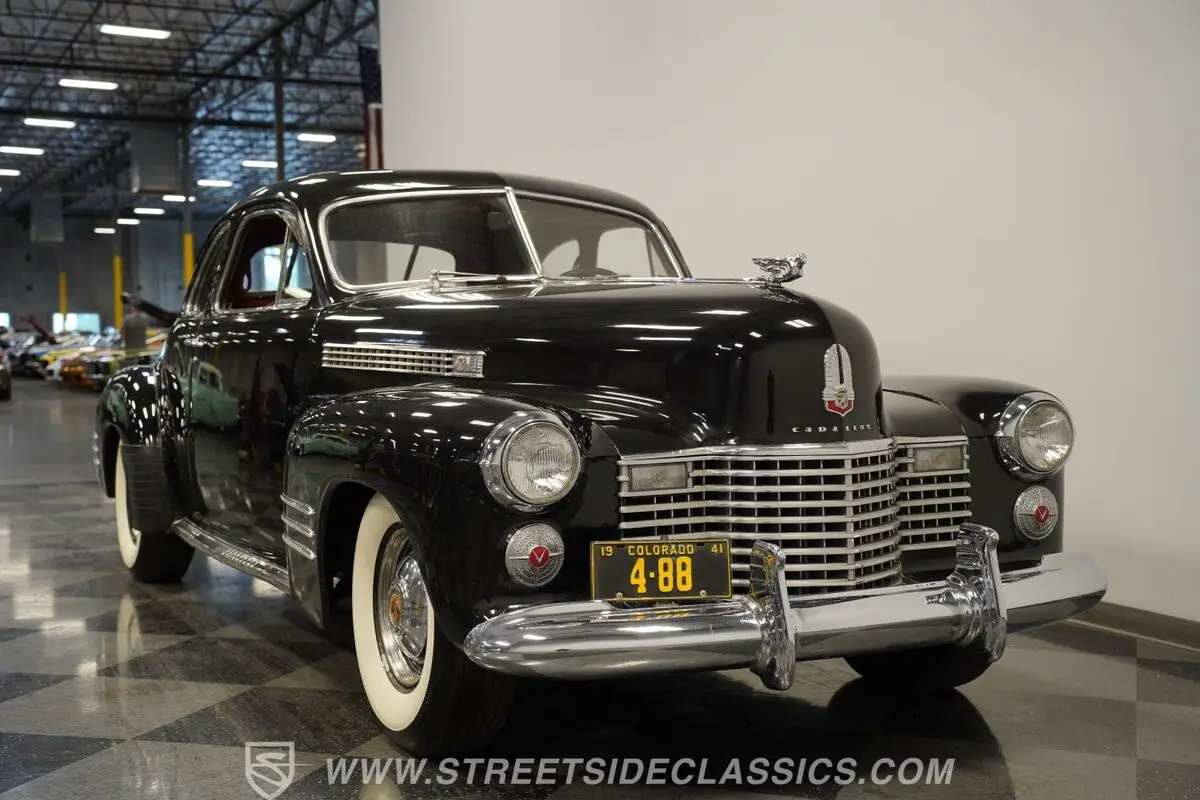 Vintage elegance defines this 1941 Cadillac Series 62 Coupe, a masterful display of pre-war American luxury draped in black paint. Bold chrome adorns the substantial front grille and bumpers, displaying the luxury expected of GM's flagship brand. Every angle of this coupe speaks to Detroit's golden age craftsmanship, while the classic body lines flow elegantly from front to rear. The dignified profile sits on 15" steel wheels with factory-style center caps wrapped in L78-15 Coker Classic tires. Original glass