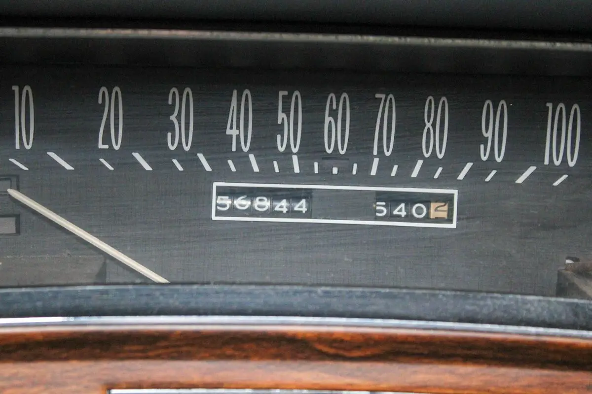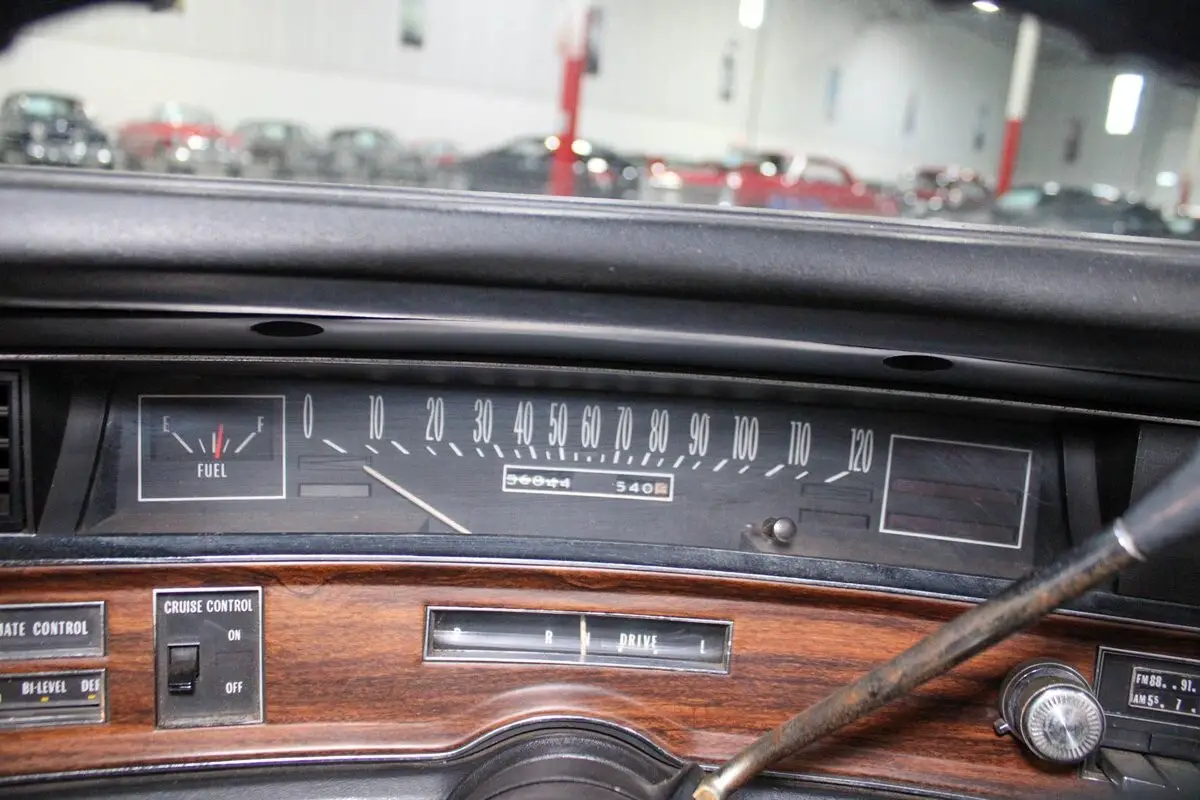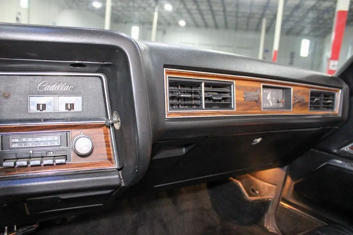 Inside, the cabin reflects Cadillac's luxury-oriented approach, with black leather seating, woodgrain accents, and generous proportions for both driver and passengers. Additional features include an AM/FM stereo, a spacious trunk with a spare tire, and whitewall tires mounted on Cadillac chrome wheels. With its size, style, and unmistakable presence, this Eldorado is a head-turner wherever it goes.