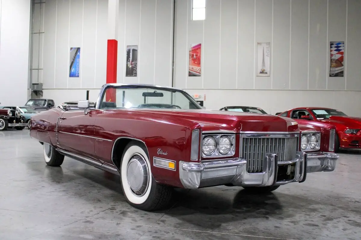 GR Auto Gallery is pleased to present this 1972 Cadillac Eldorado Convertible, an unmistakable icon of American luxury. Finished in Maroon with a Black leather interior, this classic drop-top captures the bold styling and presence that Cadillac was known for in the early 1970s. Power comes from Cadillac's massive 500 cubic inch V8 engine paired with an automatic transmission, delivering effortless cruising power. This Eldorado shows 56,800 miles