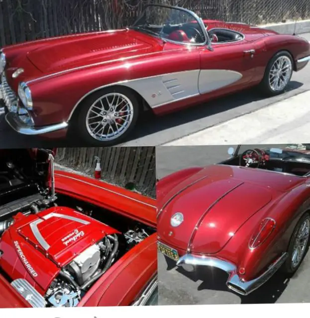 1958 Corvette RestomodDrivetrain: Edelbrock Supercharged LS3,with Ceramic coatedheaders,cold air intake American powertrain T56 6 spd Manual transmission,C4 front and rear suspension with 4 corner polished coil overs,Willwood 6 piston disc brakes Aluminum radiator with electric fan Electric power brakes with electric power steering Martz chassis with Power rack and pinion.Interior:Custom leather wit, dakota VHXgauge, 6 speed short throw shifter,bluetooth stereo (all new trim etc)Exterior:Custom crystal corvette (2015) tint redcolor with Merceds Grey Cove,All new Chrome,lights,bumpers,speers,hood latches,door handles