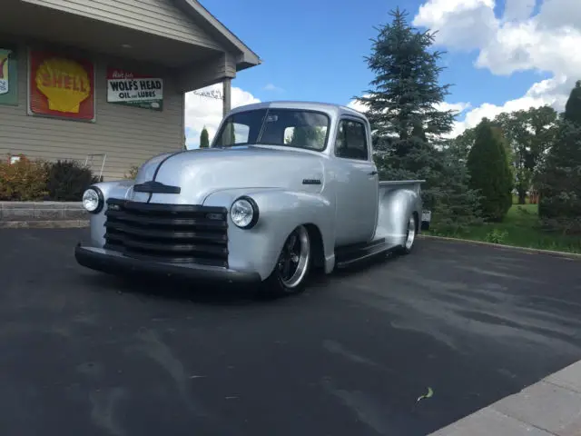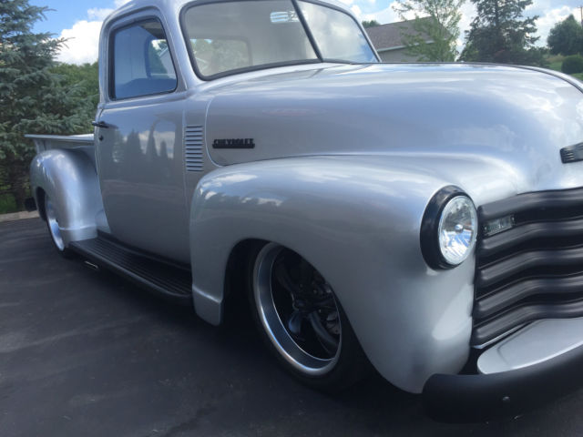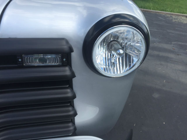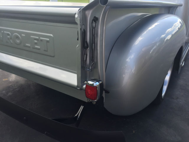 The entire truck was disassembled and every part was painted individually. Most of the parts other than the cab were dipped in a solution that’s takes them to bare steal. Everything on the truck was epoxy primered and base cleared with a Sickens paint in which the silver is the same GM Silver that the new trucks are and the grill, running boards, headlight bezells, Chevy emblems, front and rear bumpers were all painted with a satin black paint by Sickens as well. The entire bed is brand new including fenders, bed sides, tailgate and oak bedwood stained onyx black with 4 coats of polyurethane on both sides. New chains powder coated black. The running Boards are new and the front grill is new as well.