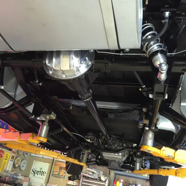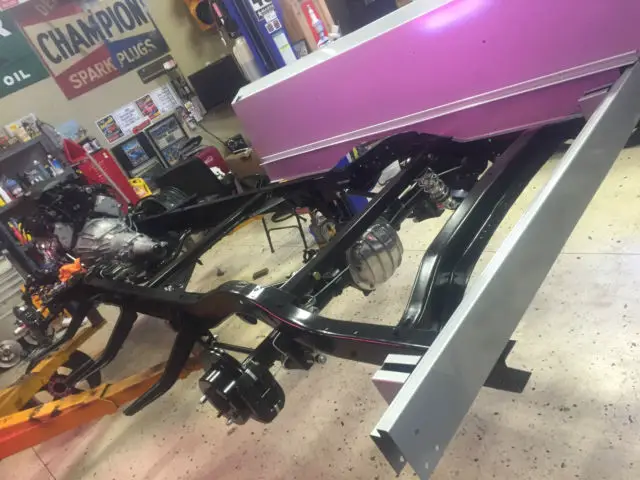 Original Frame has been modified with a new TCI Mustang II front end and has had a 4 link welded in in the rear to help put the power to the ground. It has QA 1 adjustable coil over shocks on all 4 corners. The frame has been completely sandblasted, epoxy primed and then painted with a single stage PPG gloss black paint along with all suspension parts.