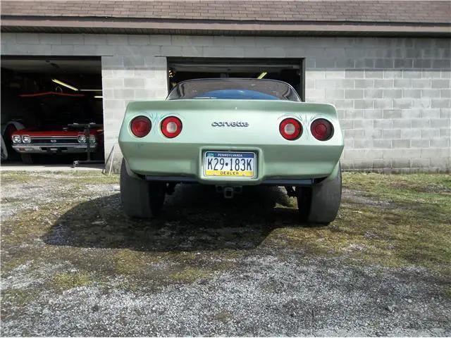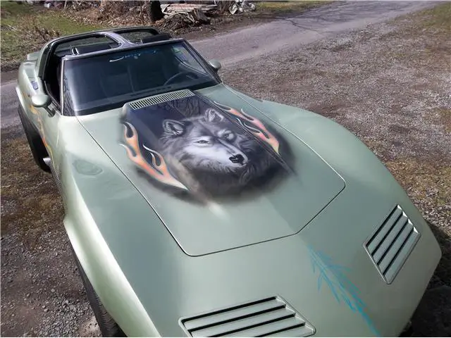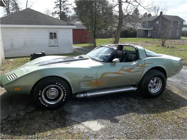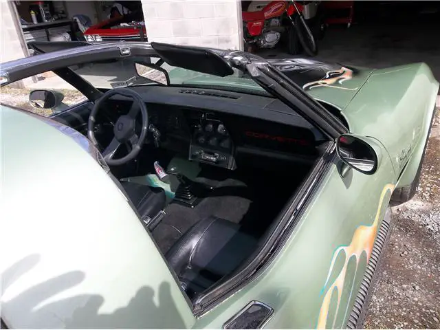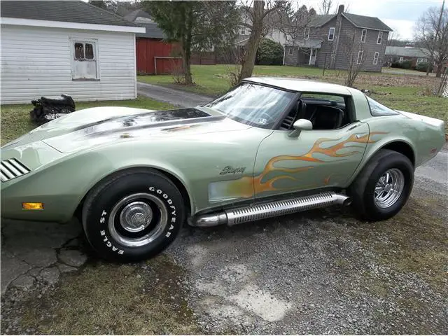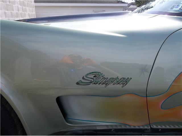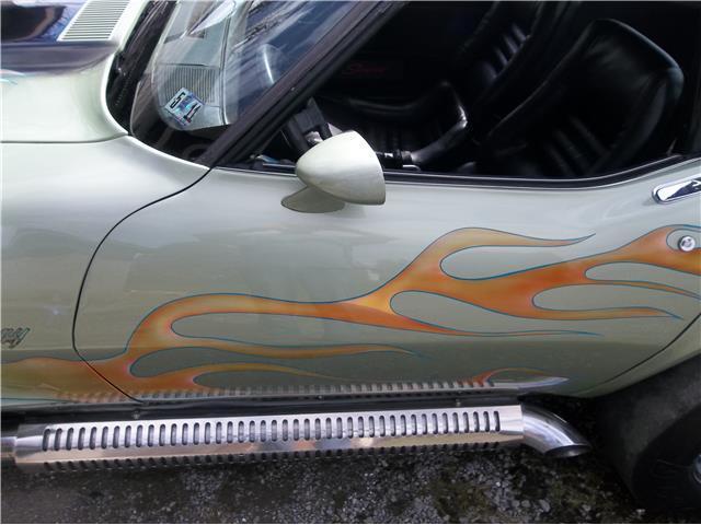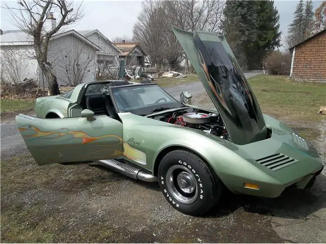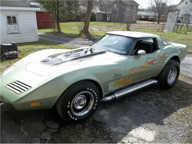 What we have here for sale today is a blast from the past a 1974 Corvette with a 1980 body it is vind and titled as a 74 there was over 5 years worth of work put into this car in customizing. let me start off by saying this car is absolutely a piece of art and gorgeous. it is painted base coat clear coat sour apple green with custom painted flames and airbrushed wolf on Hood the paint job on this car shines like glass. is powered by a 355 that runs super strong. cars also equipped with a 4 speed transmission with new clutch pressure plate and throwout bearing. car is equipped with a straight axle Chevy posi rear end.the interior is in fantastic shape all weather stripping and rubber moldings is in great shape no leak. the car has been freshly tuned and gone through from top to bottom brake system has completely gone through. car has old school polished aluminum valve covers new master cylinder cap new distributor cap rotor plugs wires battery alternator belts electric fan. power windows that function as they should all body lines on this car are fantastic this is a must-see. wheels on back of car do not go with it I have the stock ones that Match the front tires and rims. cars also equipped with air shocks the rear can be dropped down if desired. this car has been stored the majority of its life inside dry heated garage car is 100% rust free.if you were looking for a classic Hot Rod straight out of the eighties this is the car for you no disappointments. I encourage you to come down and check it out in person the pictures don't do the paint job any justice and feel free to test-drive it once again this will be a no-reserve auction car will go to the highest bidder thank you for your time and good luck.