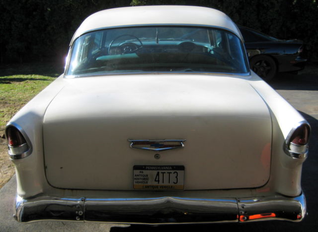 You are bidding on a 1955 Chevy Bel Air 2 Door Sedan (1011D) that has great potential. I purchased it to make an American Graffiti tribute car. I was driving it until this past cruise season ended then pulled the running 4 bolt main 350 engine to install a 427 motor I heard running strong when I purchased it to put in this car. My plan was to repaint it back to factory Onyx Black a tribute to American Graffiti. (*this car is a rarely found 585 Onyx Black factory car). Have you been searching for a 1955 Bel Air? For your consideration.