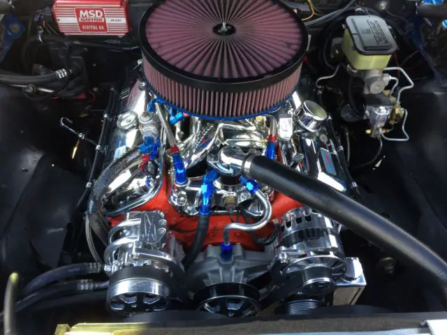 Big Block SS 396 built for speed and reliability, Muncie 4 speed M22 Rock Crusher transmission, vintage Holley 4 barrel double pumper 750 cfm, carburetor, Edelbrock air gap rpm intake manifold, MSD 6A ignition box and MSD HEI distributor, Griffin aluminum radiator with twin electric fans, new 1/2 stainless fuel lines and Holley fuel pump, GM electronically powered boost brakes with line lock, Hurst shifter with line lock button, powder coated Hooker long tube headers, "Vintage Air" air conditioner blows very cold, billet aluminum serpentine drive, Optima battery relocated to trunk, Gauges in center: fuel, oil pressure, water temp, volts, vacuum, oil temp. Too many modifications to list. Always garaged, car driven less than 5k miles in last 12 years. Engine sounds amazing with HP & Torque well over 400 hp. Everything works! Send email for video.