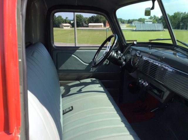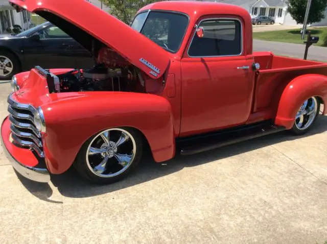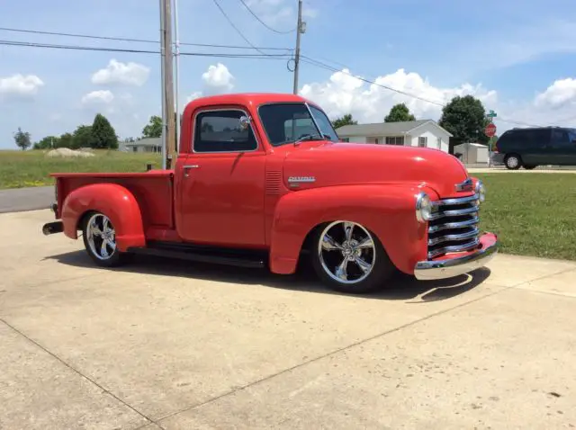 1950 Chevy 3100 1/2 ton short bed350 engine 350 turbo transmissionMustang front clip 8" Ford rear endFront power disc brakes drum in back manual steeringDuel Flowmasters exhaust all the way backNew (cold) Vintage air conditioning and heatNew Pioneer AM/FM CD with remote and speakersHas the mechanical fuel pump, but also has a new backup electric fuel pump behind seatNew Edlebrock 4 barrel carb on Edelbrock intake. I use premium gas.Grey leather interior with red stitchingInterior light works and all lights work goodAll glass is perfectAll gauges and turn signals workWipers work fineAluminum radiator with a thermos controlled electric fanBody all steel, running boards are fiberglassAll body lines line up good, doors shut perfectWindows are hard to roll up and downSmall rust spot on bottom lower passenger side front fenderWeathered oak wood in truck bedFloors solid, battery in cab under flood on passenger sideTruck could use paintNew 18" Ridler wheels and tiredTruck starts, idles, runs and stops goodAwesome stance just a great truckAlways stored in heated garageCustom cover comes with truckBid only what you can affordClear title and insured in my name and in my state of KentuckyNo warranties written, expressed, or implied. This truck is 67 years old.Shipping is the responsibility of the new ownerYou are encouraged to inspect or have it inspected at your expense