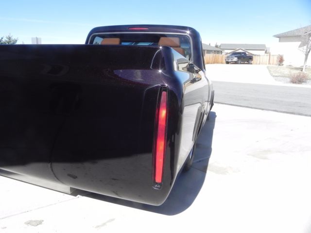 Grafted 2006 GTO drivetrain,firewall & floor, dash & consoleLS2 w/ 4L65E trans with approx 75K milesAir ride suspension w/ 2 air pumps frame mountedFour wheel disc brakesPosi rear endTubbed rear wheel wellsChanelled cab floor & bedC notched ChassisCustom InteriorPower windowsDoor poppersOne piece tinted side windowsA/CPower steeringFrame is powder coatedShaved bumper boltsShaved sidemarker litesShaved door handles and locksShaved drip rails and roof seamsShaved & molded rear tailgateShaved firewallFrenched in Cadillac tailitesFrenched in 3rd brake lite into roofMolded pu box into one piece2-toned spray in bedliner to match interior colorsAluminum driveshaftAluminum fuel tankRotisserie restoredLizard skin all under surfaces as well as inside cab sound deadnerNew rubbers & weatherstripsRear tire size 335/35/ZR17Front tire size 245/40/ZR17