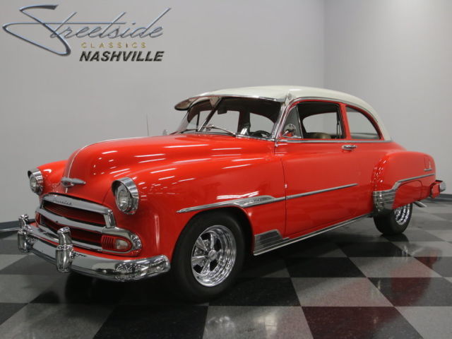 You stopped on this 1951 Chevrolet Styleline for the exact same reason why we fell in love with it, too. There was a lot invested to give this the perfect mixture of period-correct restoration and all the right upgrades. So while the cherry red paint grabbed you attention, the hot V8 and cold A/C interior are why you want to take it home.This two-door sedan makes a great first impression, and that all starts with the paint. The red is actually borrowed from a more modern Corvette shade. And when combined with the white, the two-tone strikes that perfect balance of providing a bold hue with a hint of sophistication. All of this is particularly true because there has been a lot of investment in a modern professional application of this color. And while this car has a better luster than what Chevy could provide in '51, this is the kind of bright presentation these classics have always had when you pictured them in your mind. Rivaling the paint for shine is the brightwork. It surrounds every piece of glass, artfully accents the whole profile, outlines the lower rear fender, and surrounds every exterior light. Plus, we know you've especially noticed it on the extended rear bumper with Continental kit. When all of this is so complete and mirror-like, you realize that you're looking at a labor of love. And you'll even love going over the details from the correct wide Chevy badge up front, to the sun visor. And that upgrade to iconic Cragar SS wheels is a nice little hint at the other sporty upgrades within.Soft leather bucket seats and a center console were never available from Chevy, and so anyone who opens the door will be instantly impressed with this pricey and comfortable upgrade. The tan leather here coordinates nicely with the carpeting, headliner, and custom door panels to create a nice uniform presentation. As you slip behind the custom steering wheel, the Corvette red on the dash goes nicely with this car's upgraded theme. The same goes for the upgraded Dolphin full gauge package. And because this is meant to be a comfortable cruiser that you can share with family and friends, you also get great features like a modern AM/FM/CD stereo and R134a air conditioning to stay cool while looking cool.Open the hood and you can see where some serious money was spent. That's a 350 cubic-inch crate V8, fully dressed with the bright Edelbrock air toper, valve covers, alternator, and pulleys. Plus, this performance upgrade has been enhanced further with an Edelbrock four-barrel carburetor and Edelbrock performance intake. There's plenty of reliable power churning out of this motor to make the dual exhaust howl if you really want, but there is also another side to this custom car. The mufflers can keep this car somewhat mellow, and instead just enjoy the evening cruising in your air-conditioned coupe while the TH350 three-speed automatic ticks away the gears with ease. There's also an aluminum radiator to keep your Chevy cool even in traffic. This is a power steering car, and up front there's an independent suspension with a sway bar and disc brakes. So this one could be a Friday night brawler if you like, but it's quite comfortable just being you all-day Sunday cruiser, too.This one comes with a full photos file and maintenance records, so you can take others on its transformation into such a cool custom cruiser. Complete cars like this rarely come up for sale, so don't miss out. Call today!!!
