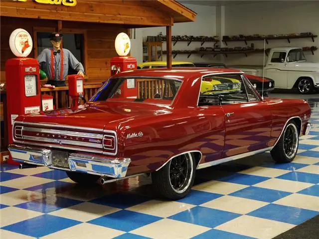 350 cui Chevrolet Small Block engine. 4 speed manual transmission. 12 bolt rear end. Painted Maroon exterior. Black / Red vinyl bucket seat interior. Power steering. Stock brakes. Flowmaster dual exhaust with manifolds and chrome exhaust tips. Edelbrock intake / carburetor. Chrome valve covers. Rear air shocks. New 18" Ridler 650 Black wheels with Nitto555 tires. True Malibu SS code 138 vehicle.