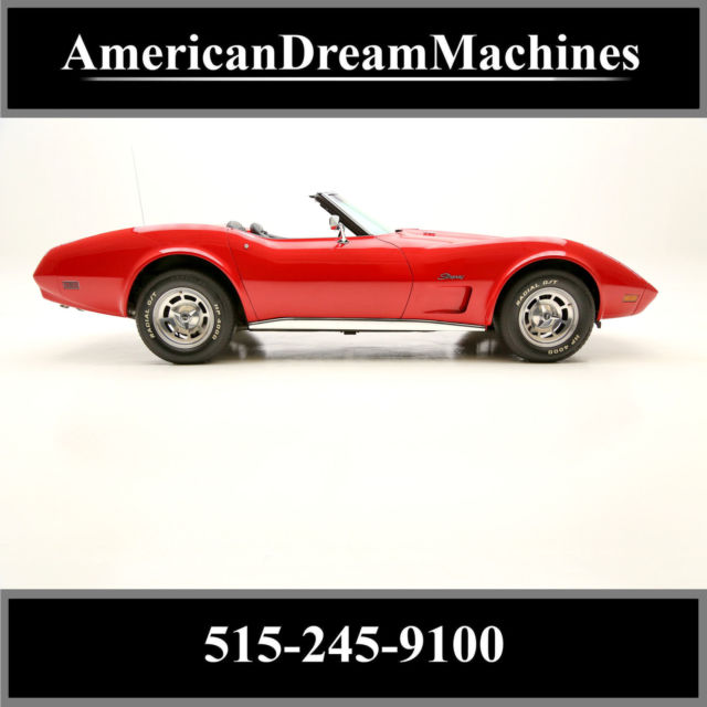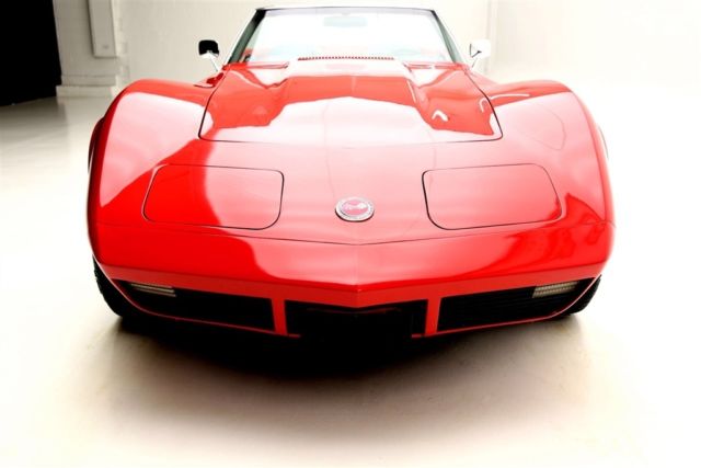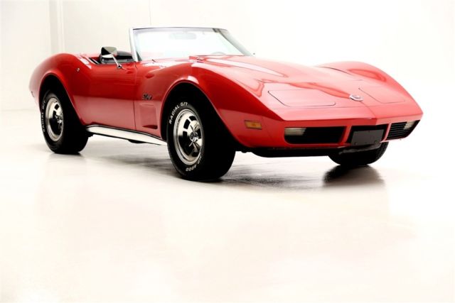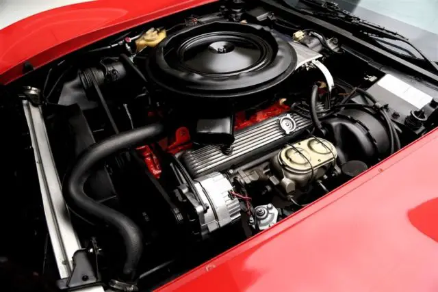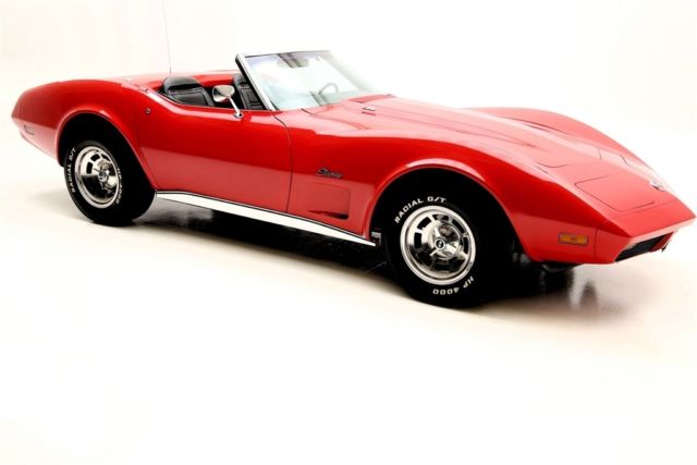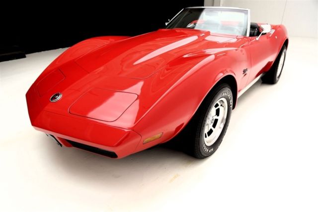 This red roadster is highly optioned and ready to put the top down and ride. The Miglia Red Corvette convertible has power steering, power disk brakes all around and air conditioning. Also it comes with a tilt and telescopic steering columinum, blue tooth AM FM CD stereo and electric windows. VIN has a T meaning it is an original L82. Paint is smooth, shinny and looks great. The rocker moldings, side mirrors, door handles, tail light lenses and windshield are among many of the new parts added. Panel fit looks good and the structure including the frame is very solid and in tact. The black interior has new seat covering, carpeting and the original pieces look great. Engine is a 350 with Corvette aluminum valve covers, factory dual snorkle air cleaner and a new tach drive distributor. Cooling is being taken care of by a new aluminum radiator. The transmission is a 350 turbo 3 speed automatic and original rear axle. Exhaust is passing through a new original style sytem and cast iron manifolds. The wheels are correct Corvette aluminums with spinners, white lettered tires and are in amazing condition.