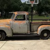350 cui Chevrolet Small block. Automatic TH350 transmission. 10 bolt rear end. Painted Porsche Amaranth Violet & Graphite Gray two-tone. Custom Gray bench seat interior with fold-down armrest. Front disc brakes. Power Rack & Pinion steering. Flowmaster dual exhaust with headers. Edelbrock carburetor. Aluminum radiator with electric fan. Chrome under-hood dress kit. Smoothed / Slicked / Painted firewall. Tilt column with LeCarra leather wrapped steering wheel. VDO gauges with Billet bezels. Power windows. Alpine AM/FM/CD stereo. Shaved handles, tailgate, and wipers.Tinted glass. Rear roll pan. Painted grille. Dual peep mirrors. New 18? Ridler Charcoal wheels.