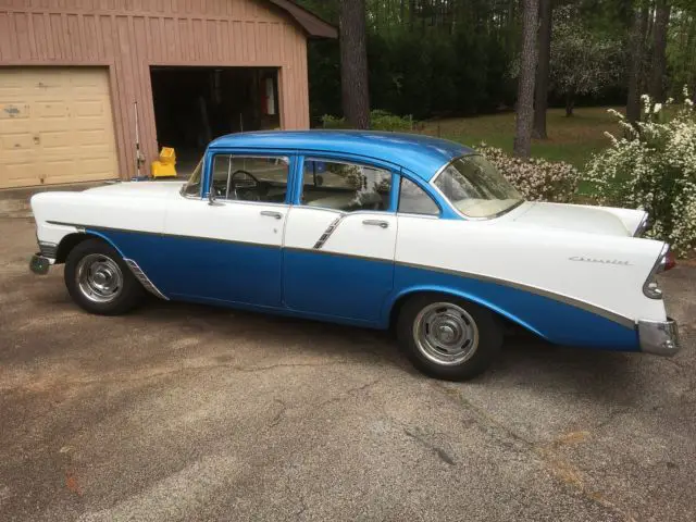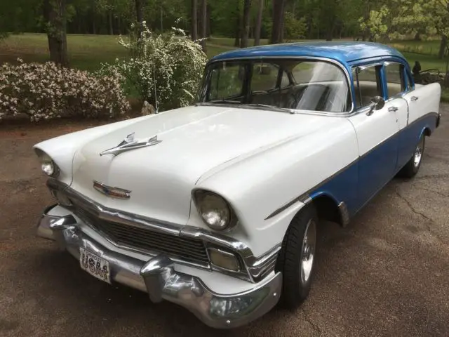 For Sale is a really solid 1956 Chevy 210 4 door. Their is little to no rust on this car. This baby runs and drives rally good. The interior is in good condition. the seats were covered a few years back to original the door panels and headliner are original. It has a new set of tires on it. Also has a brake up grade. The paint on the car is getting old and is beginning to blister up all over the hood has some evidence of a fire in its past. the fuel gauge is not working properly. The engine I was told was a 350 it has some oil leaks around the main seals. The transmission is a 3 speed on the column. The rear glass on the drivers side rear door is cracked all the other glass is good. I drive this car regularly it is not a garage queen. This car comes with a bill of sale only and tag registration Georgia is a non title state.