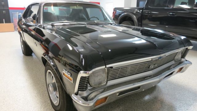 This 1971 Nova is a factory 4 speed car with power steering, power front disc brakes and A/C. The body is Perfect. The metal is solid, floors, doors fenders, etc. New quality paint, GM paint code 19, Tuxedo Black, new black vinyl top.