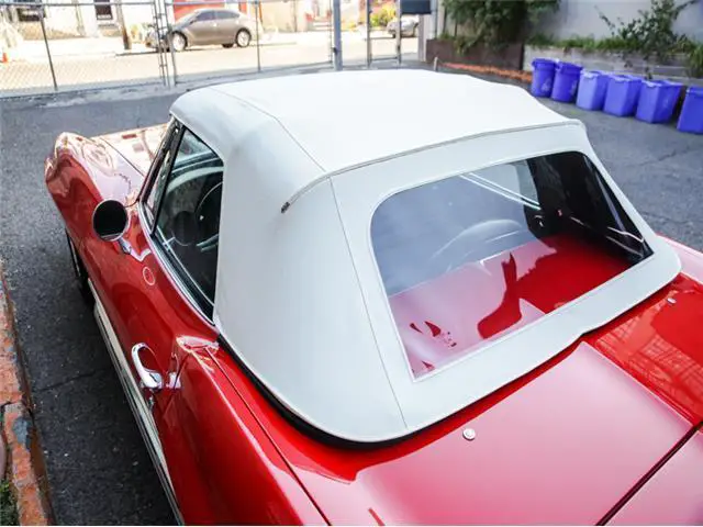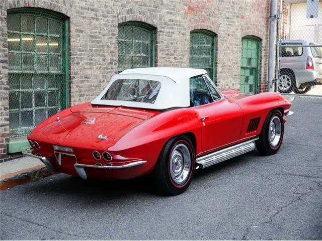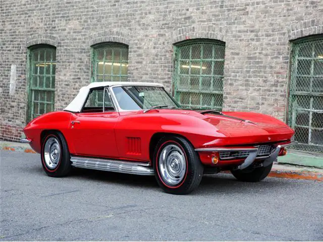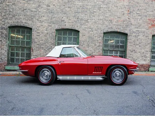 **Please contact us for a link to our complete photo set and all included documentation. **Whether you are a muscle car fan or not, the Chevrolet Corvette has always been a car that the enthusiast respects and admires to some degree. Since their genesis, they have been stunning automobiles to look at, equipped with robust V8 engines, and rear wheel drive which is the recipe for many great sports cars. It’s coming about was actually not even intentional in terms of being a production c...ar. GM had built the Corvette as a show car for the Motorama display at the 1953 New York Auto Show. However, it caused such a strong reaction from the public, that GM decided to induct it into their production line and thus the Corvette was born.There have been many variants of the Corvette produced since 1953 but we are going to focus on the second generation, referred to as the C2 (1963-1967). With this new generation of Corvettes also came the “Sting-Ray” name, featuring fiberglass body panels, a sharpened exterior design, and a smaller wheel base. In 1965, GM upgraded the brakes to four-wheel discs, added three side vents to the front fenders, made side exhaust pipes an option, and introduced a series of new power plants. Essentially, there was the 327 Small-Block, and 396 and 427 Big-Blocks which you could equip with different carburetor and fuel system set-ups. The most desirable power plant being the 427 which brings us to this example.On offer is a 1967 Corvette Stingray Convertible, chassis number 194677S101010, engine number T0909LL7101010, sporting a well-kept older restoration that was reported to have totaled $108,000 in costs. The restoration was completed in Ontario, Canada where the car was enjoyed for a portion of its life, by the then owner and restorer. Based on the photo log of the entire restoration process, it appears he began restoring the car in 1999 and finished sometime in 2000, making it a 17-year-old restoration. This example is currently finished in Rally Red with a black stinger stripe, white convertible top, and black interior. Though it is reported to be a GM Canada delivered example originally finished in Goodwood Green.The Rally Red paint has fared well over the years, managing to be spared from any fading, serious chipping, or deep scratches. The finish is consistent throughout the body and still has a nice shine. There is some mild swirling to be noted, generally concentrated on the hood, tops of the fenders, and rear deck. It warrants a professional buffing and detailing but would be absolutely stunning afterwards and is still very presentable as it is. A close inspection of the remainder of the exterior of this example will conclude a few small paint chips in the nooks and crannies, along panel seams, and surrounding emblems, key holes, and other trim items. This is consistent with an older restoration but there is a strong sense of consistency throughout the car. No areas seem to have ever been severely damaged, touched up, or poorly addressed during the restoration. Even so, this example has aged very well, the chrome lacking any notable pitting, Rally wheels showing well, sitting on a set of fresh Michelin redline tires, and white soft top in good shape. The clear rear plastic window does have some light scratches. The top itself is more of an “off-white” now due to the typical progression of aging.The black leather interior of this example has developed a welcomed patina, all finishes having been well maintained and received no mistreatment over the years. The door jams are presentable, some hairline cracks in the paint have immerged, and chip at the top corner of the driver side jam, but nothing severe. The seats have some patina but lack any concerning blemishes (tears, punctures, broken bolsters, fading). Inspecting the dash, there is nothing to note as far as flaws. All the gauges show well and are operable with the exception of the engine temperature gauge. Either of the door panels are flawless and in rugs impeccable condition.The engine compartment is tidy and cleanly, lacking any corrosion or distasteful componentry. There are some incorrect clamps and hoses which could easily be swapped for the correct units. The engine block is painted the correct orange and has held up well, not showing any significant peeling or chipping. These examples were not equipped with rear trunks as that space was used for housing the fuel tank. The undercarriage shows consistently with what one would expect with a nice older restoration. Some of the finishes have begun to fail, the black paint flaking in areas. Many of the exposed metal bolt heads have developed some light oxidation. All suspension components seem to be in good working order, no evidence of damage or serious rust, and frame showing straight down the length of the car.Mechanically, all systems are completely functional with no known repairs to report. This example has recently received a new starter motor as well as had the carburetors removed, cleaned, and adjusted by the specialists at Leading Edge Autosport of Westchester, Pennsylvania. A turn of the key and the 7.0L V8 engine fires instantly, letting out an addictive bark from the side exhaust pipe. The engine idles without issue. The manual 4-speed transmission has a throw that takes some getting used to but shifts without issue. The clutch operates as it should, displaying so signs of serious wear or need for adjustment. The disc brakes have plenty of bite, engaging smoothly. The engine produces proper oil pressure and holds a steady operating temperature. All in all, this example drives very well, giving the user the genuine Corvette experience.Sporting a nicely preserved older restoration, mechanically sorted, and configured with the desirable 427/390 engine, side exhaust pipes, and manual 4-speed transmission, this is a superb C2 Stingray to take into ownership. It is an example that will be appreciated by many and desired by most. Being tha