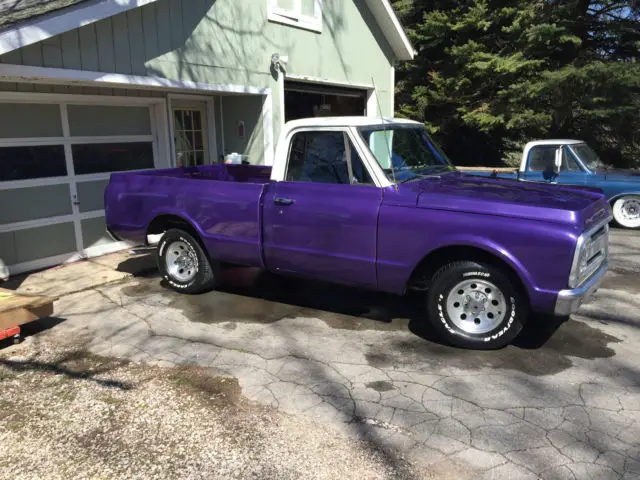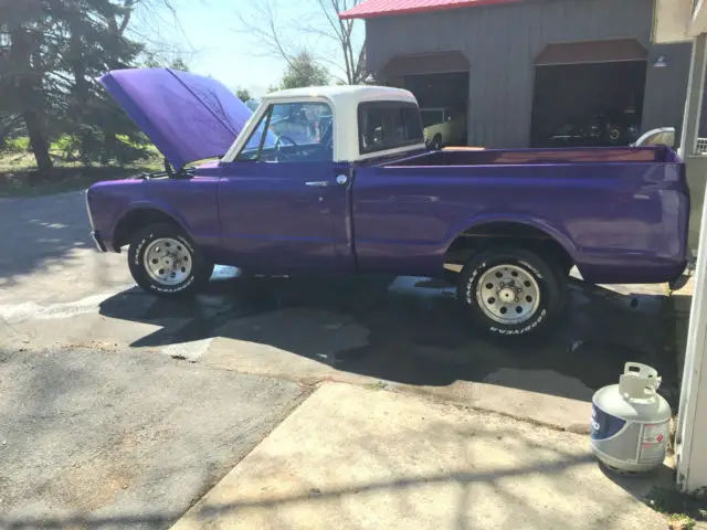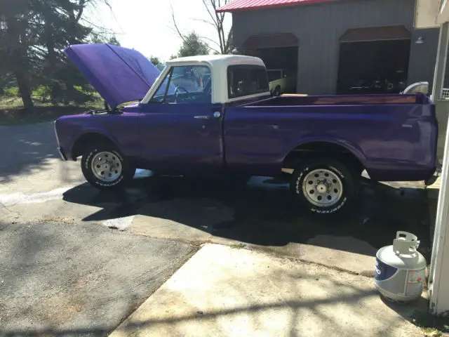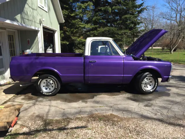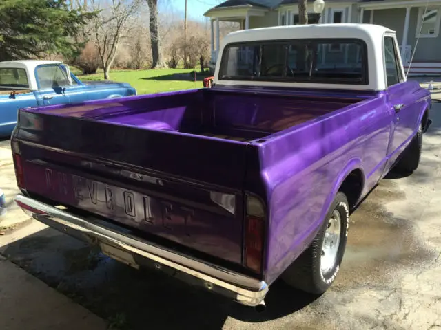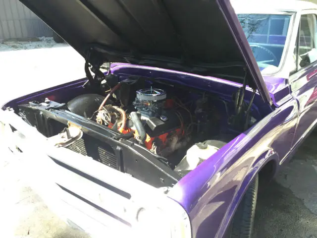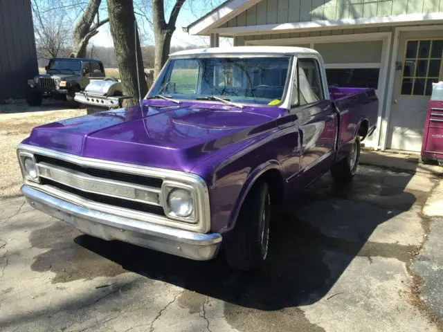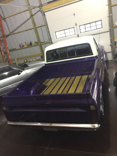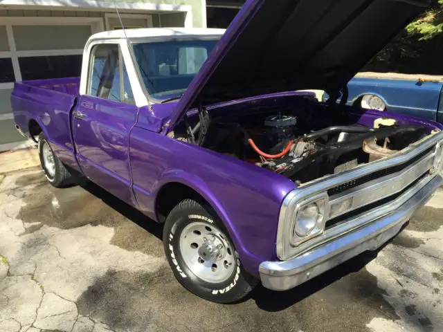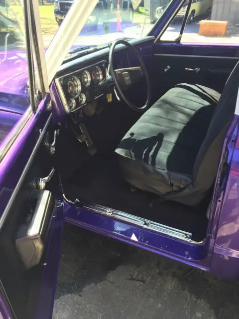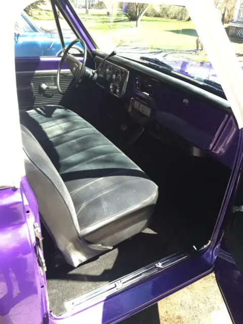 Up for sale is a great looking 1969 Chevrolet C10 short bed that has been made into a custom plum crazy gem. The body is super solid and straight. The custom paint has a deep shine to it and really shows off the solid body. The interior looks great as well with all new carpet, door panels, seat cover, headliner etc... The dash was also restored and looks very clean. The truck is powered by a nice 350 V8 MSD distributor, Edelbrock carb, and Flow Master mufflers. The engine starts right up and runs very strong, great running engine. The transmission is a TH400 automatic with the original 12 bolt rear axle housing 3.42 gears. Truck is very tight on the road and makes for a great driver. The wheels are 15" wheels. Truck is a head turner. Dose need a few trim pieces to be 100% complete. I am happy to take more photos or answer any question.