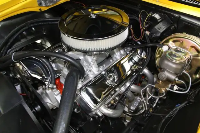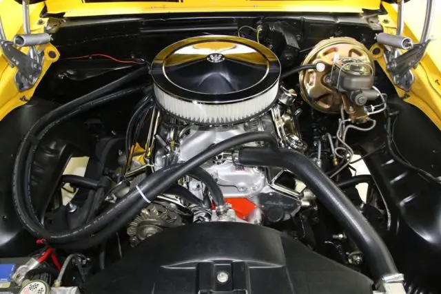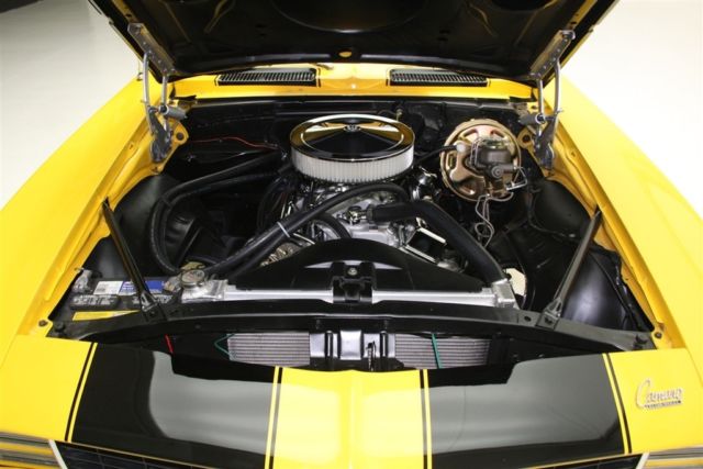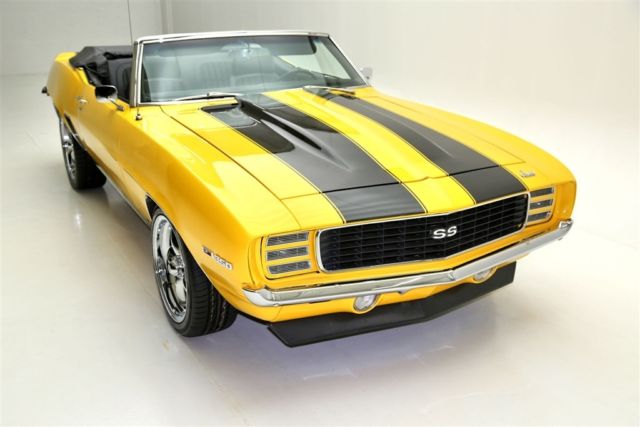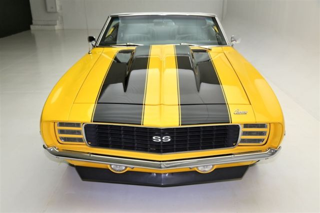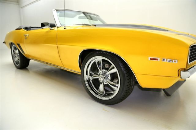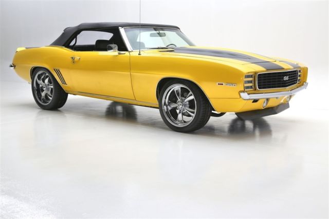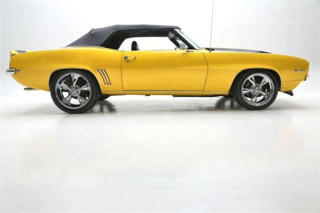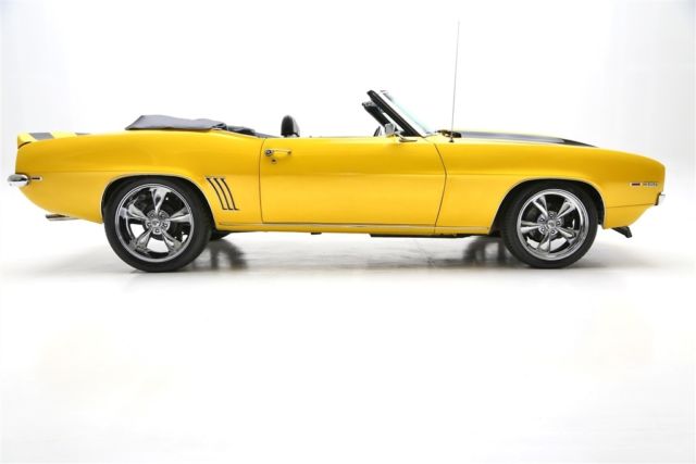 DAYTONA YELLOW 1969 CAMARO CONVERTIBLE WITH RALLY SPORT AND SUPER SPORT OPTIONS ADDED, SCREAMING YELLOW WITH BLACK SS STRIPES OVER THE COWL HOOD, RS HIDDEN HEADLIGHTS, ROLLING ON COY BLACK CHROME AND LOOKING GOOD. UNDER THE HOOD IS A BUILT 1969 350/425 HORSEPOWER ENGINE, BORED 30 OVER, 4 BOLT MAIN, EDELBROCK ALUMINUM HEADS, TOP END KIT,10:1 COMPRESSION 268 COMP CAM, ROLLER ROCKERS AND READY TO BURN RUBBER, LARGE SWAY BAR AND NEW CONTROL ARMS FOR BETTER HANDLING AND SLOTTED DRILLED ROTOR POWER DISC BRAKE TO CONTROL THE POWER, BLACK DELUXE BUCKET INTERIOR WITH CONSOLE AND WOOD GRAIN ACCENTS AND AN SS WHEEL. LAUNCHED BY A TCI 400 TRANSMISSION WITH NEW TCI TORQUE CONVERTER AND BACKED BY A 3.73 GEARED 10-BOLT POSI-TRACTION REAR END. THE CAR SOUNDS AMAZING WITH NEW CERAMIC COATED HEADERS AND FLOMASTER HEAVY DUTY EXHAUST.