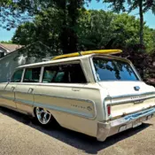 1964 Chevrolet Belair Wagon in putty with red interior. Rebuilt 283 with Mild Edelbrock top end kit (cam, intake, carb, Cylinder head springs) HEI distributor, aluminum radiator with electric fans. Front brakes were upgraded to power disc brakes, new drums and slave cylinders in rear. Air bag suspension front and rear with Vera Elite digital controller new shocks. Custom billet wheels 20" up front and 22" in rear. Interior and paint less than one year old. Looks sharp and turns lots of heads.